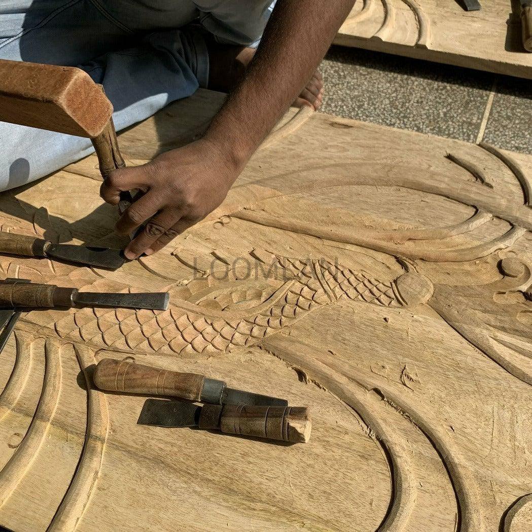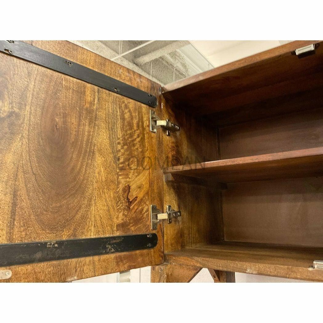 The buffet is made from solid mango wood and features a refined, water-resistant lacquer finish carefully applied by hand. Its structural frame is crafted from solid timber and boasts no artificial laminates, veneers, or bolt ons. This masterfully hand-carved cabinet is built to withstand the test of time, becoming a treasured heirloom and a valuable antique for future generations. Fixed shelves behind three intricately detailed doors offer ample storage space, making this cabinet both functional.