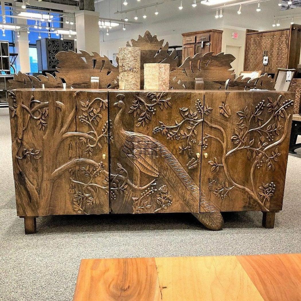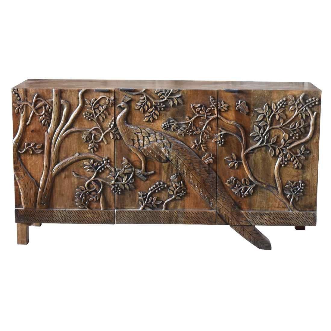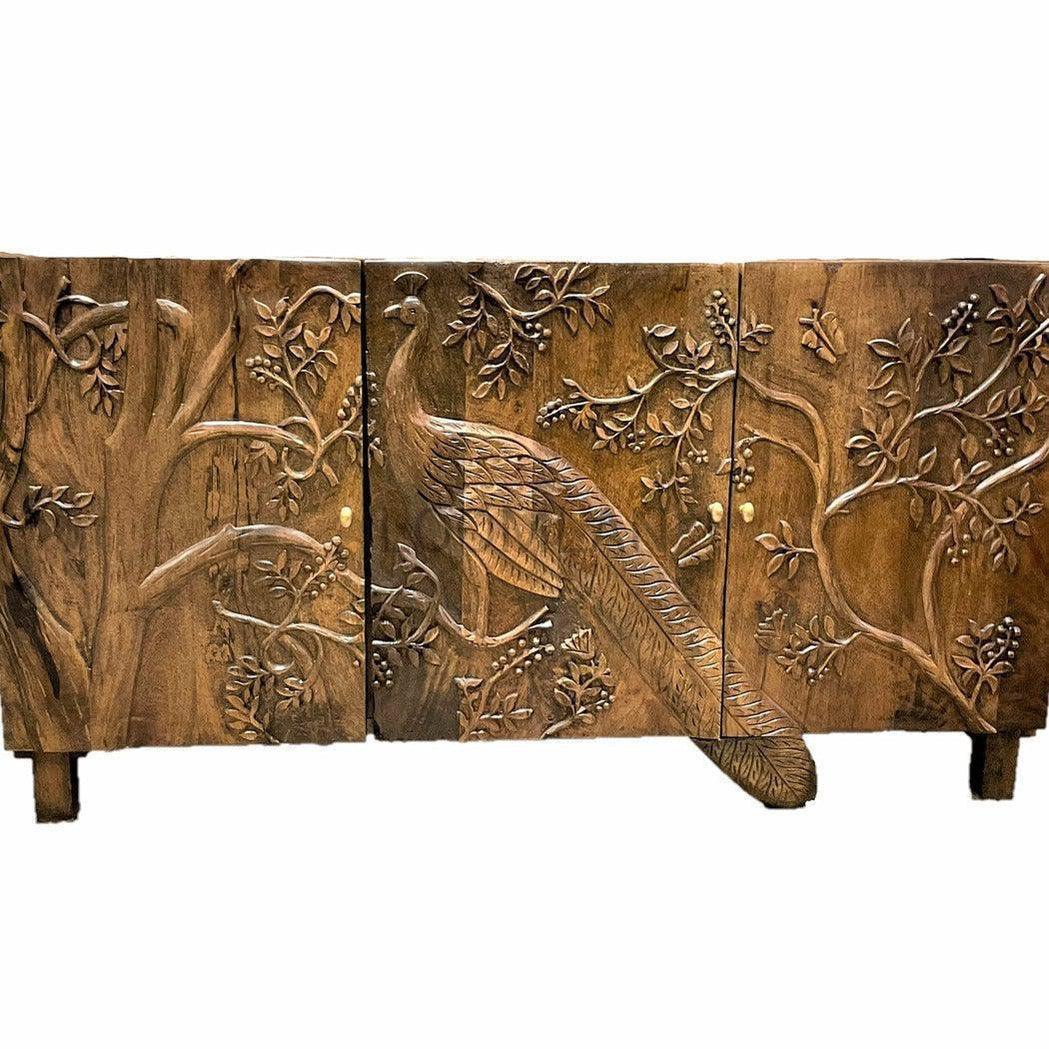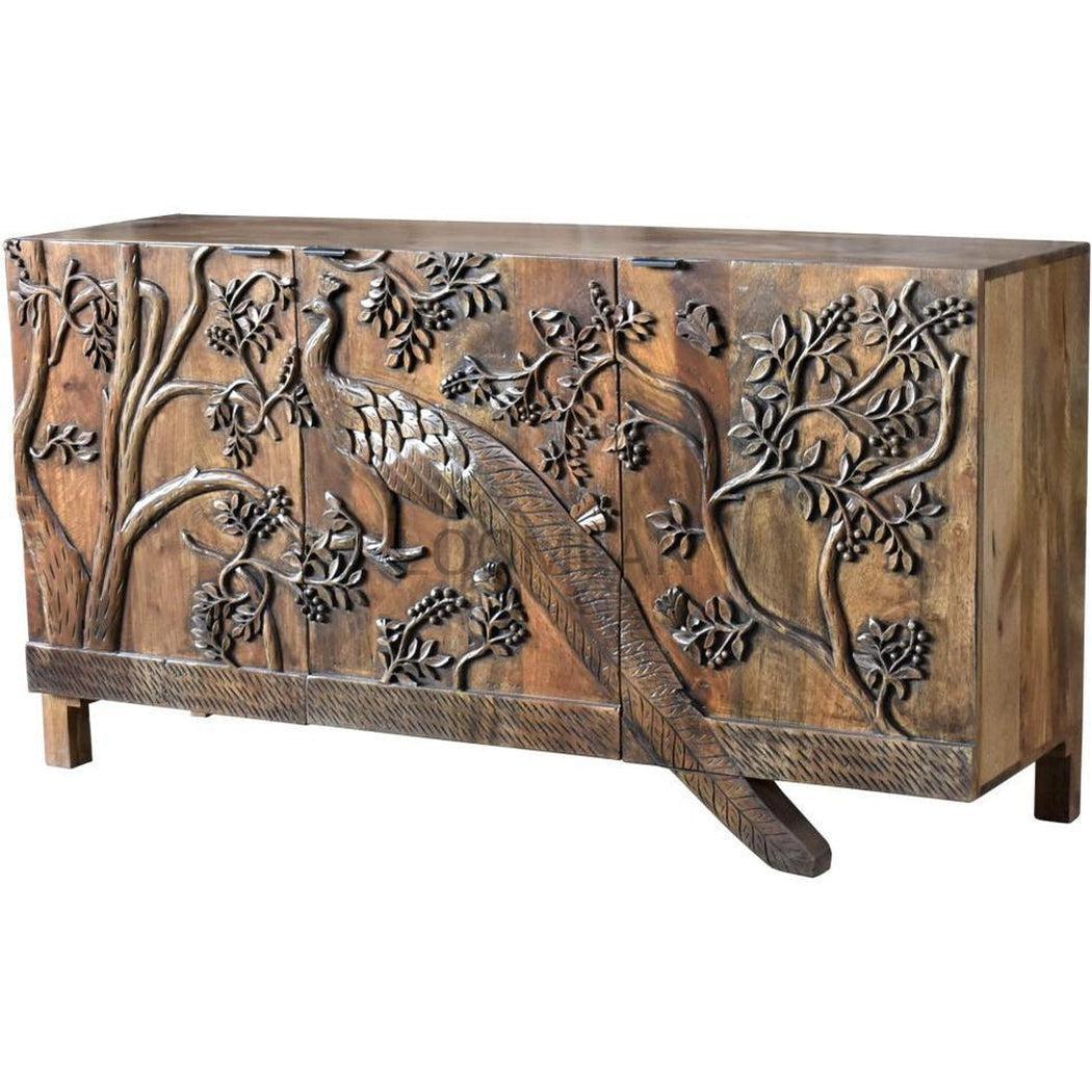 Enhance your living space with Mother Nature's elegance through our Mother Nature 60" Sideboard. This one-of-a-kind piece boasts exquisitely hand-carved peacock bird doors and a fourth leg crafted from the bird's tail. Made from solid mango wood and finished with a low-sheen water-resistant lacquer, this cabinet is a masterpiece of expert craftsmanship that will surely withstand the test of time. A must-have for any luxurious home, this unique sideboard cabinet brings the beauty of nature straight into your interiors. Featuring highly detailed hand-carved peacock bird and botanical motifs on solid wood doors, this buffet also boasts the bird's majestic tail as its fourth leg, adding an unexpected touch to its design.