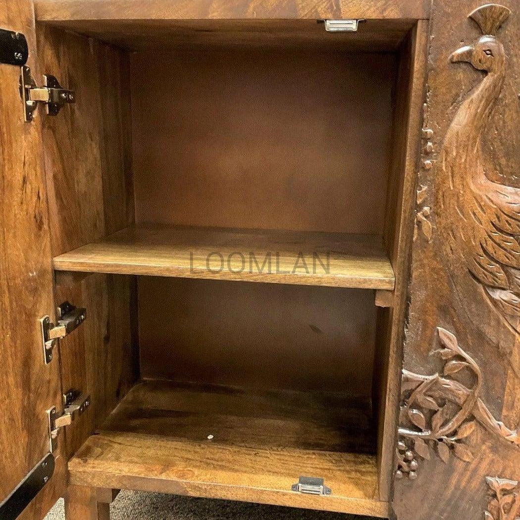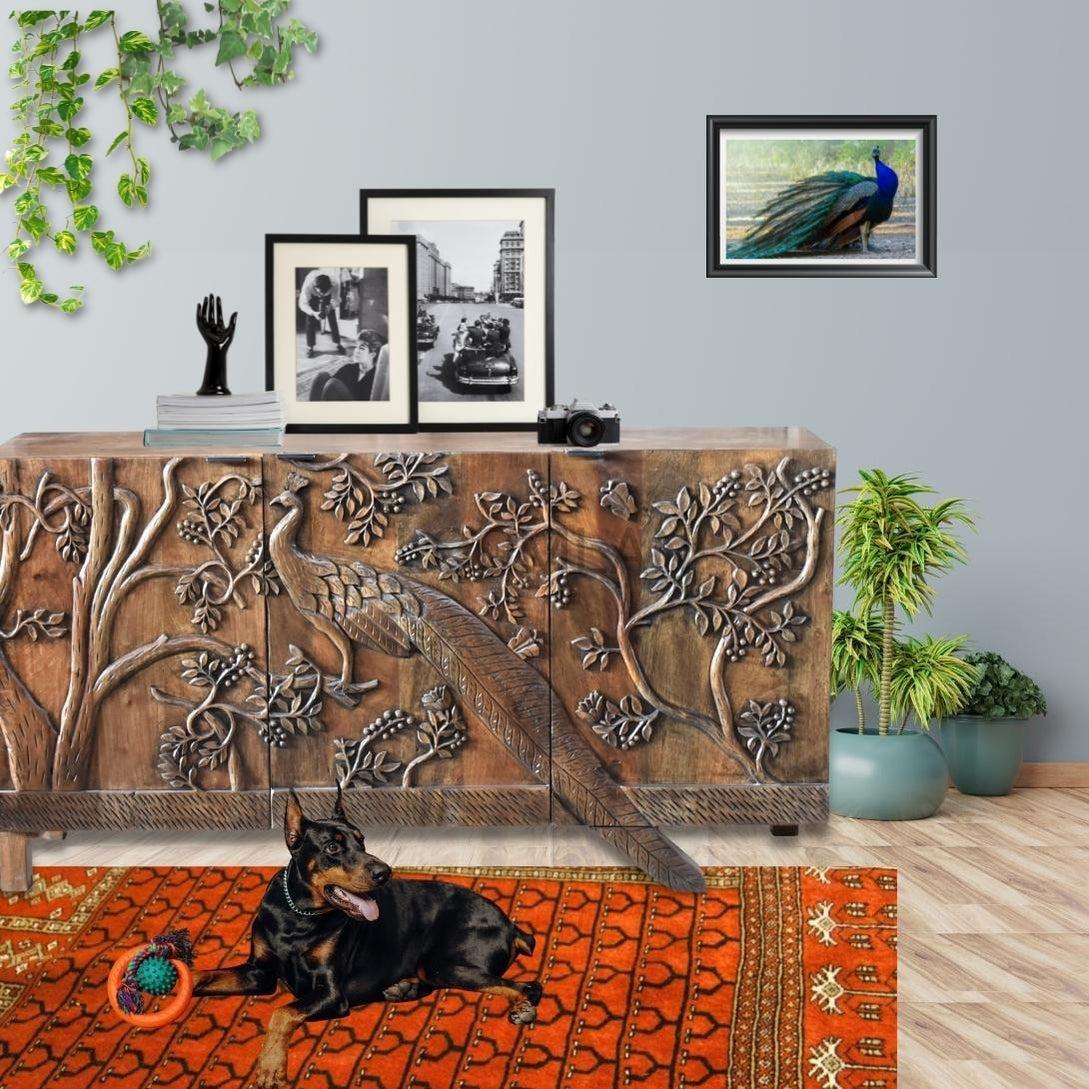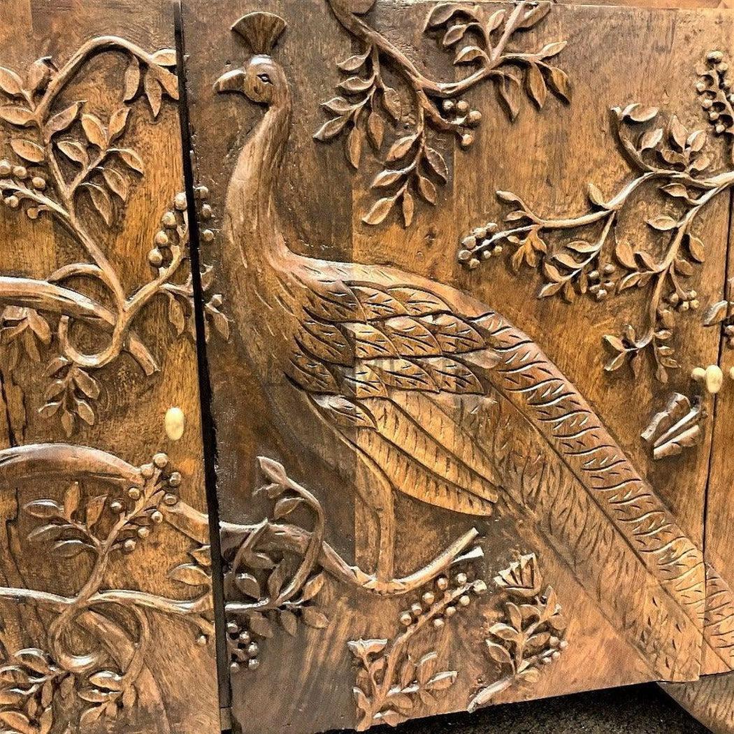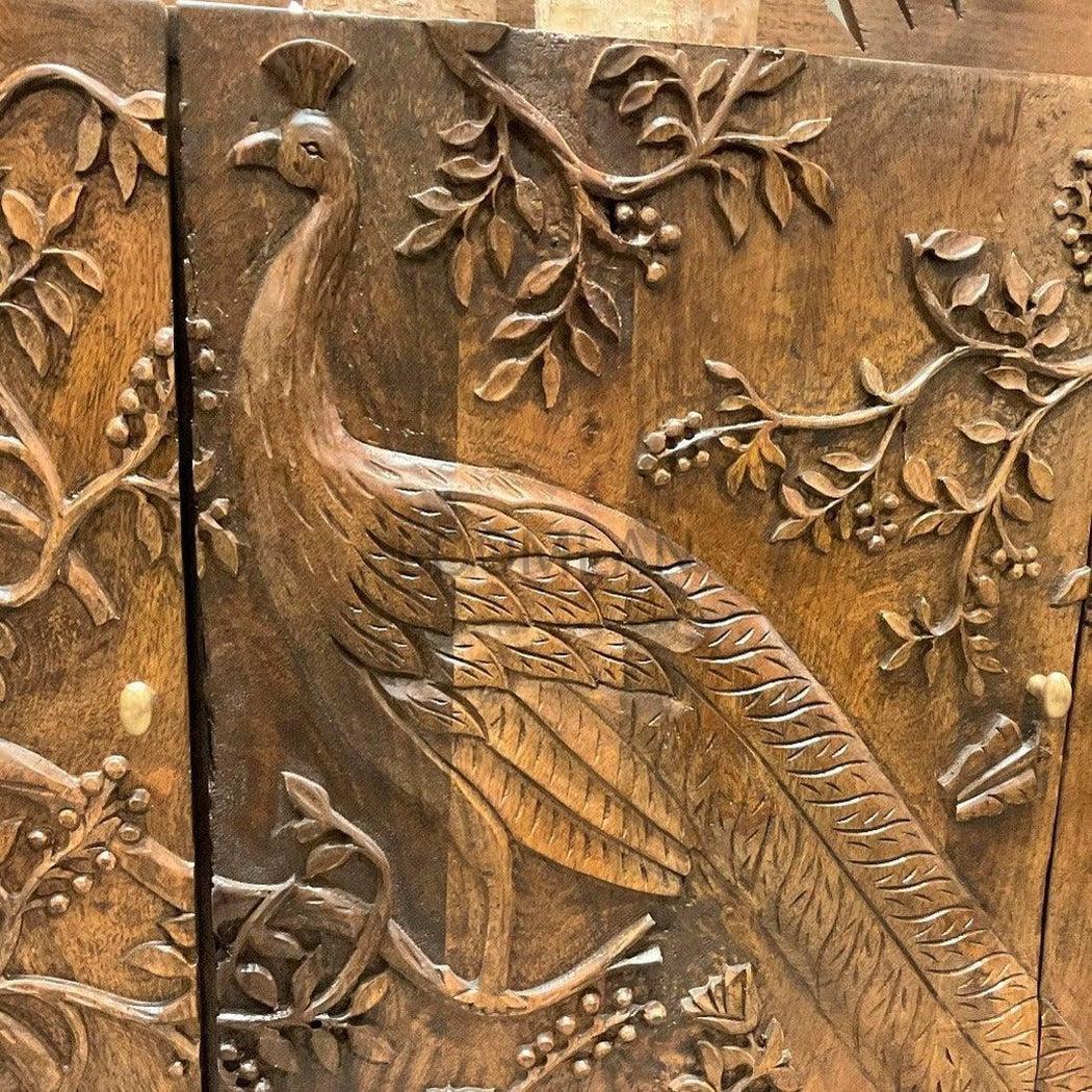Enhance your living space with Mother Nature's elegance through our Mother Nature 60" Sideboard. This one-of-a-kind piece boasts exquisitely hand-carved peacock bird doors and a fourth leg crafted from the bird's tail. Made from solid mango wood and finished with a low-sheen water-resistant lacquer, this cabinet is a masterpiece of expert craftsmanship that will surely withstand the test of time. A must-have for any luxurious home, this unique sideboard cabinet brings the beauty of nature straight into your interiors. Featuring highly detailed hand-carved peacock bird and botanical motifs on solid wood doors, this buffet also boasts the bird's majestic tail as its fourth leg, adding an unexpected touch to its design.