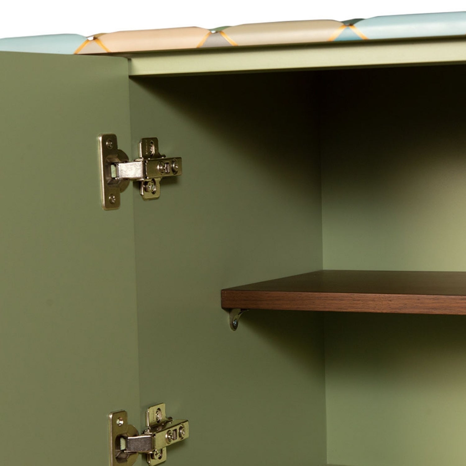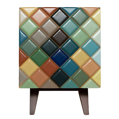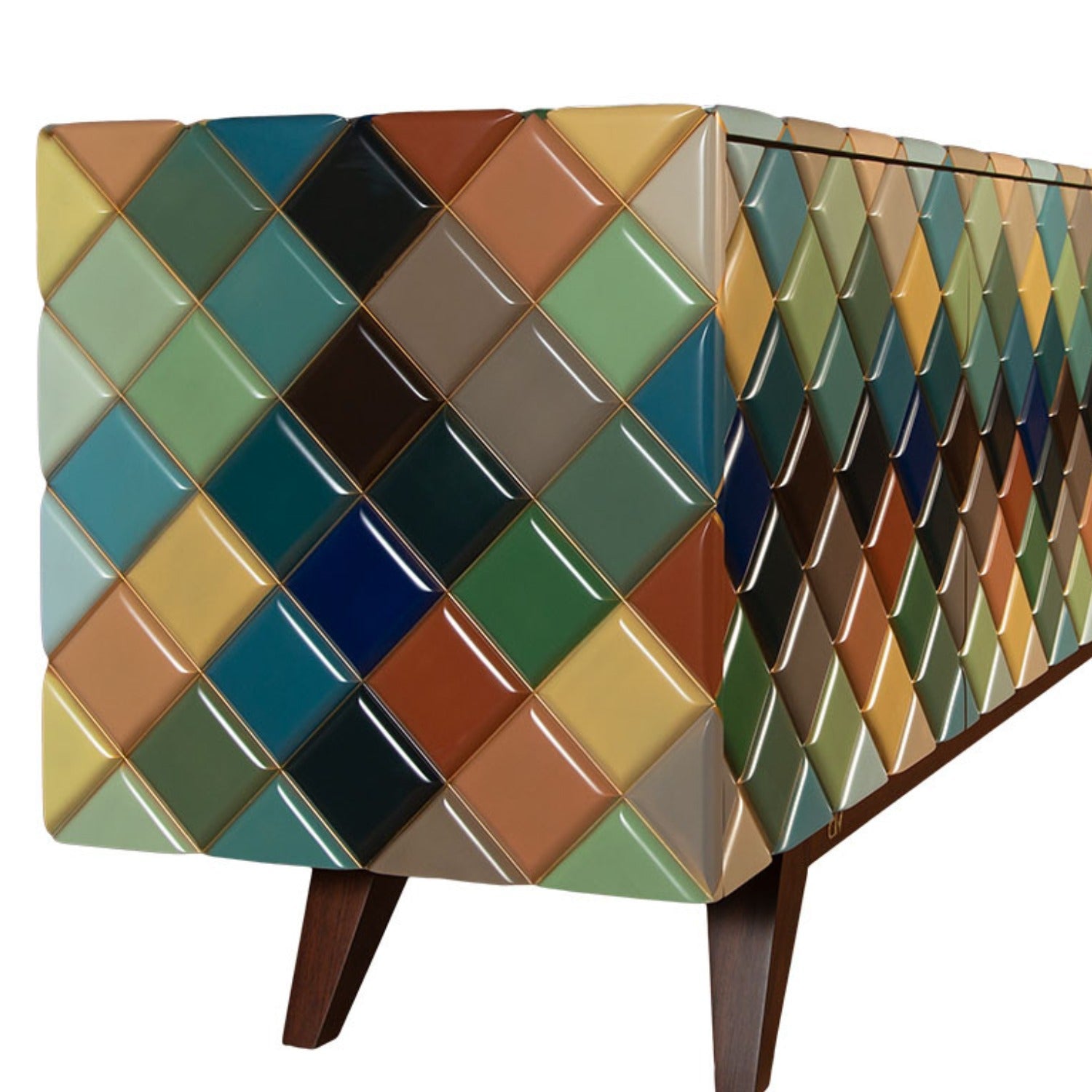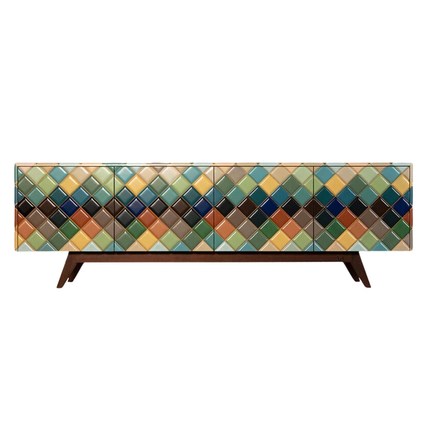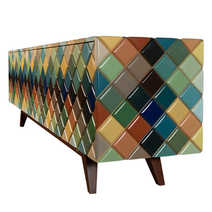 The exquisite rhombus shapes and vivid semi-matte gloss finish create a vibrant yet sophisticated atmosphere, while the hand-painted detail adds exclusive beauty to the design. Enjoy the timeless elegance of Multicolor Rainbow Diamond Wood Sideboard for Dining Room or TV Stand.
