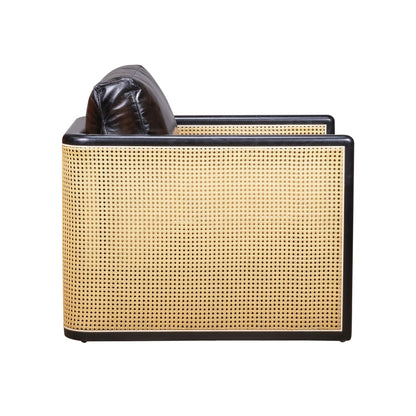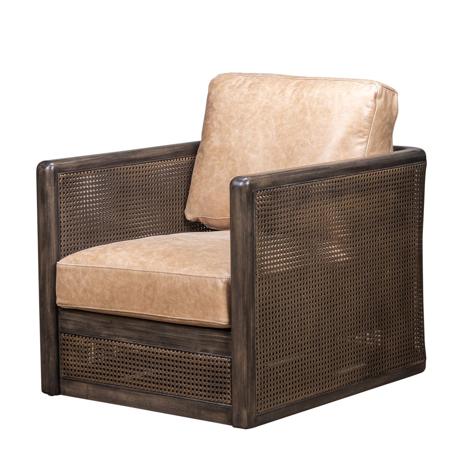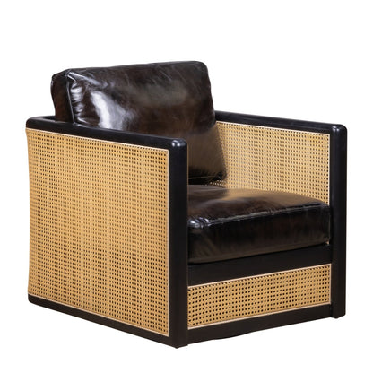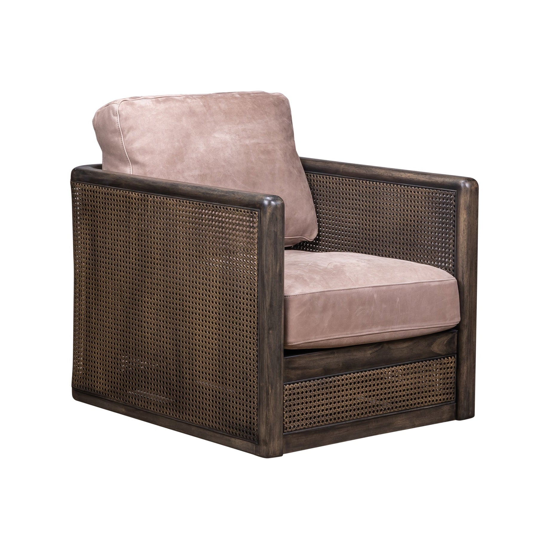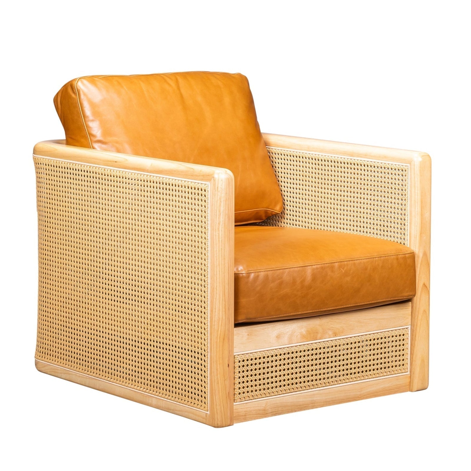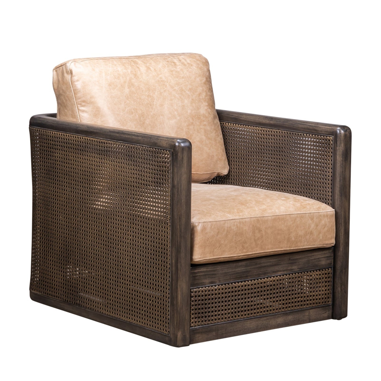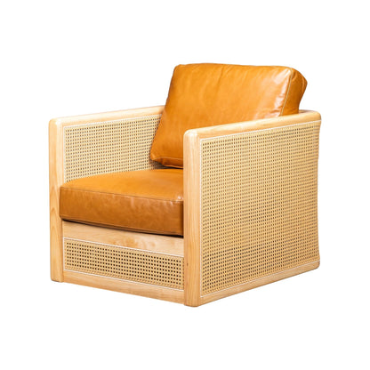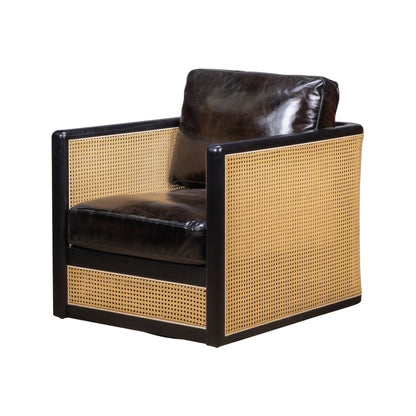 Crafted with a sturdy swivel frame, this chair is upholstered in luxurious leather and features unique cane detailing, combining modern design with mid-century influences. Its fiber and feather mix seat construction ensures superior comfort, while the square shape and rattan side panels add texture and visual interest. Designed for both style and function, the arm height is perfectly positioned to offer comfort and support during extended periods of use.