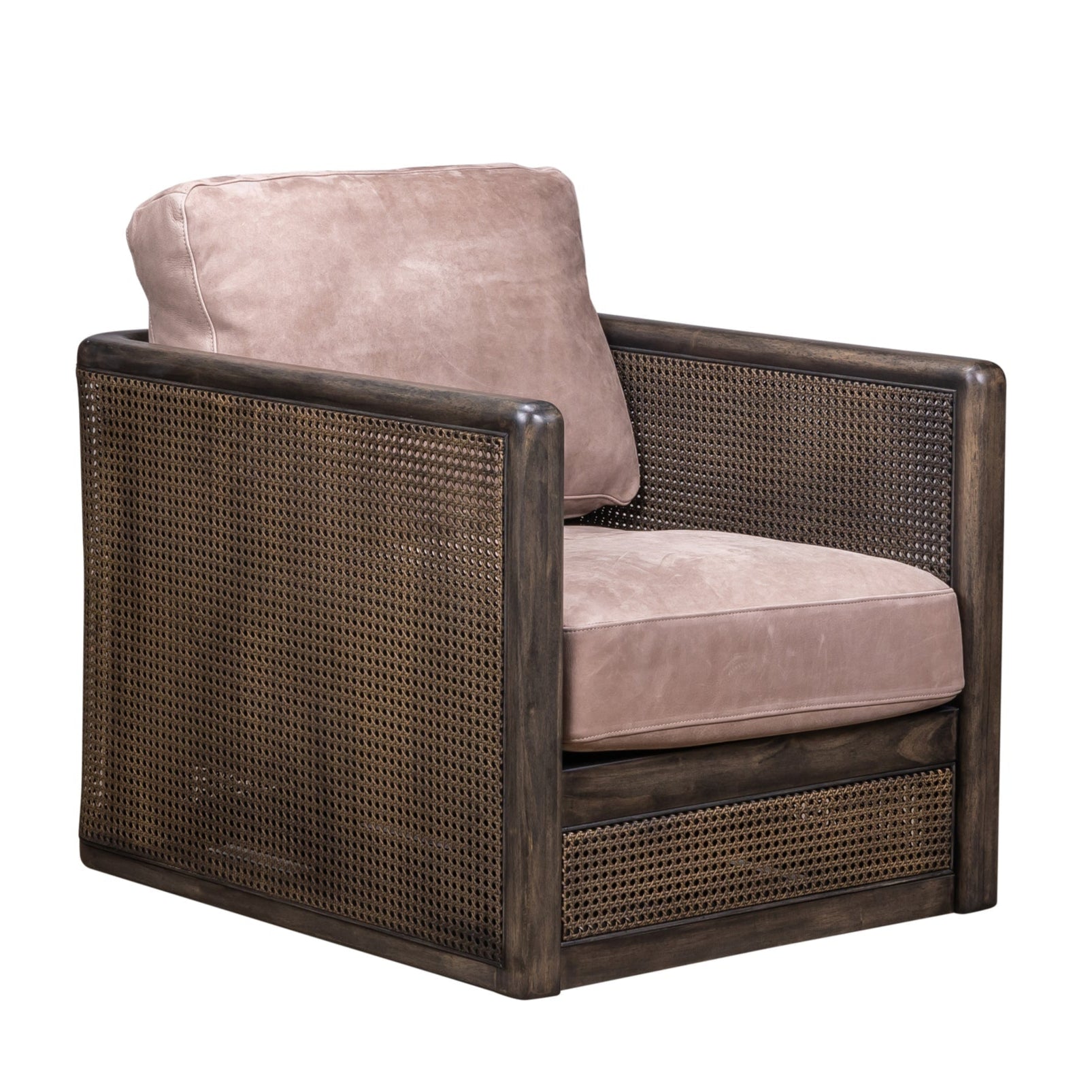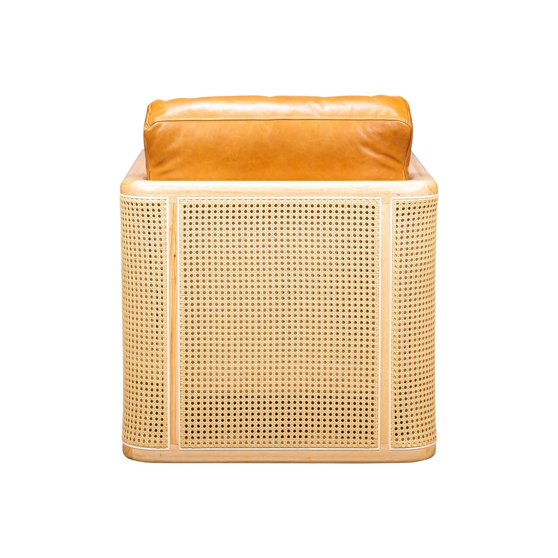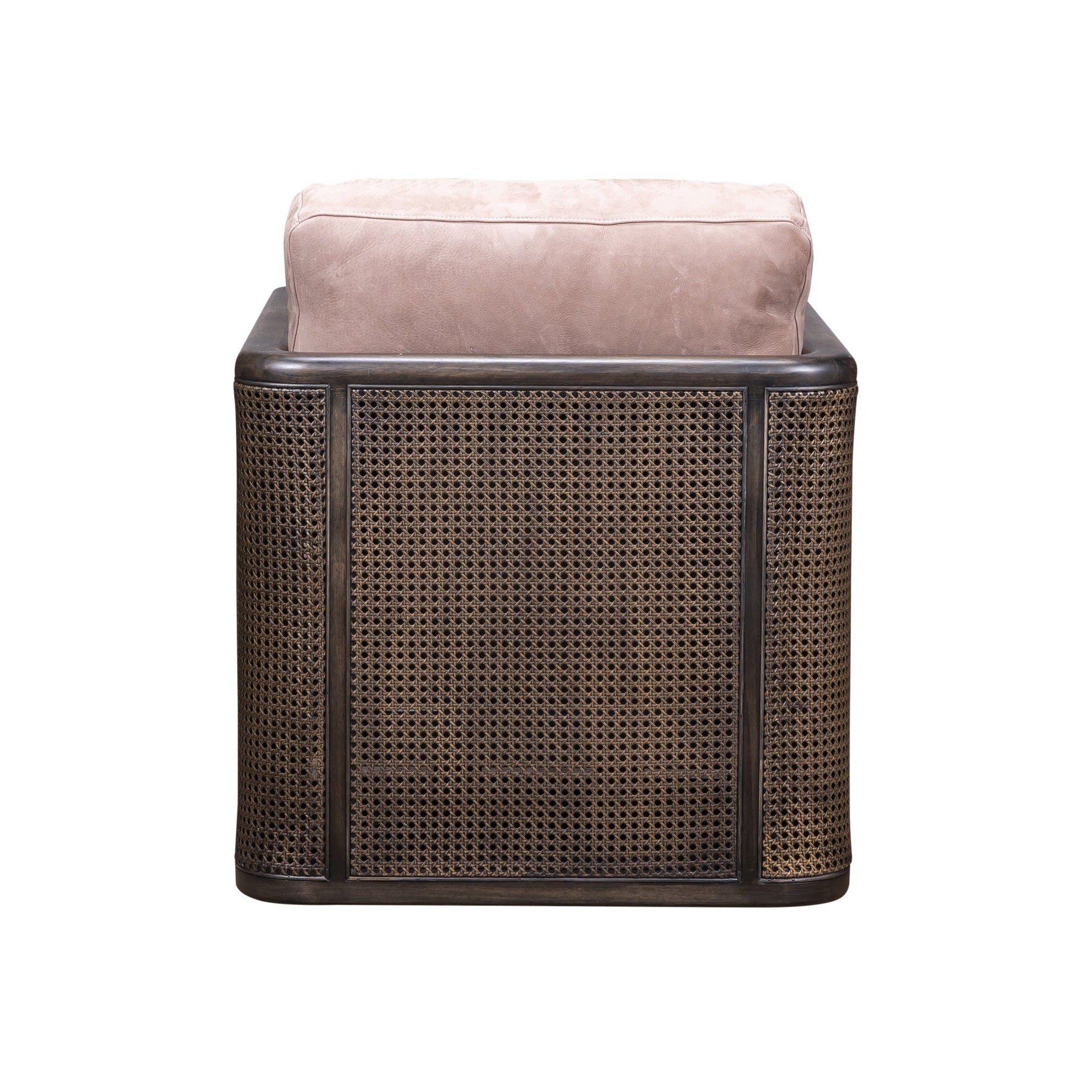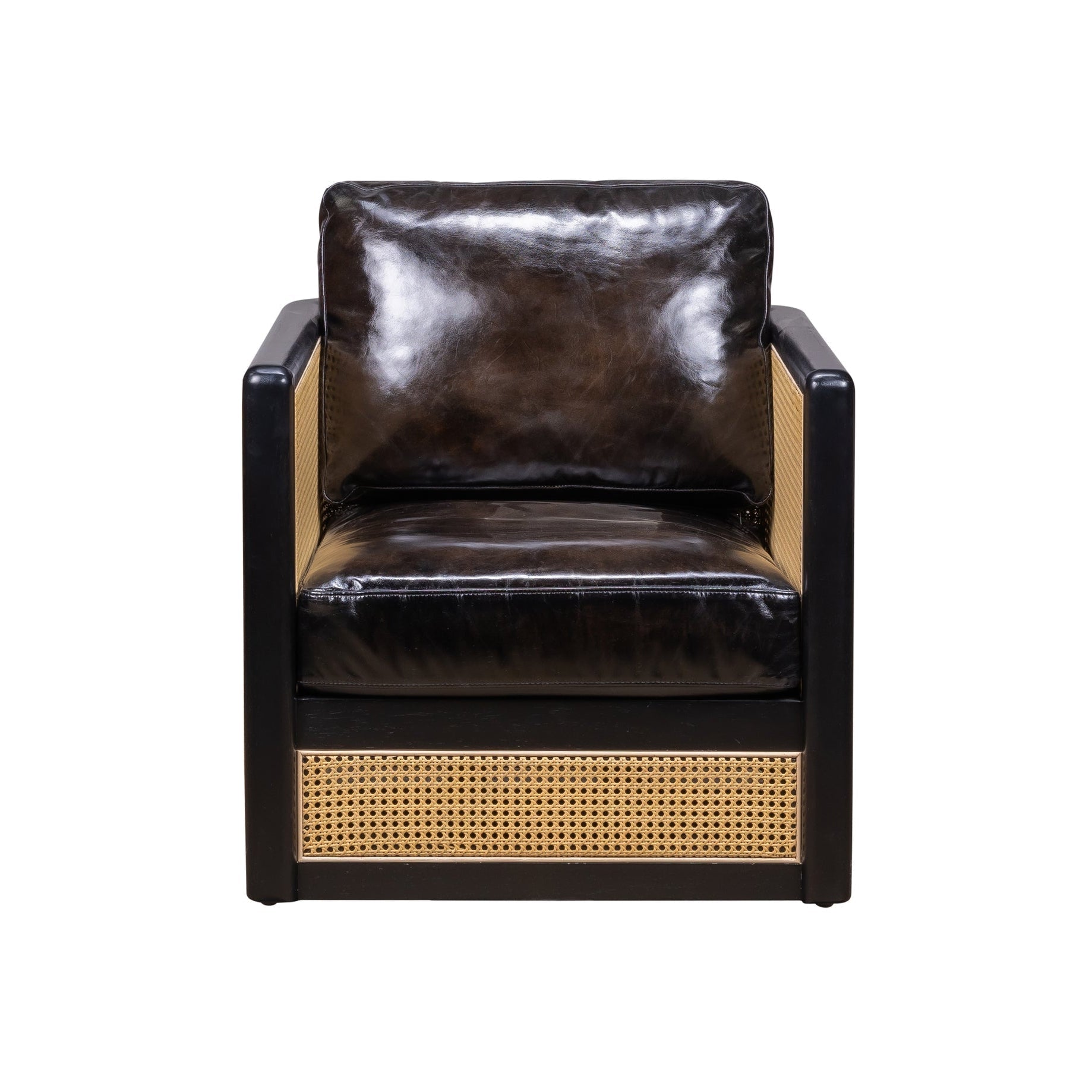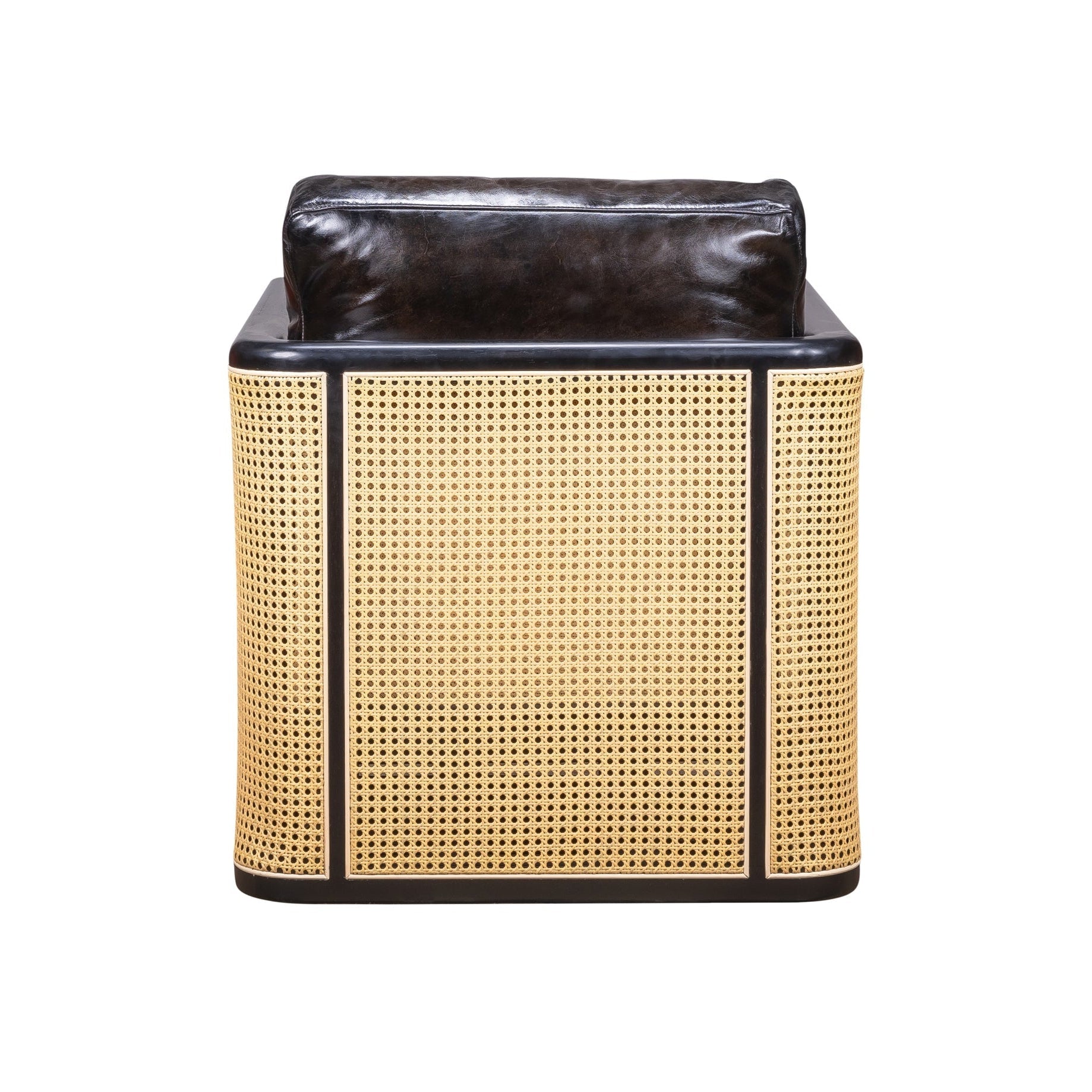 Crafted with a sturdy swivel frame, this chair is upholstered in luxurious leather and features unique cane detailing, combining modern design with mid-century influences. Its fiber and feather mix seat construction ensures superior comfort, while the square shape and rattan side panels add texture and visual interest. Designed for both style and function, the arm height is perfectly positioned to offer comfort and support during extended periods of use.