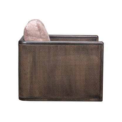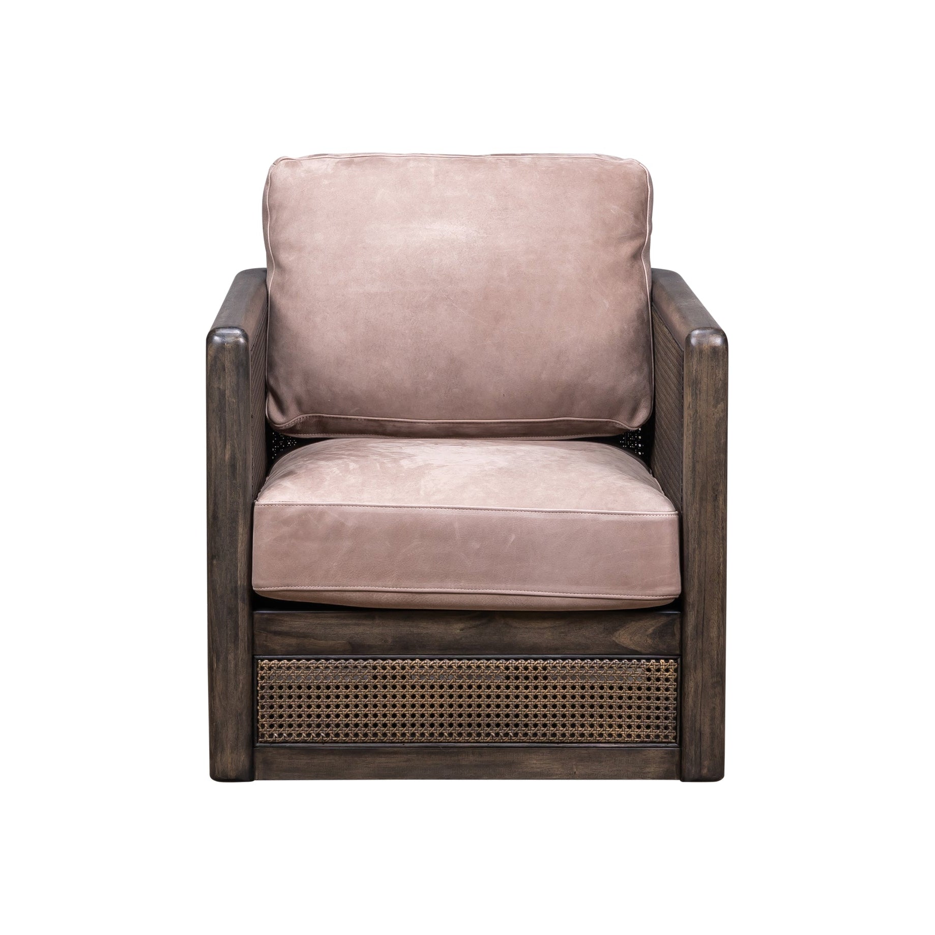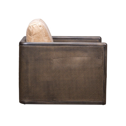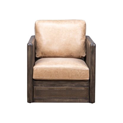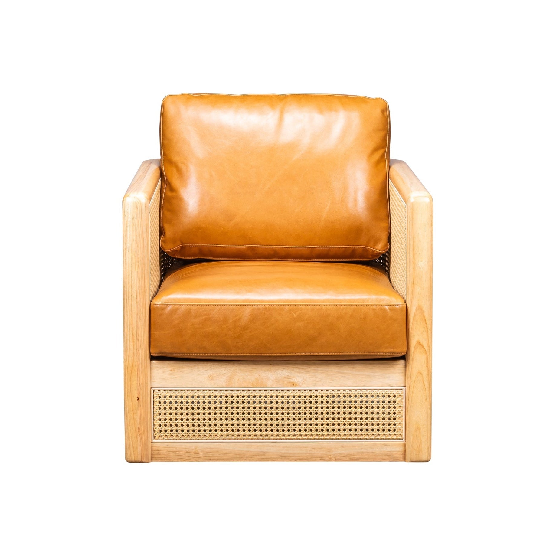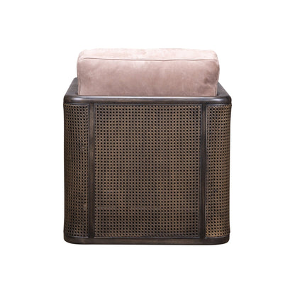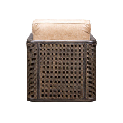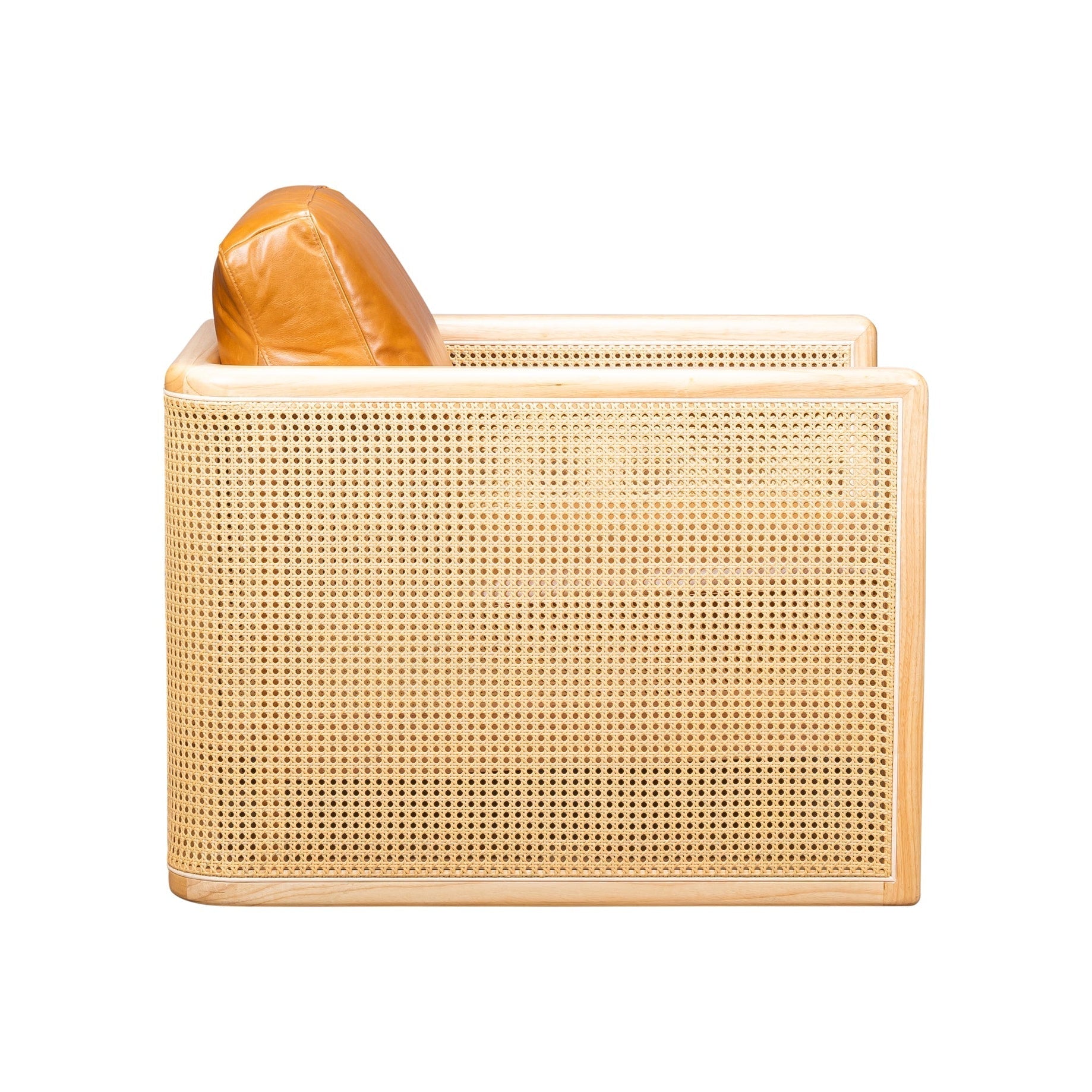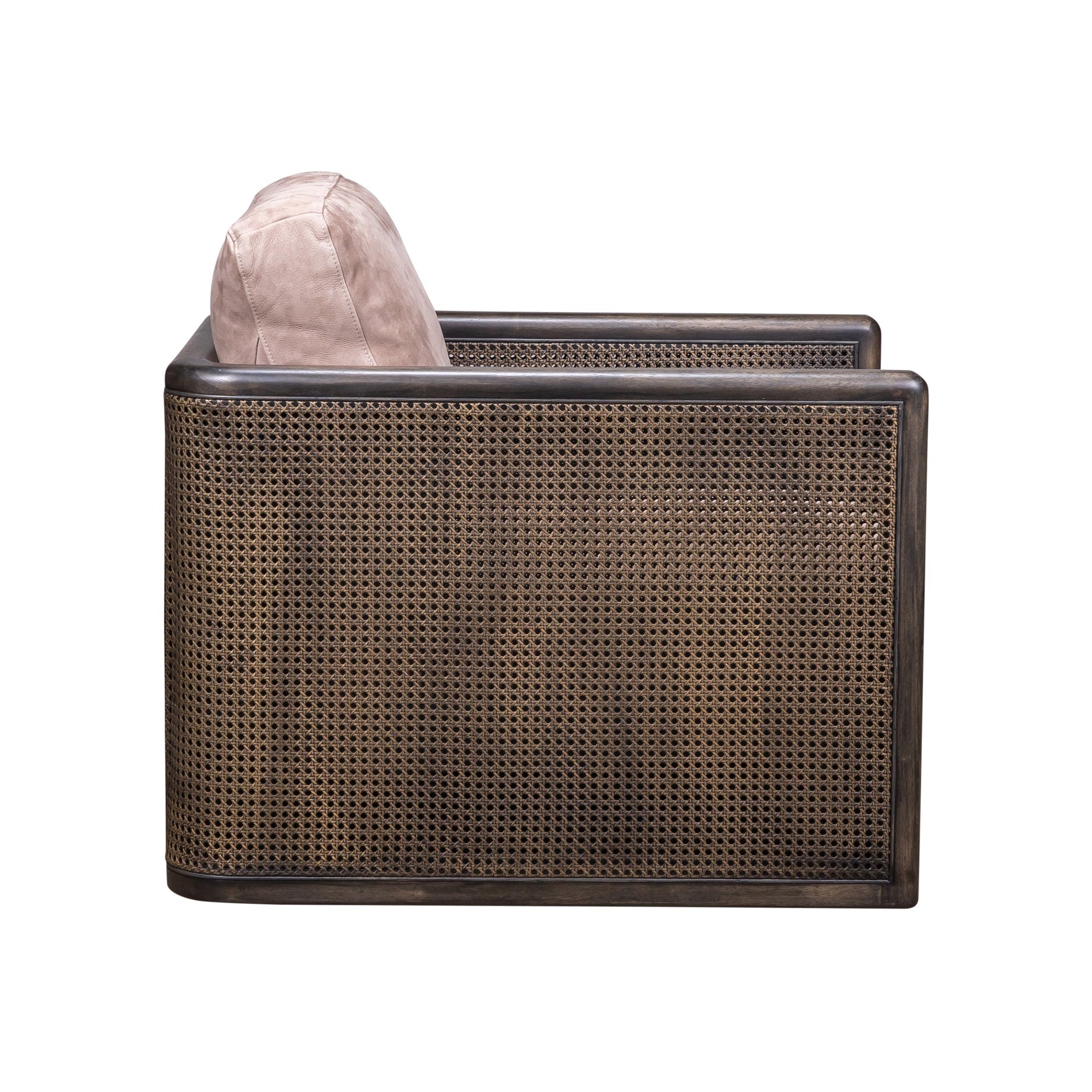 Crafted with a sturdy swivel frame, this chair is upholstered in luxurious leather and features unique cane detailing, combining modern design with mid-century influences. Its fiber and feather mix seat construction ensures superior comfort, while the square shape and rattan side panels add texture and visual interest. Designed for both style and function, the arm height is perfectly positioned to offer comfort and support during extended periods of use.