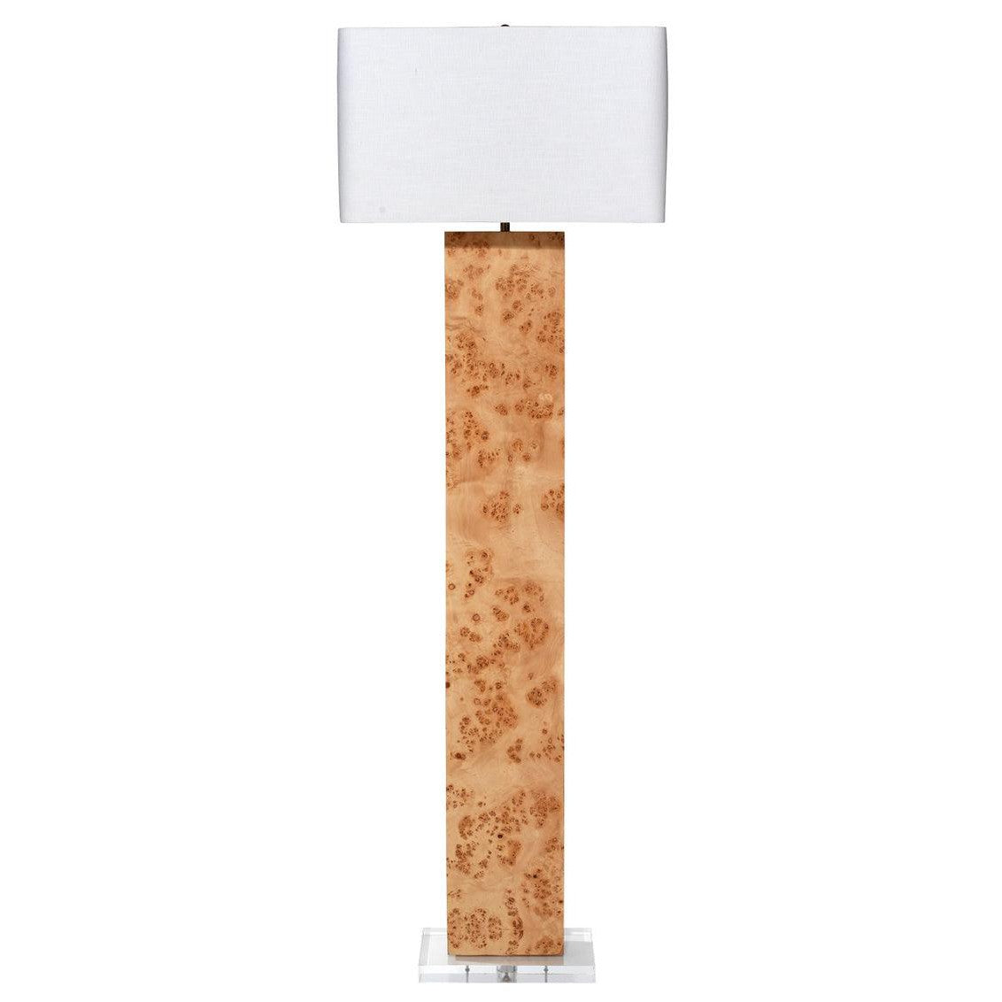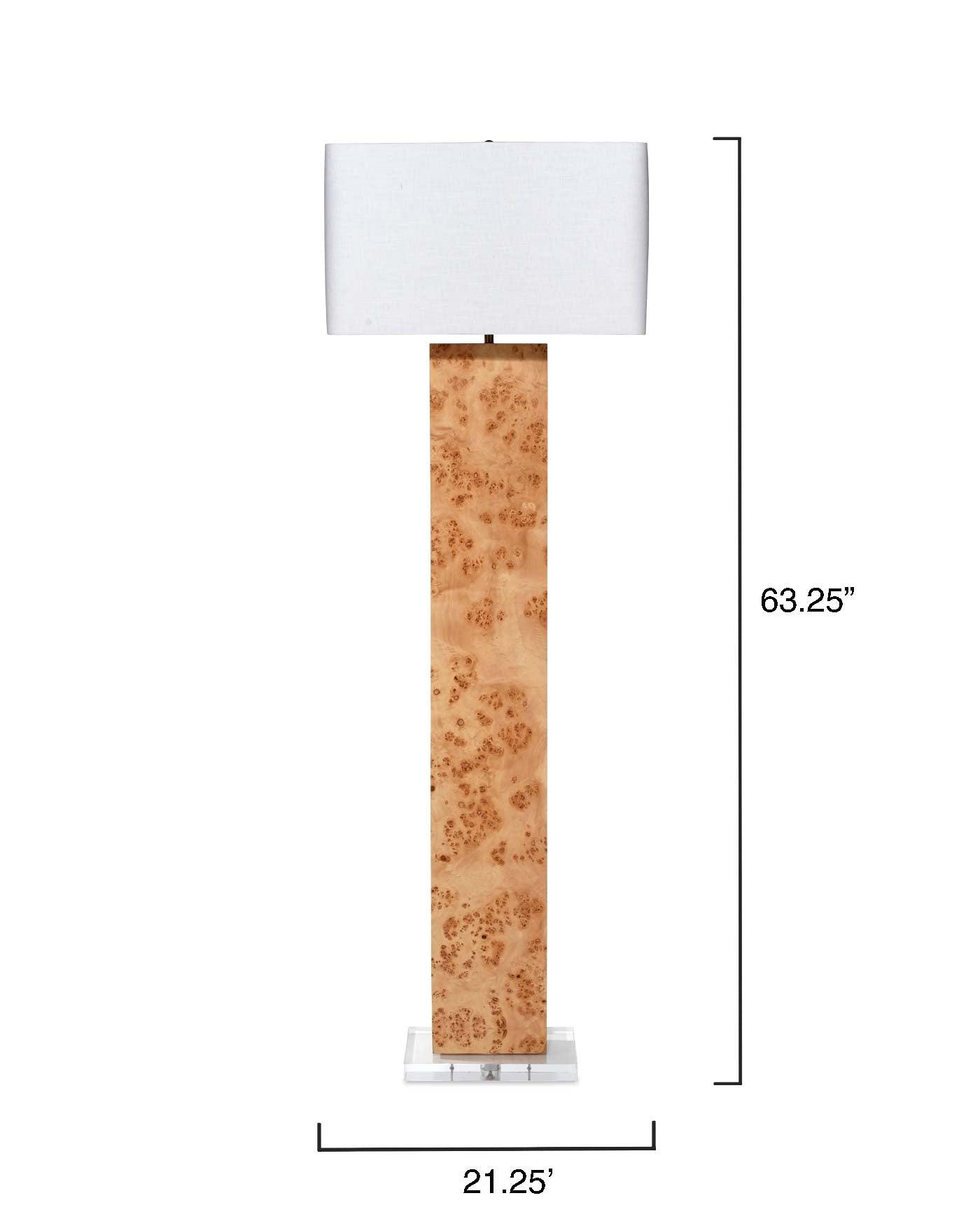Magically melding Natural burl wood with Modern materials, this evocative table lamp manages to be both Modern and timeless. From top to bottom: a square cylinder acrylic finial, a white linen rectangle shade with softly rounded corners, and a burnished base that embraces the beauty of the Natural wood. It all rests upon a rectangle of clear acrylic.