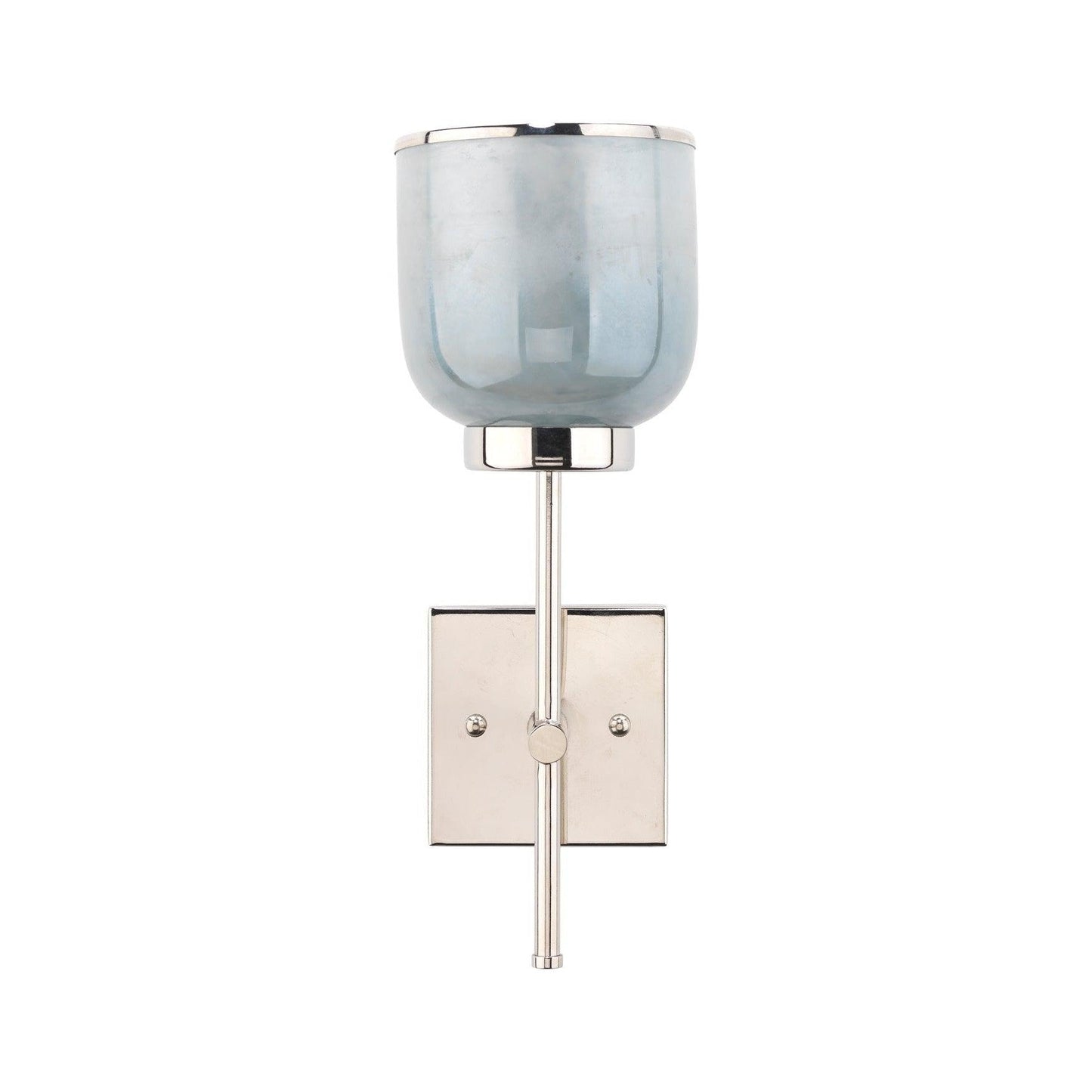 Inspired by the soft glow of fog shimmering in the afternoon sun, the Aqua Metallic Glass Vapor Single Sconce creates a mesmerizing ombre effect when illuminated. Crafted from hand-blown metallic glass, each piece carries unique variations that make it truly one of a kind. Designed with the versatility to be mounted facing upward or downward, this sconce is available with an antique brass and aqua glass finish or a nickel and aqua glass finish, both complemented by a refined brass backplate. Its transitional design and artistic finish make it a striking addition to any space.
