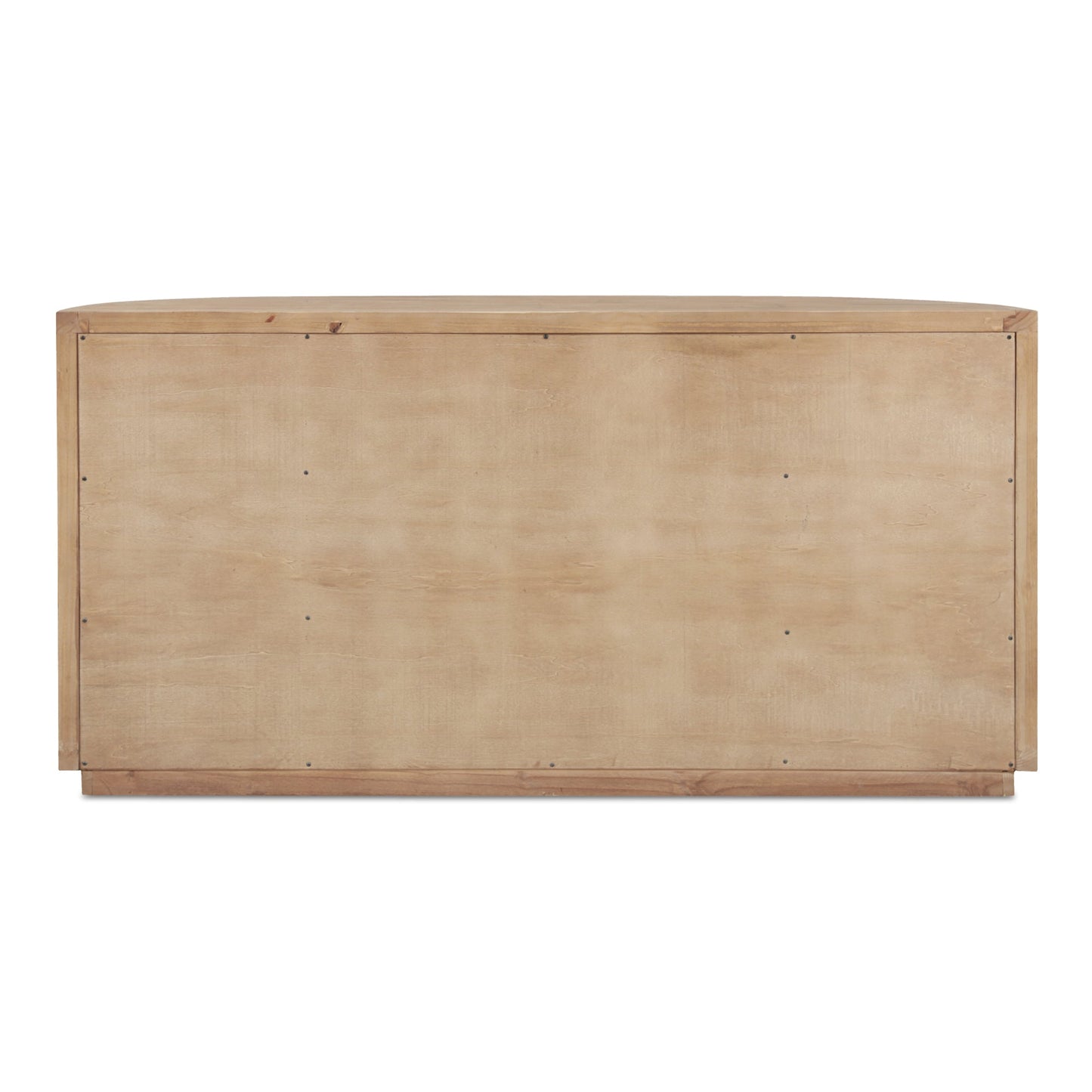 Rustic charm and contemporary design come together through reclaimed pine in this sideboard. Featuring curved doors that soften its texture, the Nicola Sideboard Natural brings a unique touch to any room. Its contemporary recessed base contrasts with the rustic wood, offering a modern silhouette ideal for transitional spaces. The simple handle detail accentuates the curved design, adding a stylish element that draws attention. With generous storage inside, it perfectly holds your essentials, be it in the dining room or living area. The reclaimed pine material not only gives it a timeless look but also ensures durability and eco-friendliness. No assembly is required, making it a hassle-free addition to your home.