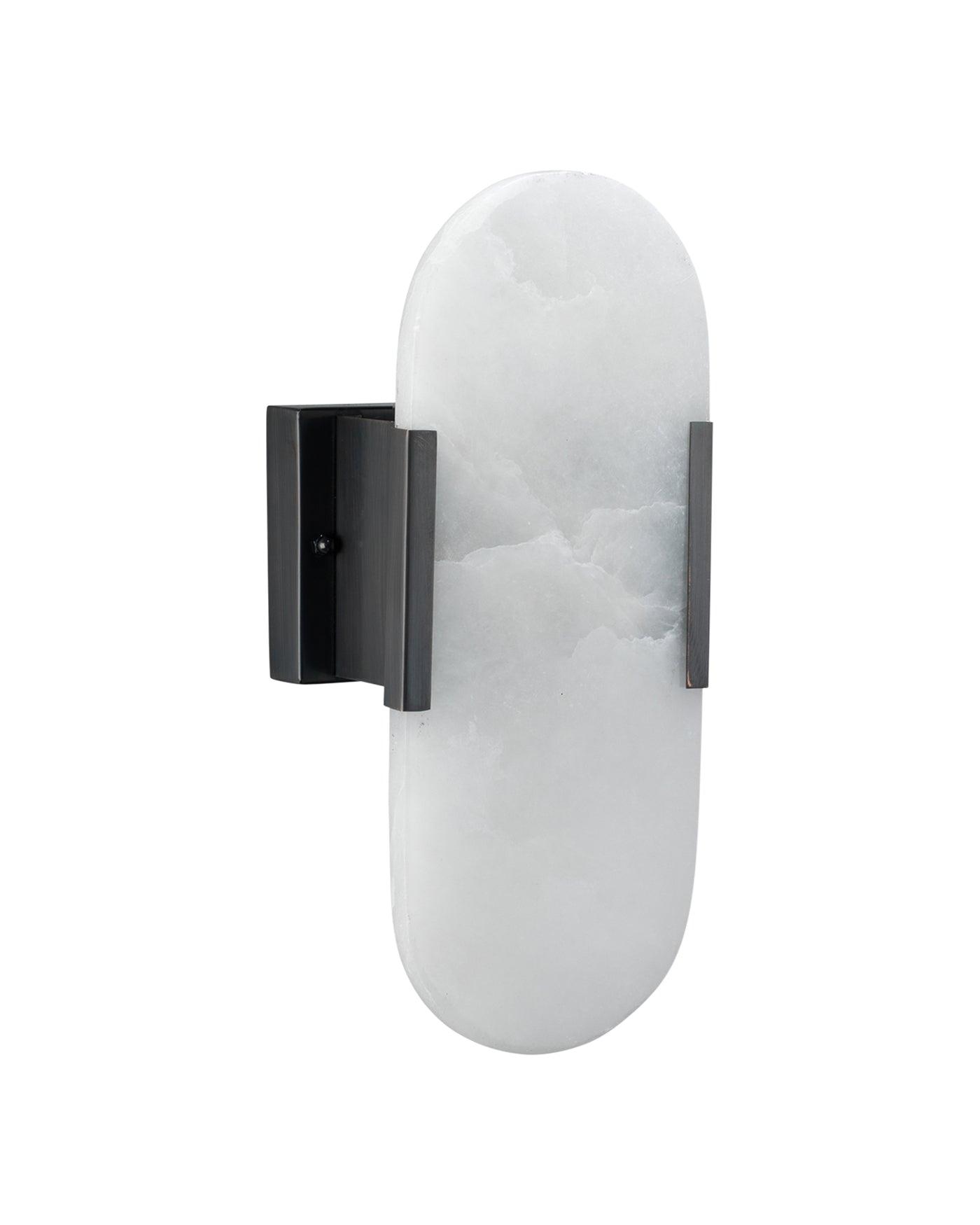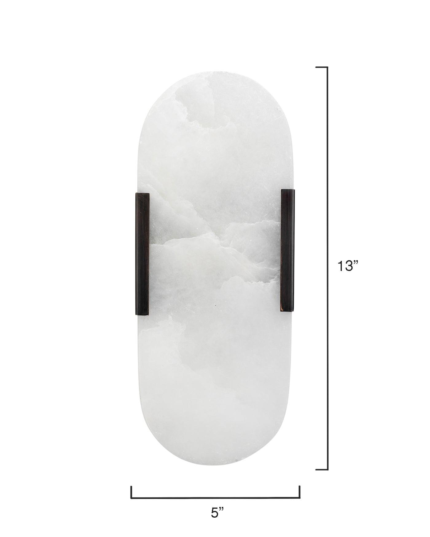 Enhance your home with the Delphi Wall Sconce, featuring a sleek alabaster panel that floats gracefully against the wall to showcase its natural veining and subtle striations. Available with either an antique brass or oil-rubbed bronze backplate, this sconce highlights the beauty of natural alabaster stone, making each piece unique with individual variations in color and pattern. The refined blend of alabaster and steel creates a sophisticated look that brings both luxury and warmth to your interior. Designed to be versatile, it can be mounted vertically or horizontally, making it a striking choice for modern spaces while providing a soft, enchanting glow. Each handcrafted piece is one-of-a-kind, adding exclusive character to any room.