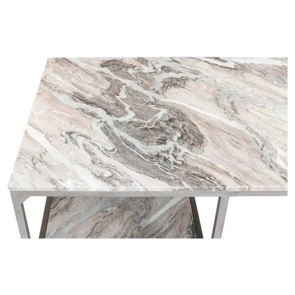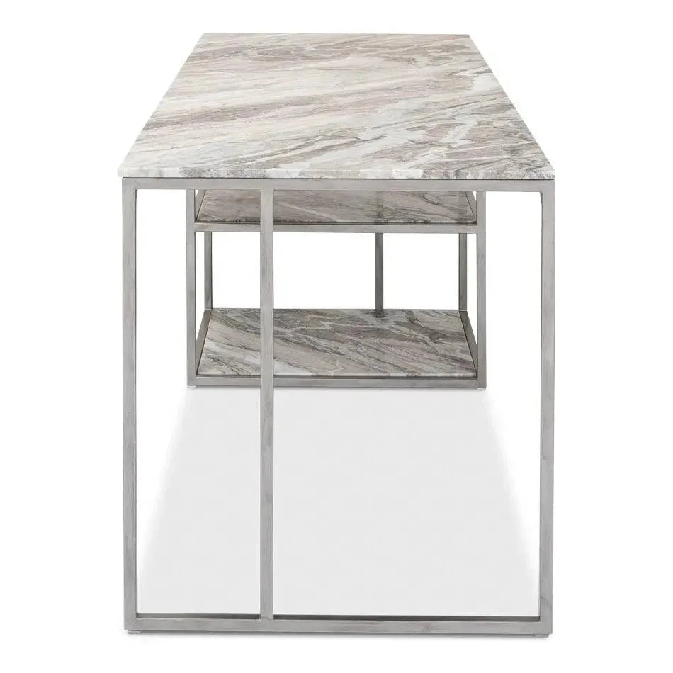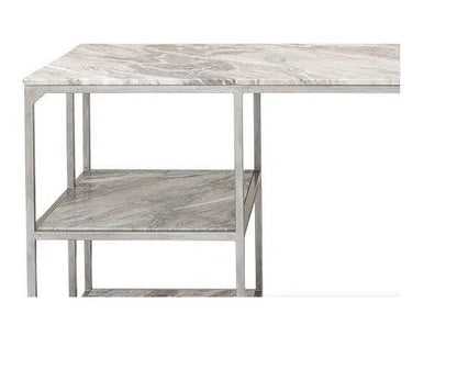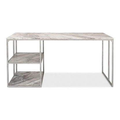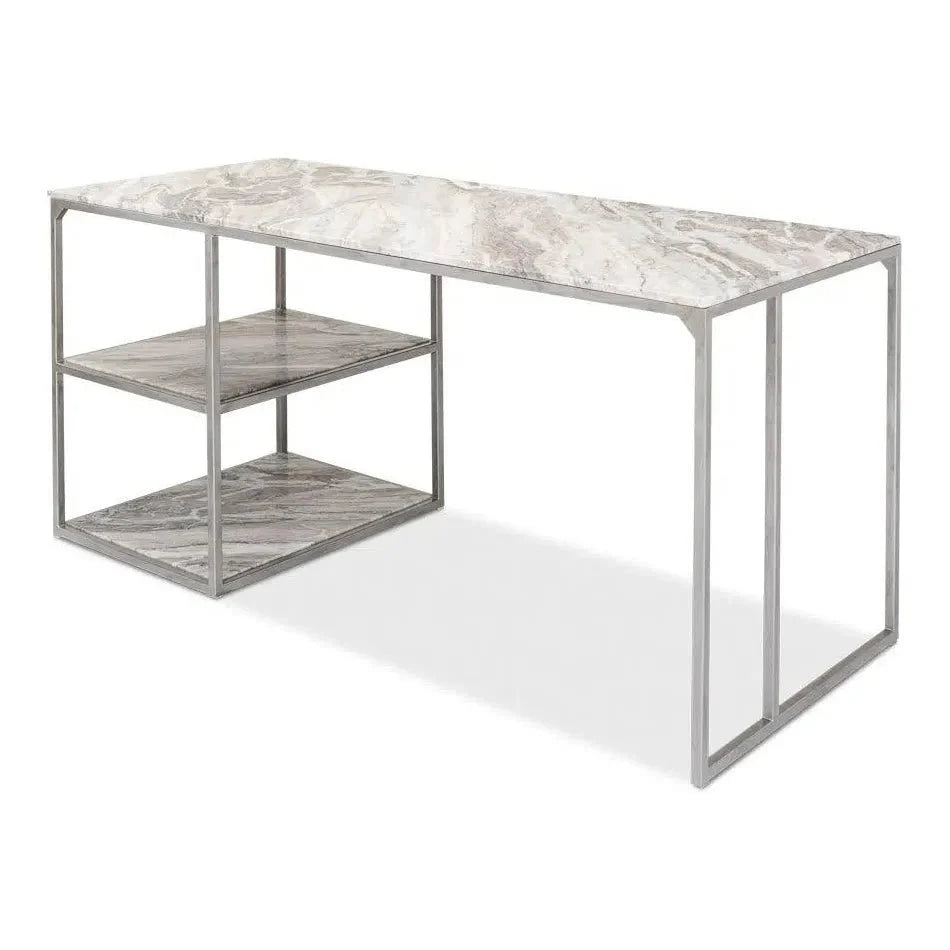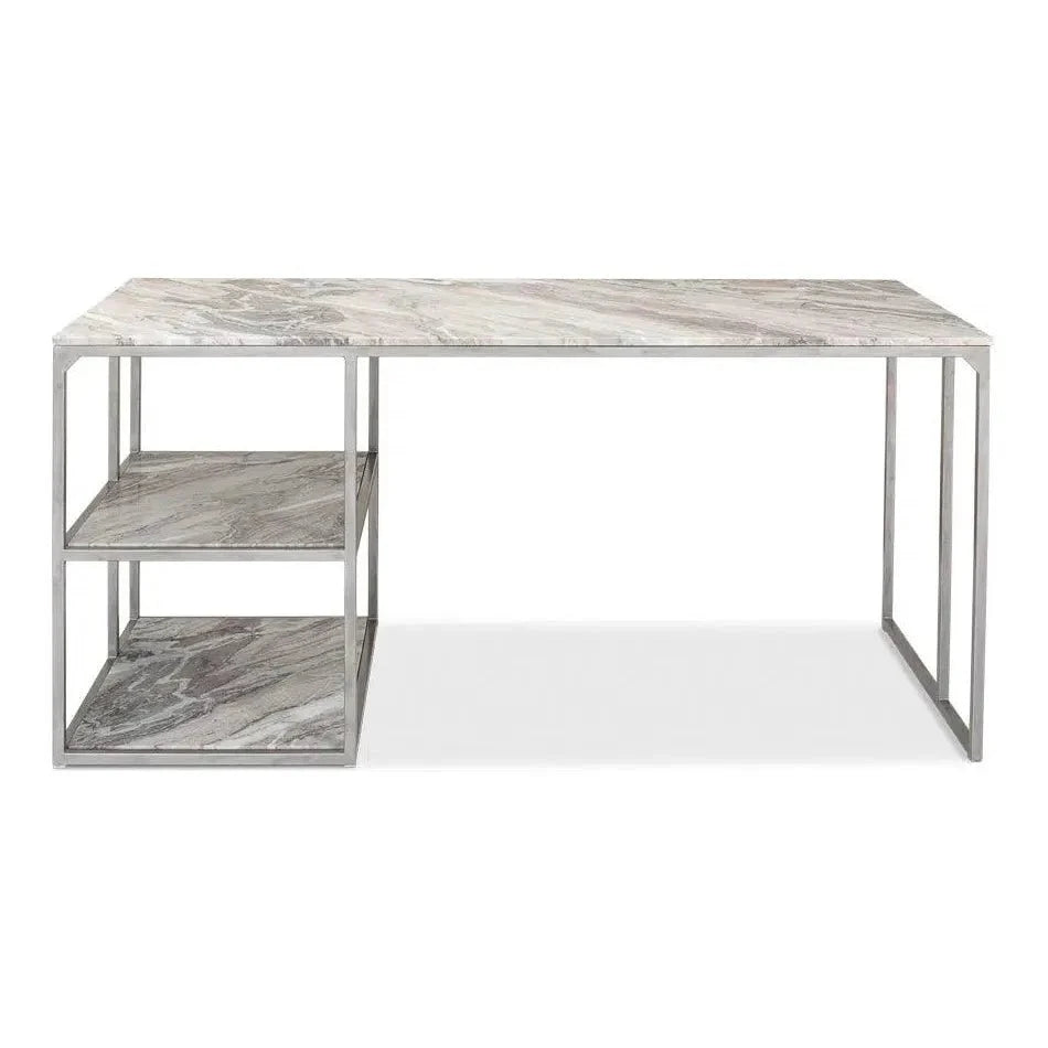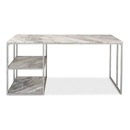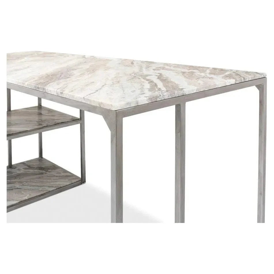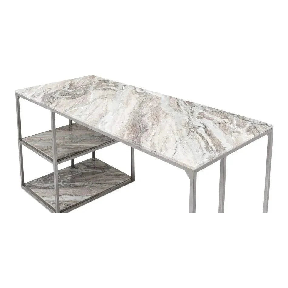 Effortlessly work or study in timeless elegance with the Open Desk with Shelves Marble Top. The sleek rectangular marble top perfectly complements the convenient open shelves, expertly supported by a matte black iron base. With its generous 62-inch width, this desk provides ample workspace for all your needs. The exquisite contrast between the natural marble and iron creates a striking and sculptural addition to any room. Handcrafted by skilled artisans using premium materials, this desk promises both lasting quality and practicality. Experience the perfect combination of modern style and versatile functionality with the Open Desk with Shelves Marble Top.