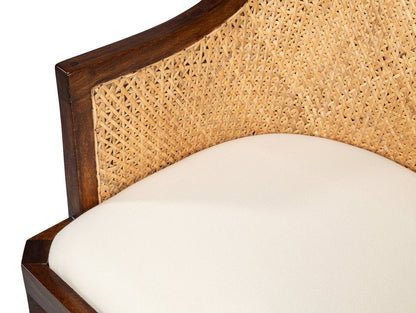 Featuring a woven rattan design on the back and sides, the Pacora Lounge Chair blends classic craftsmanship with a contemporary touch. The white cushioned seat provides comfort and a striking contrast against the dark wood frame, making it an inviting spot for relaxation. The angled legs and armchair style ensure a stable and comfortable seating experience.