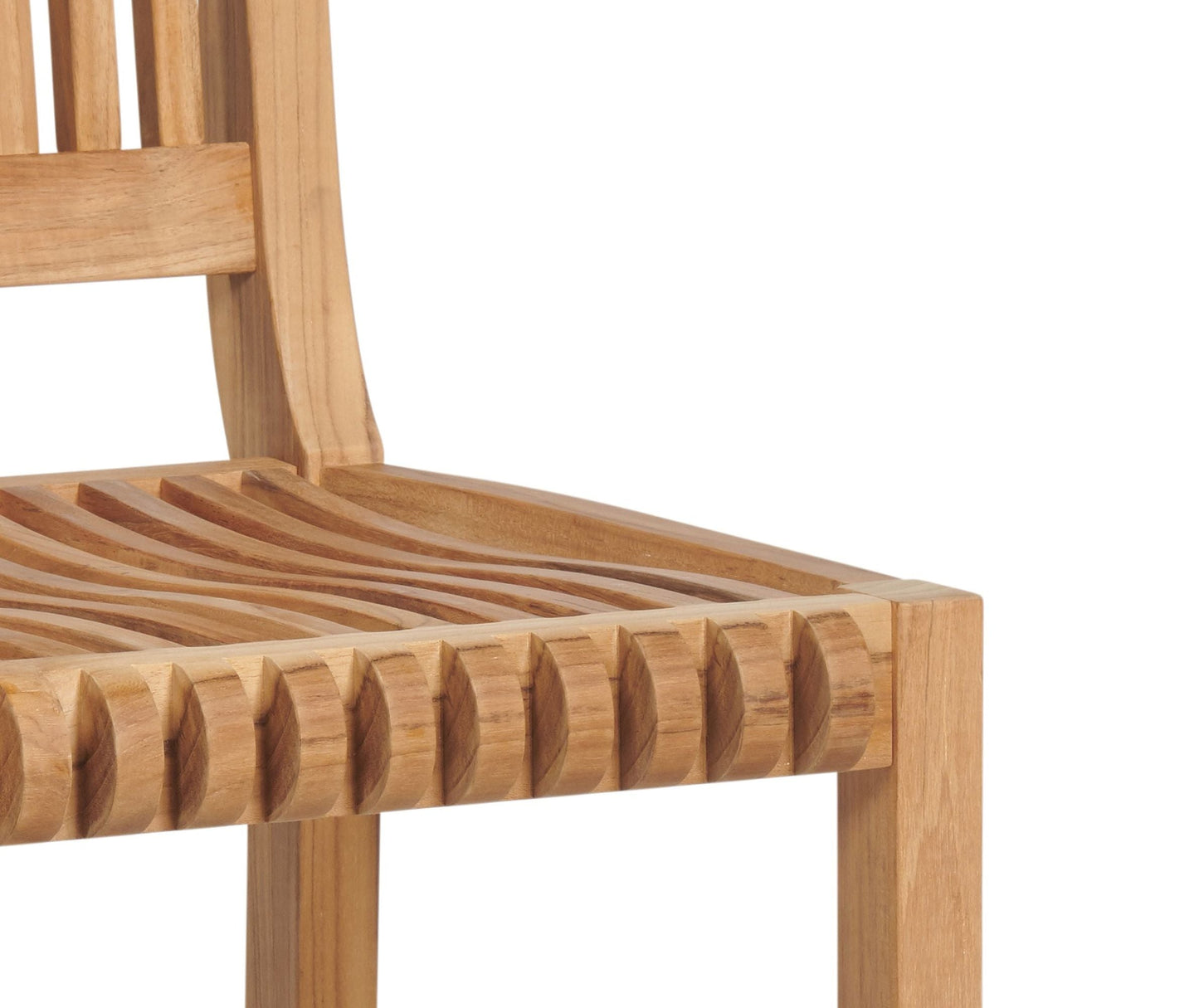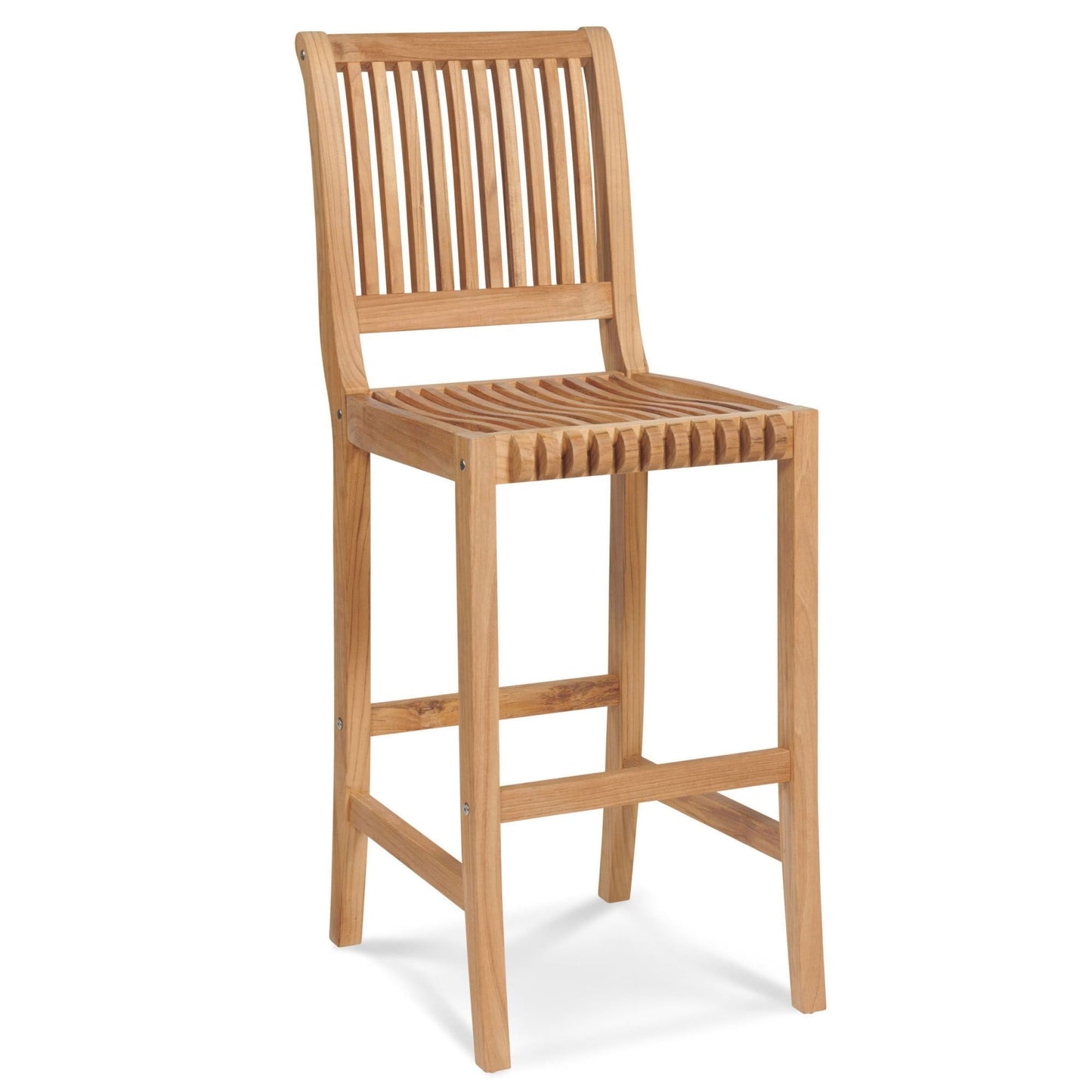 The Palm Teak Bar Stool adds simple elegance to any outdoor living space. Closely aligned slats are shaped in the seat and back for a great fit and feel, with or without cushions. The rounded elements in the front rail create a distinct profile and make this bar stool even more comfortable. Perfect for smaller balconies or by the pool, pulled up to your outdoor kitchen or bar. Simple assembly required all hardware including Premium teak responsibly harvested from well-managed plantations Teak is a prized timber for outdoor furniture resistant to rotting insects and the effects of wind rain sun, and freezing.