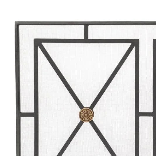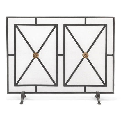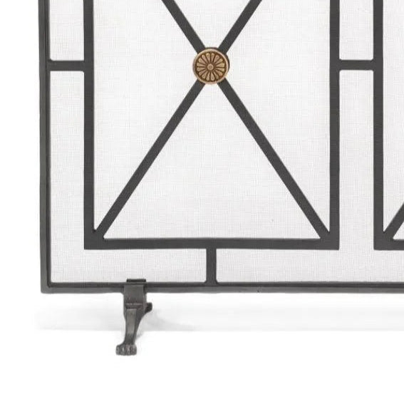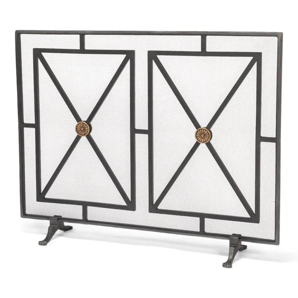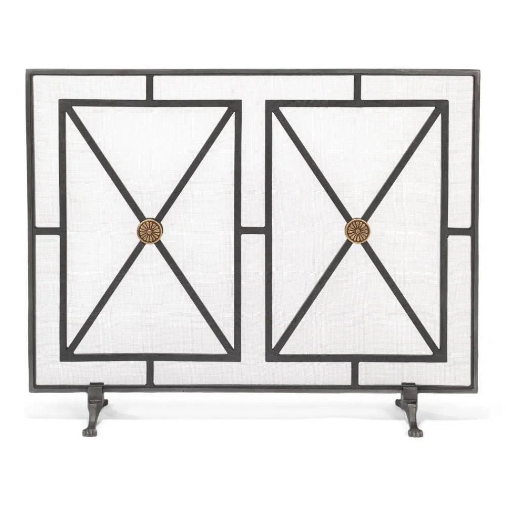 Protect and enhance your fireplace or stove with the elegant and durable Paneled Firescreen. Hand forged from iron and finished in charcoal, this firescreen boasts luxurious champagne bronze accents and a classic design reminiscent of a large grid pane window. Its 38-inch span provides safety by containing sparks and preventing accidental burns while still allowing an unobstructed view of the flickering flames. Crafted with quality in mind, the Paneled Firescreen is a necessary addition to any home.