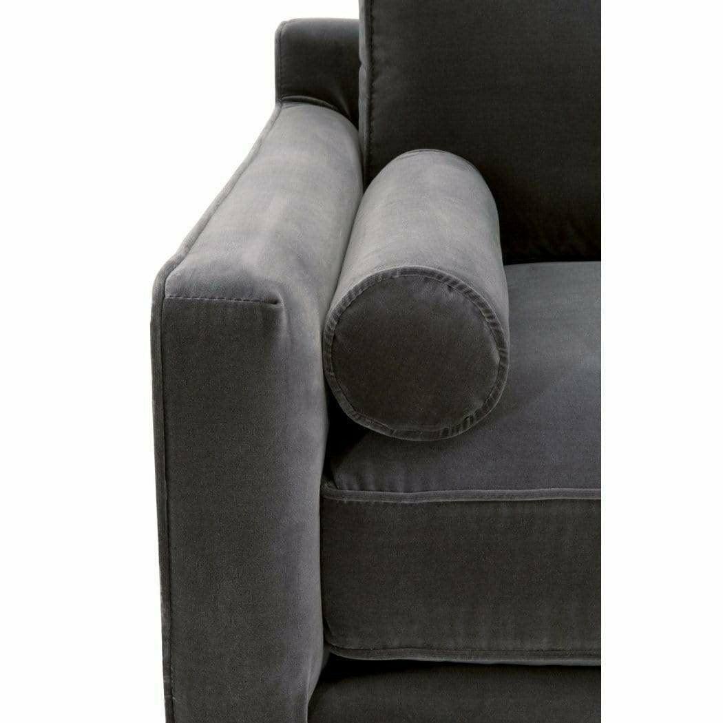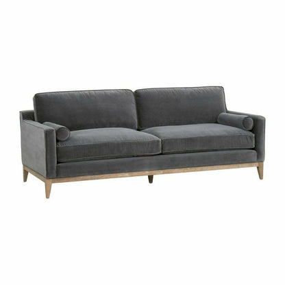 Indulge in opulence with the Parker 86" Post Modern Sofa. Adorned in sumptuous Dark Dove Velvet upholstery, with reversible cushions and accents of natural oak, this transitional style sofa exudes both elegance and practicality. Its medium firm seating and ample surface area provide the ultimate combination of comfort and luxury, making it more than just a piece of furniture, but a true masterpiece. Revel in the exquisite craftsmanship and superb quality of this stunning and durable sofa, designed to be your new favorite spot for relaxation. Let it be a statement of sophistication in your home, with its reversible seat and back cushions upholstered in Dark Dove Velvet, offering both comfort and style.