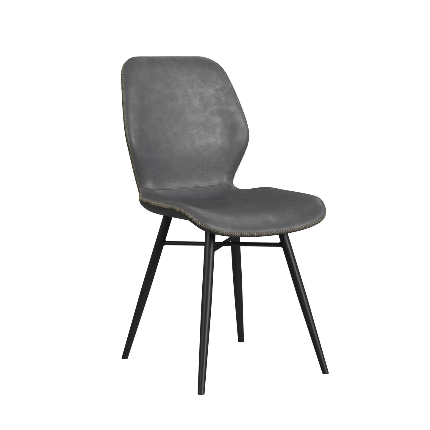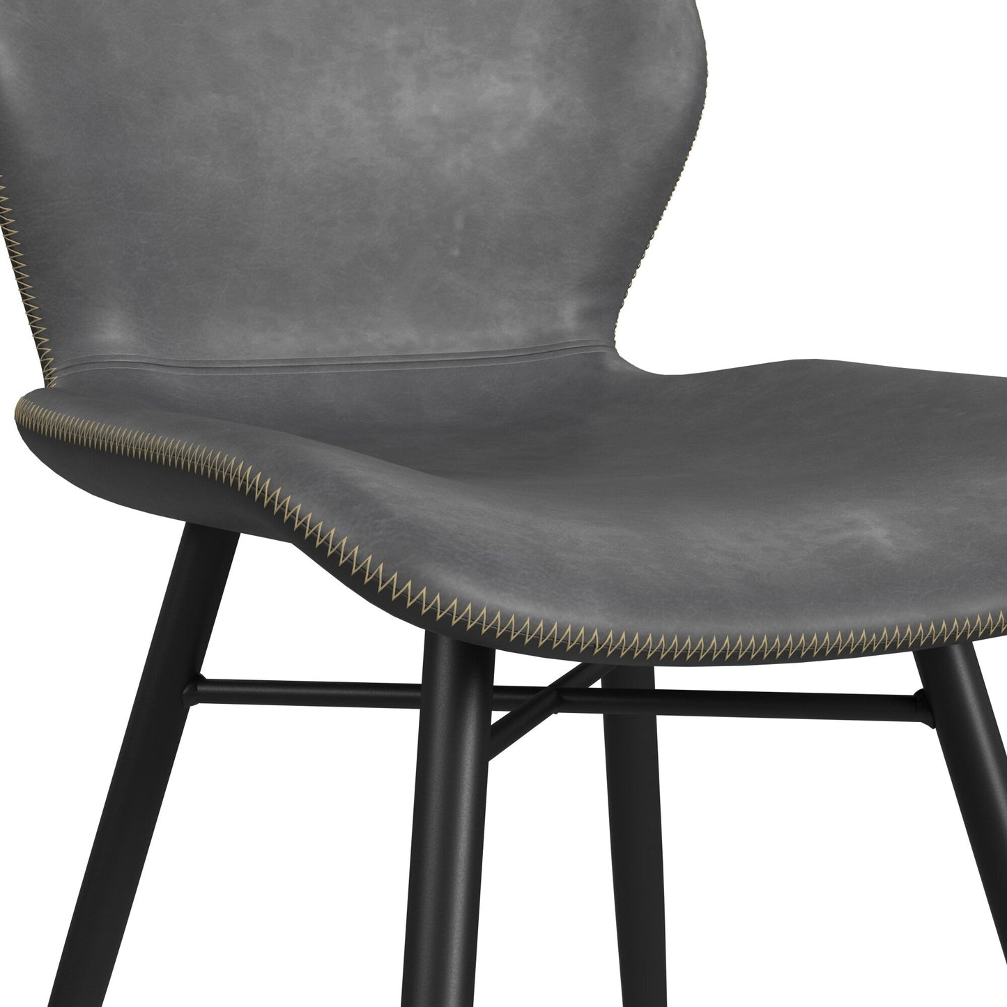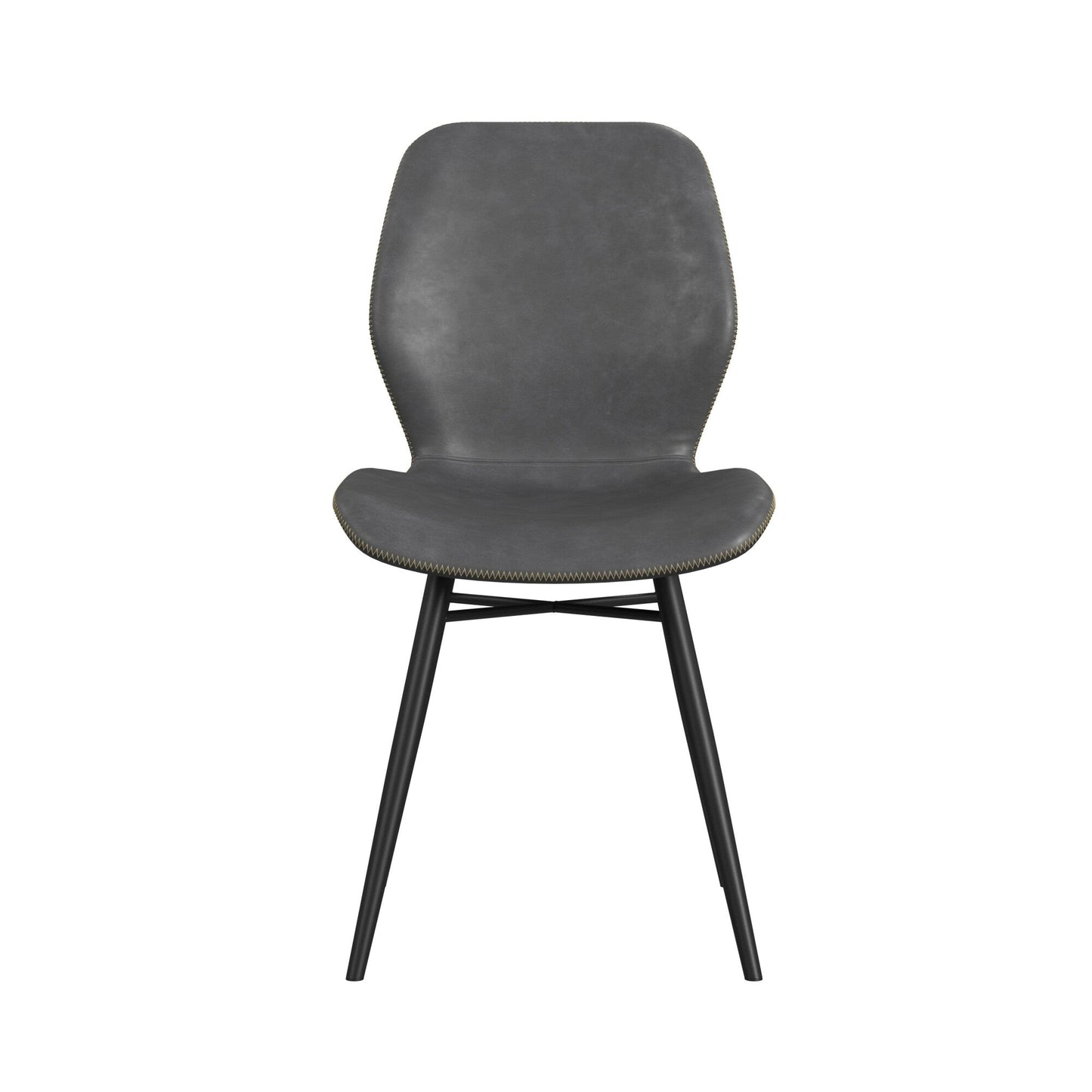 - The tapered back and curved seat are upholstered in a charcoal vegan leather.
