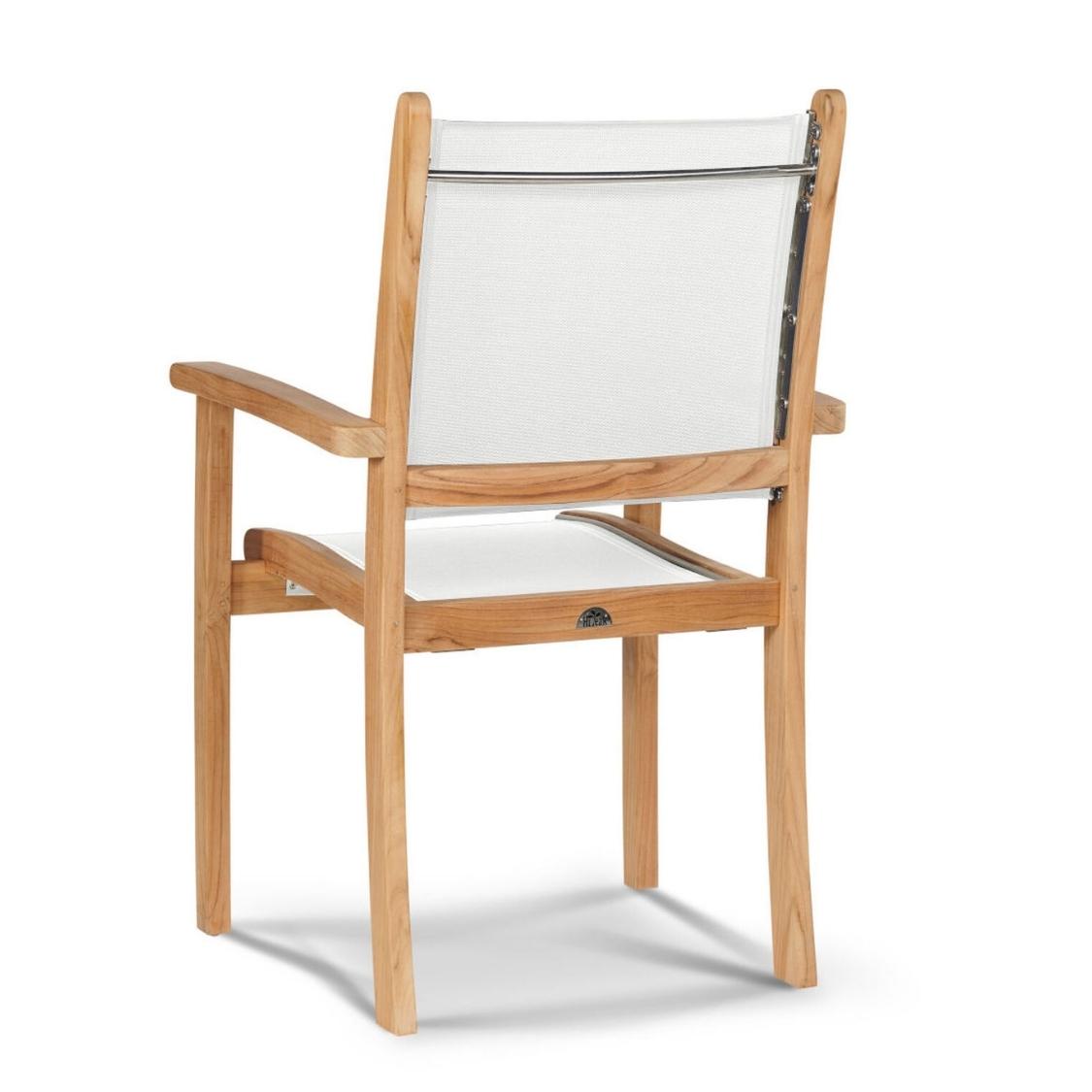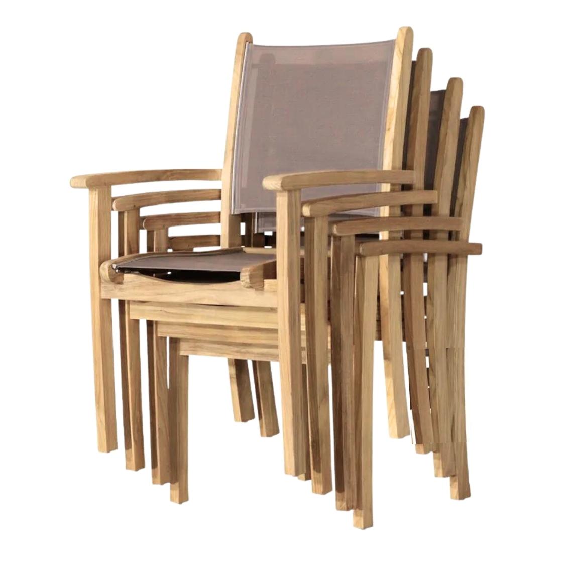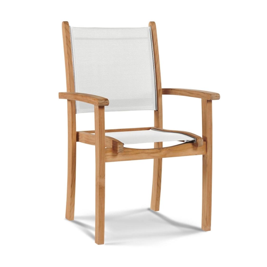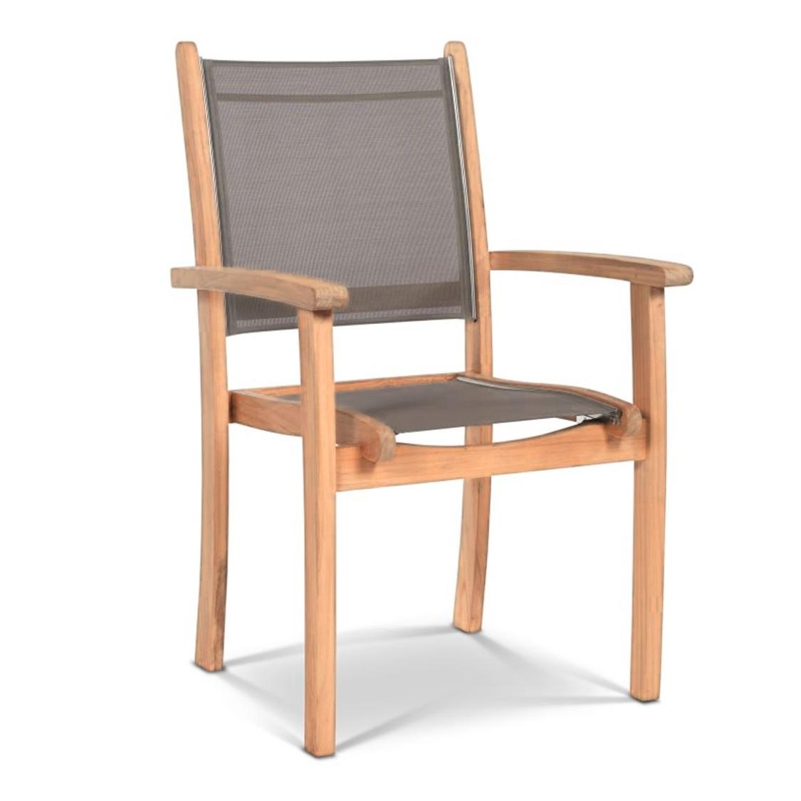 Let the adventure begin! Named after a trendy district in Paris, known for its hip artists and musicians, the Pearl Dining Arm Chairs combine the solid premium teak frame with a sleek and durable modern sling material. It's virtually maintenance-free and sure to become a favorite among your friends and family. With a hand-sanded finish that starts as a light golden color and then mellows to a soft silvery grey, this outdoor set exudes charm.