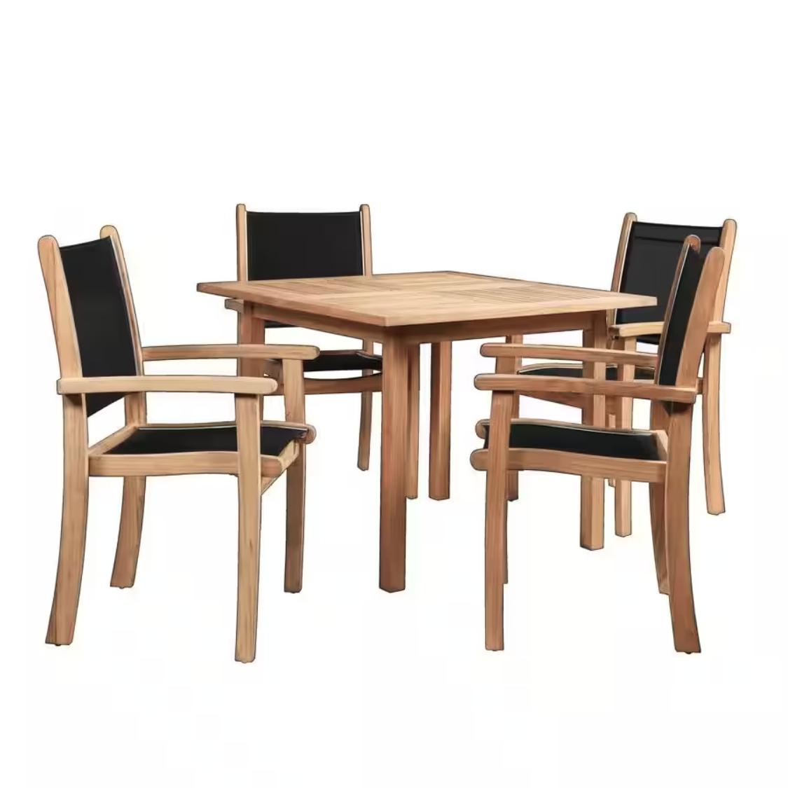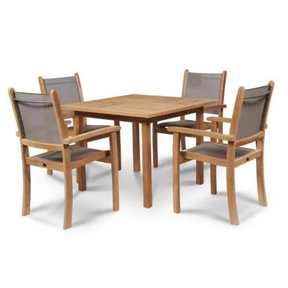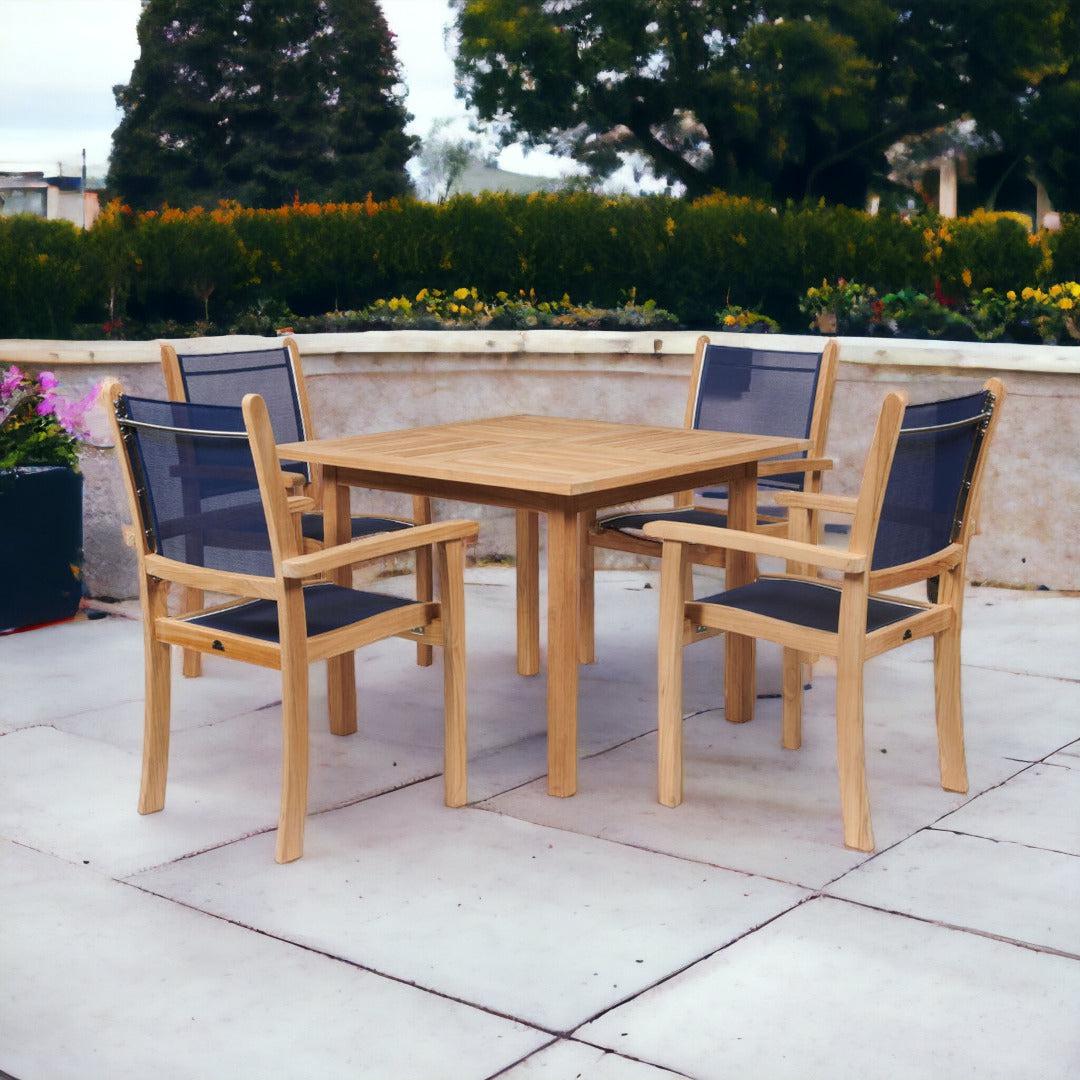 Meet the Pearl 5-Piece Square Teak Table Outdoor Dining Set! Featuring modern sling material for comfortable seating, this set requires virtually no maintenance. The centerpiece, a premium teak Birmingham Square Table, adds a touch of classic design to your outdoor space. And with four Pearl Teak Stacking Chairs, it's the perfect choice for all your entertaining needs. Assembly is a breeze with included hardware. Harvested responsibly, this set is made from premium teak.