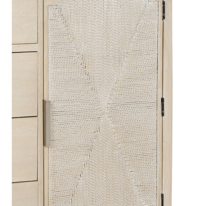 The Pearl Asymmetrical Door Chest is as practical as it is stylish. The brushed nickel drawer pulls and rounded edges add a touch of elegance, while the beveled top and tapered legs enhance its coastal charm. The door, adorned with a woven X-Design made of 6mm paper rope, offers a unique focal point that catches the eye. This versatile chest fits seamlessly in a family room, entryway, or bedroom, making it a flexible addition to your home decor. With its blend of functionality and design, this chest is a smart choice for those seeking an elegant storage solution.