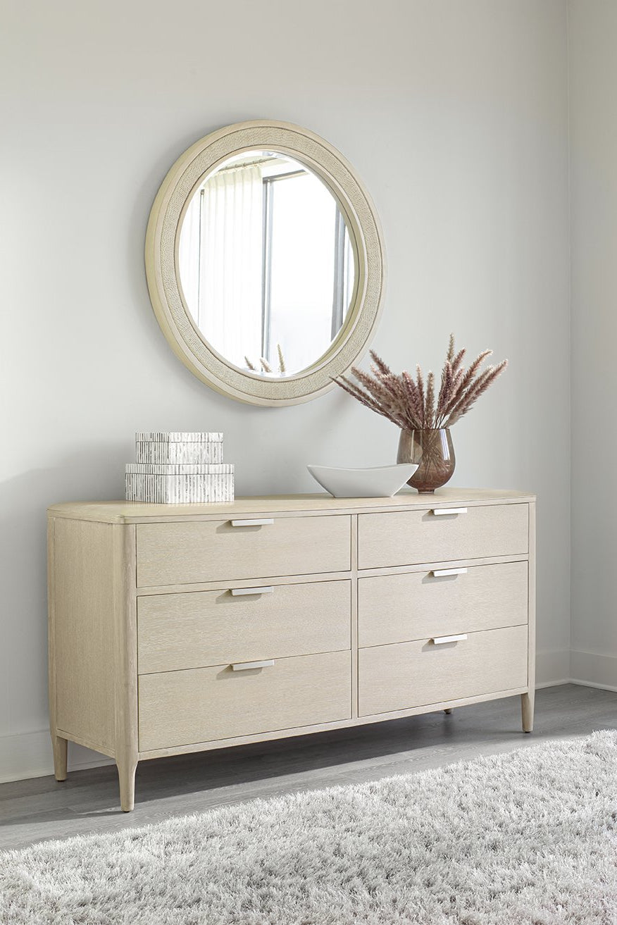 An elegant addition to any bedroom, the Pearl 6-Drawer Dresser and Woven Round Mirror Combo brings together functionality and style. With its transitional design, this dresser is crafted from high-quality Rubberwood, Mindi, and White Oak veneers, showcasing a soft sand finish that embodies a coastal charm. The dresser features six roomy drawers, each constructed with durable English dovetail joints and equipped with metal side-mounted full-extension drawer glides, ensuring easy access to all your stored items. The drawer bottoms are thoughtfully designed with a natural stained and sealed veneer to prevent any snags on your clothing.