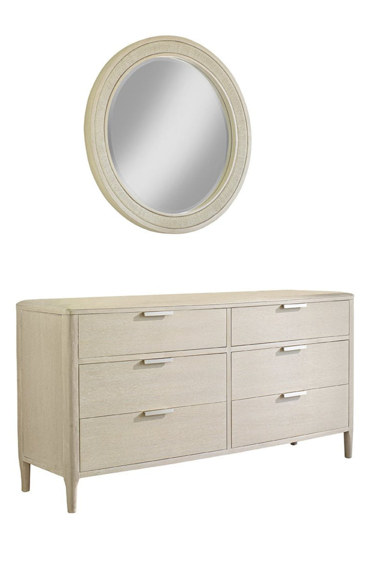 The dresser's stylish design is highlighted by brushed nickel drawer pulls, rounded edges, a beveled top, and tapered legs, making it a standout piece in any room. Complementing the dresser is a beautifully crafted round mirror with a wooden frame and woven cord accents. The beveled edge of the mirror adds a touch of sophistication while enhancing the coastal aesthetic. This combination not only maximizes storage and functionality but also enhances the visual appeal of your space, making it a perfect choice for those who appreciate both style and practicality.