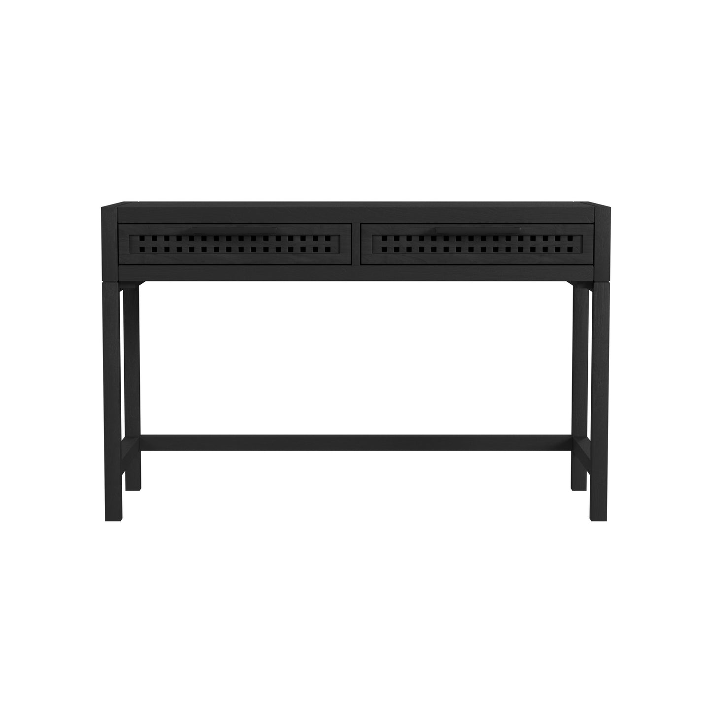 The Pentak Desk features modern Bohemian styling with an industrial flair. Featuring two drawers highlighted with open-pierced fretwork detailing and matte black iron bar pull hardware. This console table is constructed with mango solids a finished in a sand blasted, matte black. Natural mango wood is a product of nature and is completely unique. The natural material is subject to variations in characteristics such as color, density, grain and finishing.