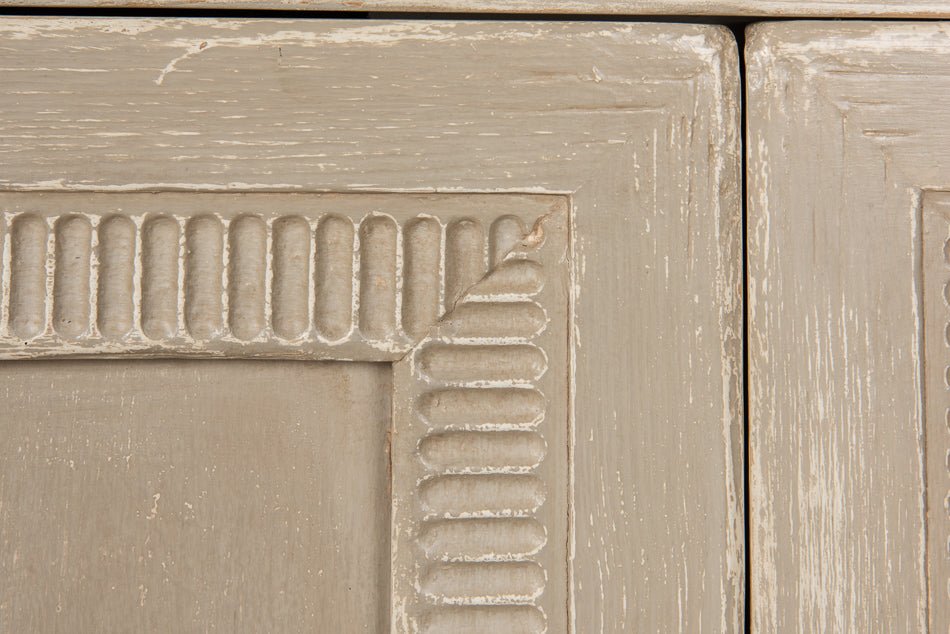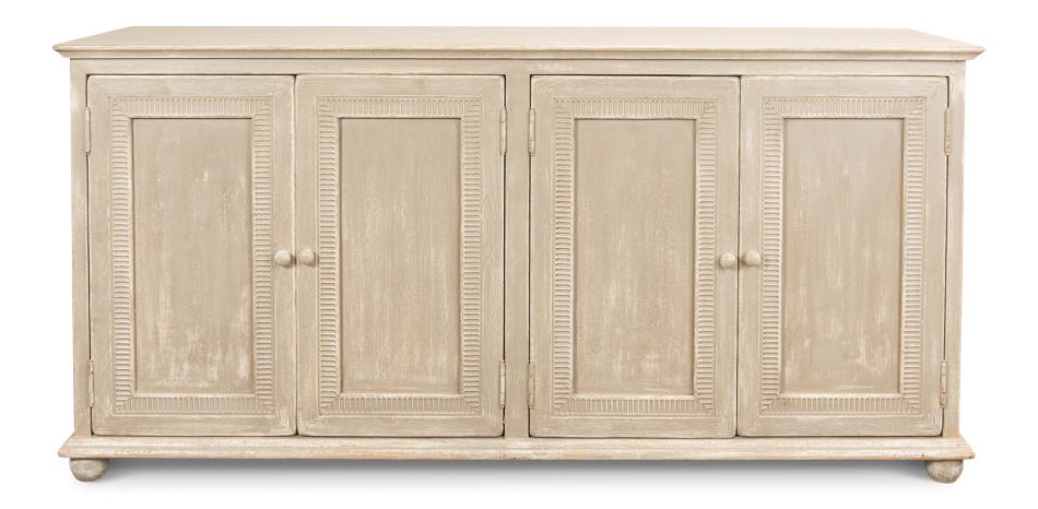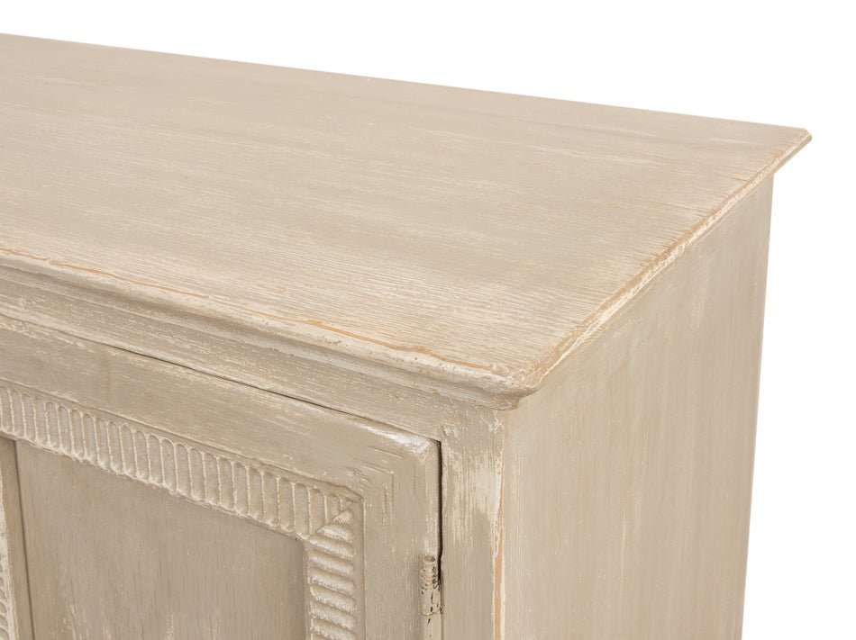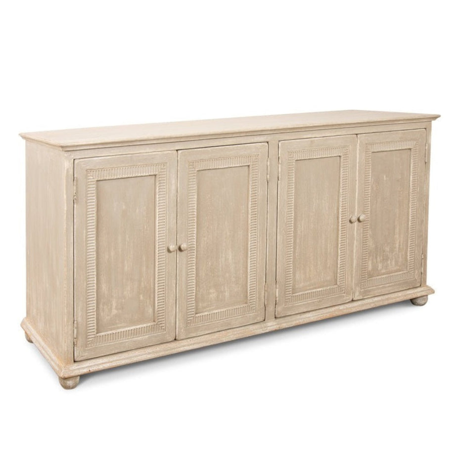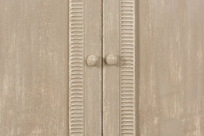 Designed to bring both function and style into your home, this sideboard is a versatile addition to any room. Crafted from sturdy pine, it offers a strong build that promises durability. Its beige finish provides a neutral backdrop, allowing it to blend seamlessly with a range of decor styles. The sideboard's elegant design, with textured panels and round knobs, adds a touch of charm, making it not just a piece of furniture but a statement of taste.