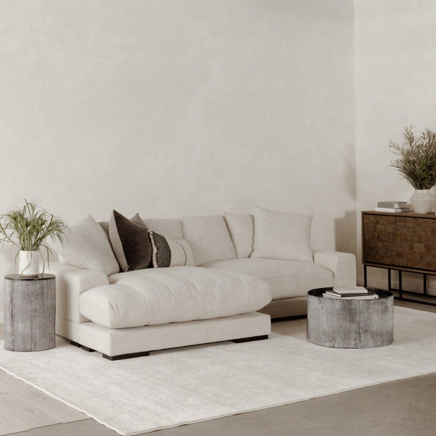 Introducing the Plunge Cream Sectional Sofa Sahara. Sink into its luxurious cushions for ultimate comfort and relaxation. With clean lines and soft pillows, this sectional elevates your living room. The flip chaise option offers versatility while the solid eucalyptus frame ensures durability. Experience true indulgence in your space. Sink into the luxurious cushions of the Plunge Sofa to experience ultimate comfort and relaxation. Clean lines and soft pillows make this sectional the perfect addition for your living room. Whether you are entertaining guests or need a long-deserved nap, the Plunge's wide sectional chaise and deep cushions make the most of your space. Tired of the same look?
