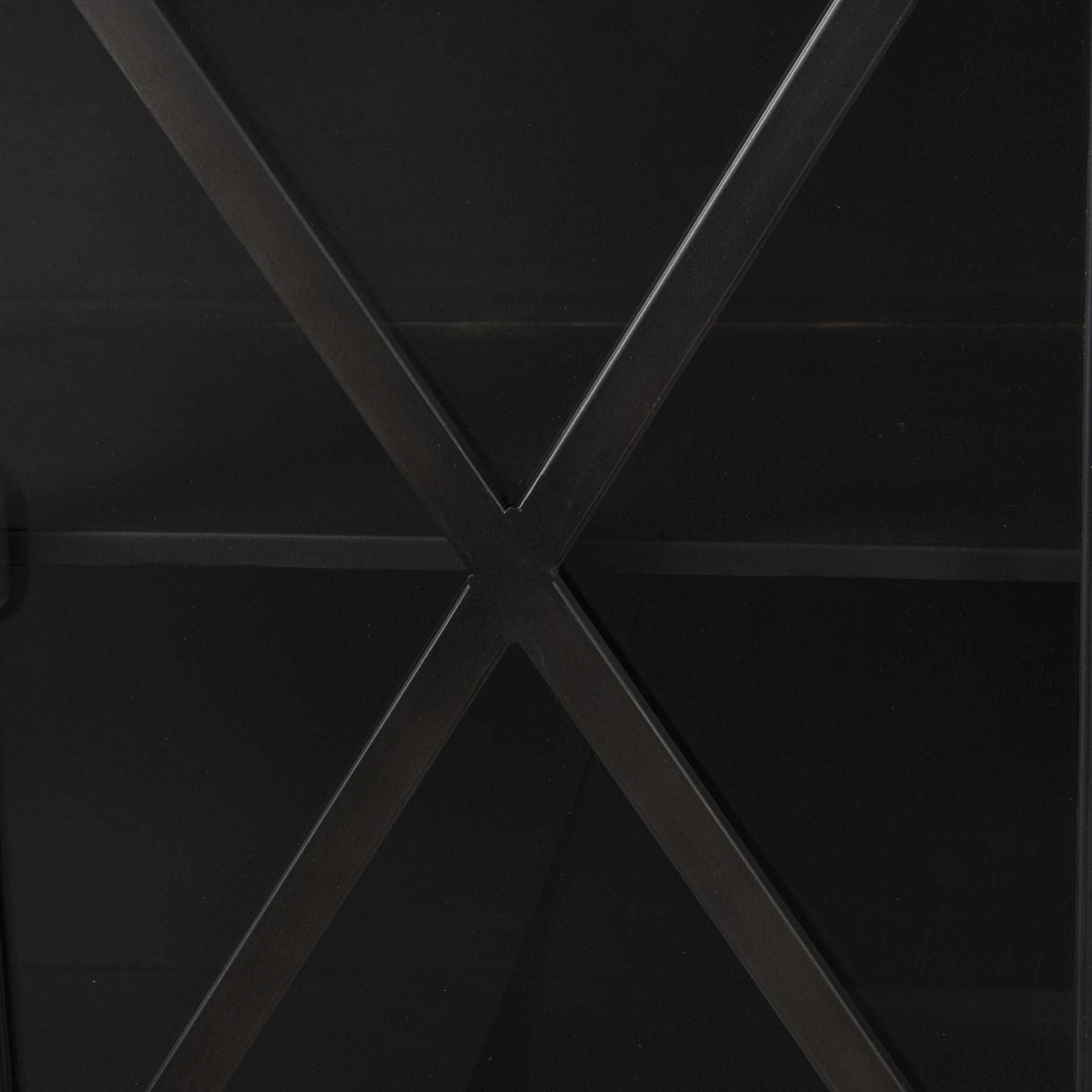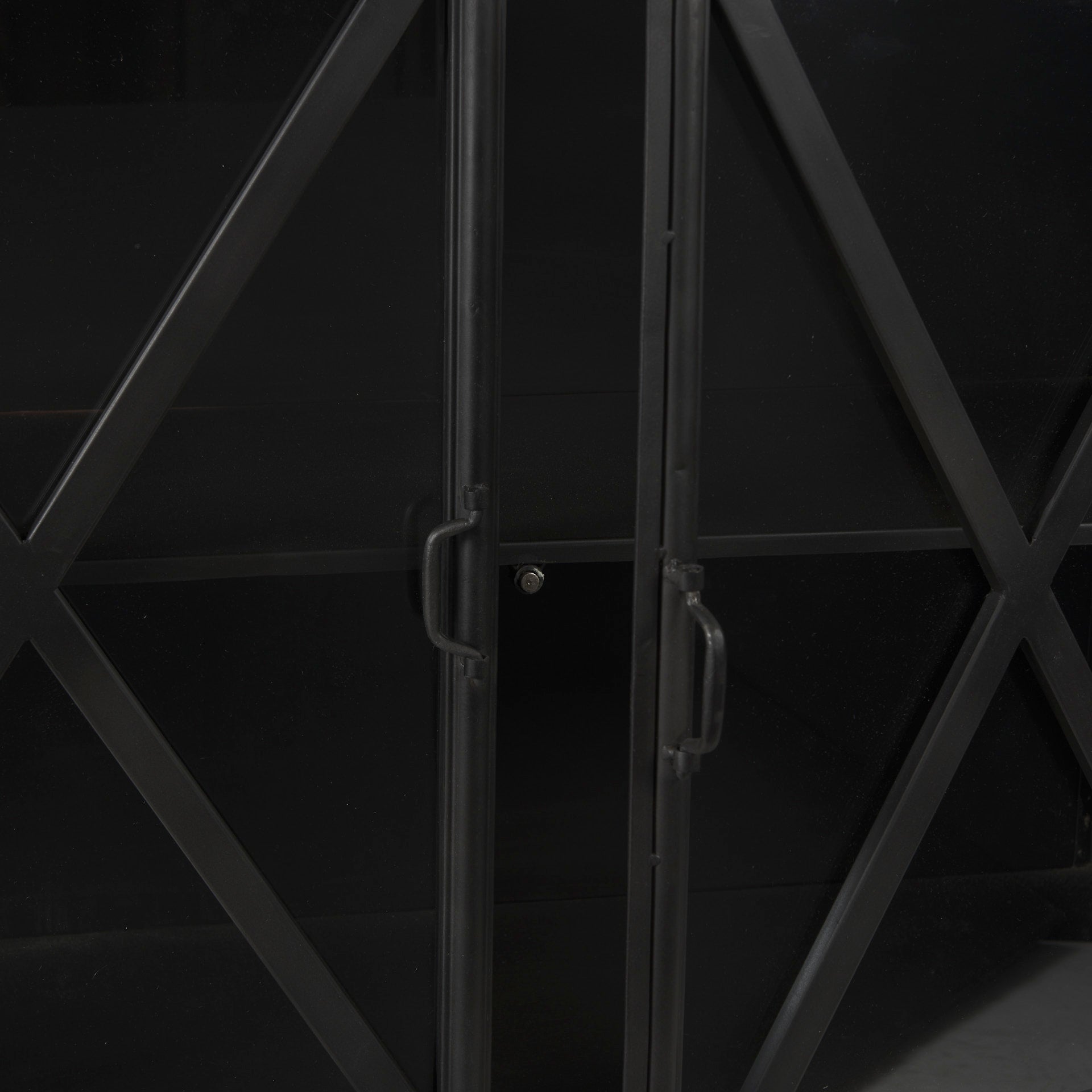 The Poppy Glass Door Black Sideboard is an elegant addition to any home, bringing together style and practicality. Crafted from sturdy iron with a sleek black finish, this piece offers a robust yet refined look. It features four glass-lined doors with a unique metallic cross-hatch design, adding an industrial touch to your space. This sideboard is perfect for those who appreciate both form and function. The glass doors allow for a subtle display of your cherished items, making it a standout choice for living or dining areas that embrace Industrial or Mercana Modern design styles.