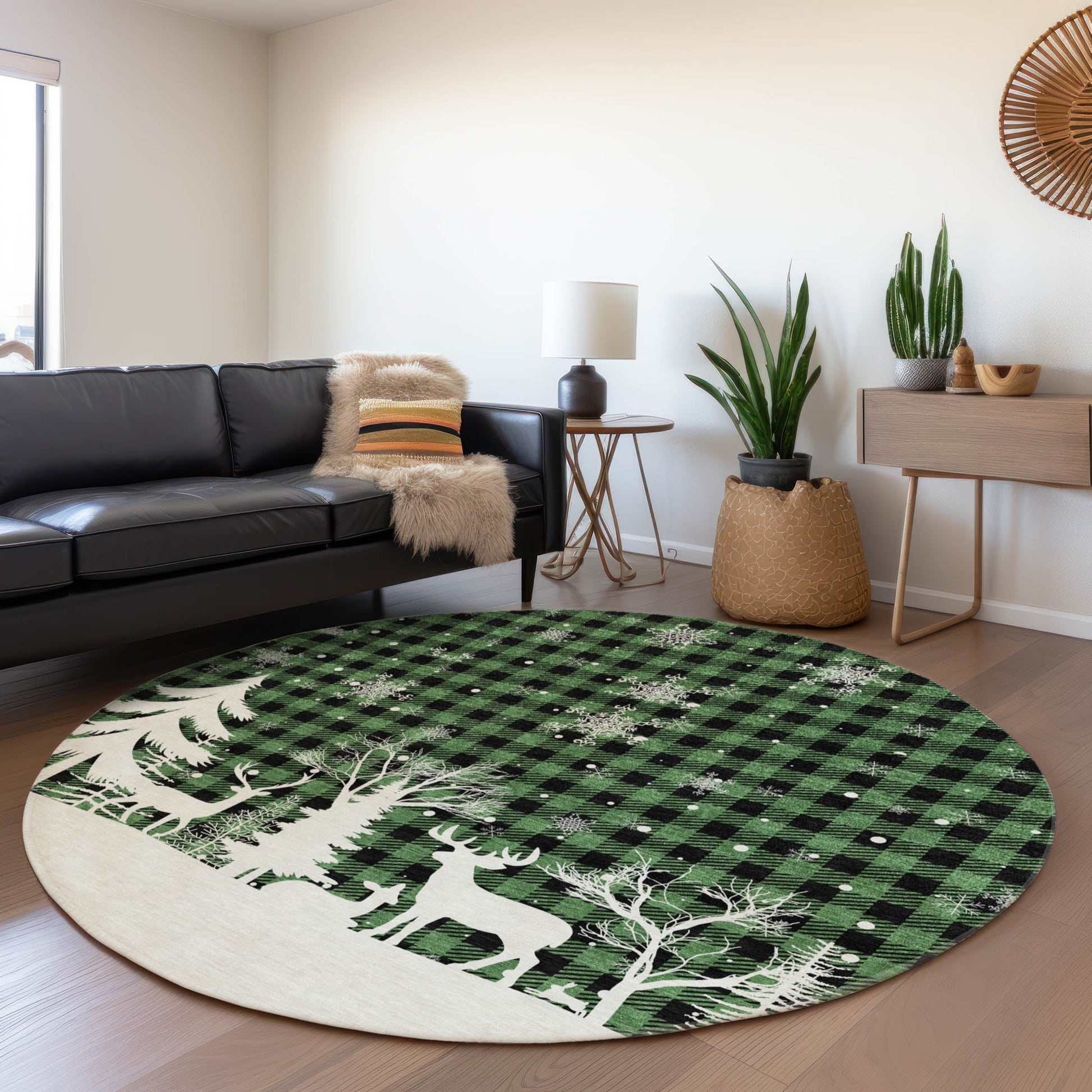 The Quaora Green Washable Indoor-Outdoor Rug brings a unique touch to any setting with its charming plaid and nature-inspired design. This rug artfully combines a plaid background with deer and tree motifs, evoking a festive spirit that fits perfectly in both modern and traditional spaces. Its transitional style ensures it complements varied decor themes, adding warmth and character to any room. Designed for versatility, this rug is suitable for both indoor and outdoor use, making it a practical addition to any home.