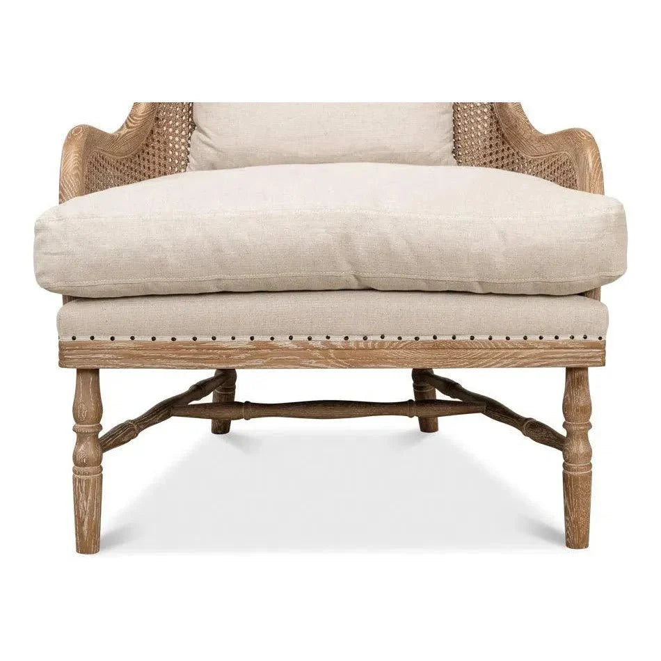 The Randolph Wing Chair in a natural linen color is a classic choice for your traditional decor. it boasts 100% linen Upholstery for a soft and comfortable feel. Crafted from oak with a white wash finish, this wing chair exudes timeless elegance. Experience comfort and sophistication with our Randolph Wing Chair. Made from top-quality oak with a refined white wash finish, this classic chair offers enduring beauty and durability. The 100% linen upholstery ensures a soft and luxurious feel, perfect for adding a touch of traditional style and comfort to any space.
