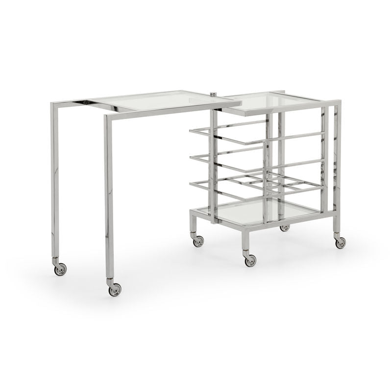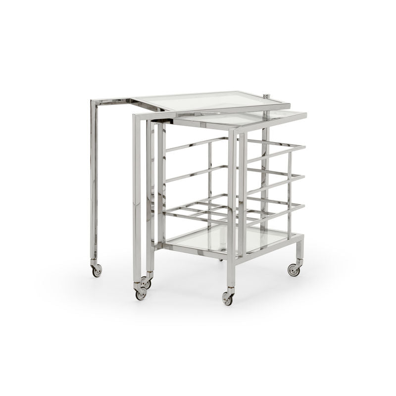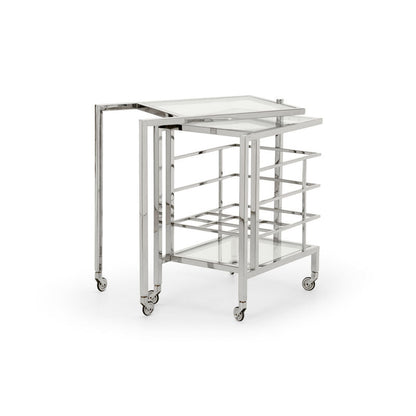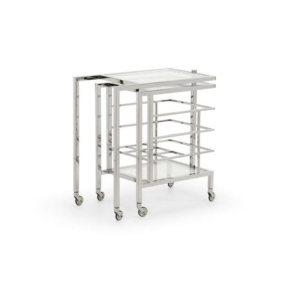 The Rankin Bar Cart is a stylish and functional addition to any home. Its polished nickel finish gives it a sleek, modern look that complements any decor. Designed for both convenience and versatility, this cart includes casters for easy mobility, making it perfect for entertaining guests or simply enjoying a relaxing evening at home. The swivel feature allows you to expand the cart's width, providing easy access to your drinks and accessories. With a spacious design, this bar cart holds up to six bottles and offers three shelves, ideal for glassware and ice. Its silver color adds a touch of elegance to any room, making it a must-have for those who love to entertain.