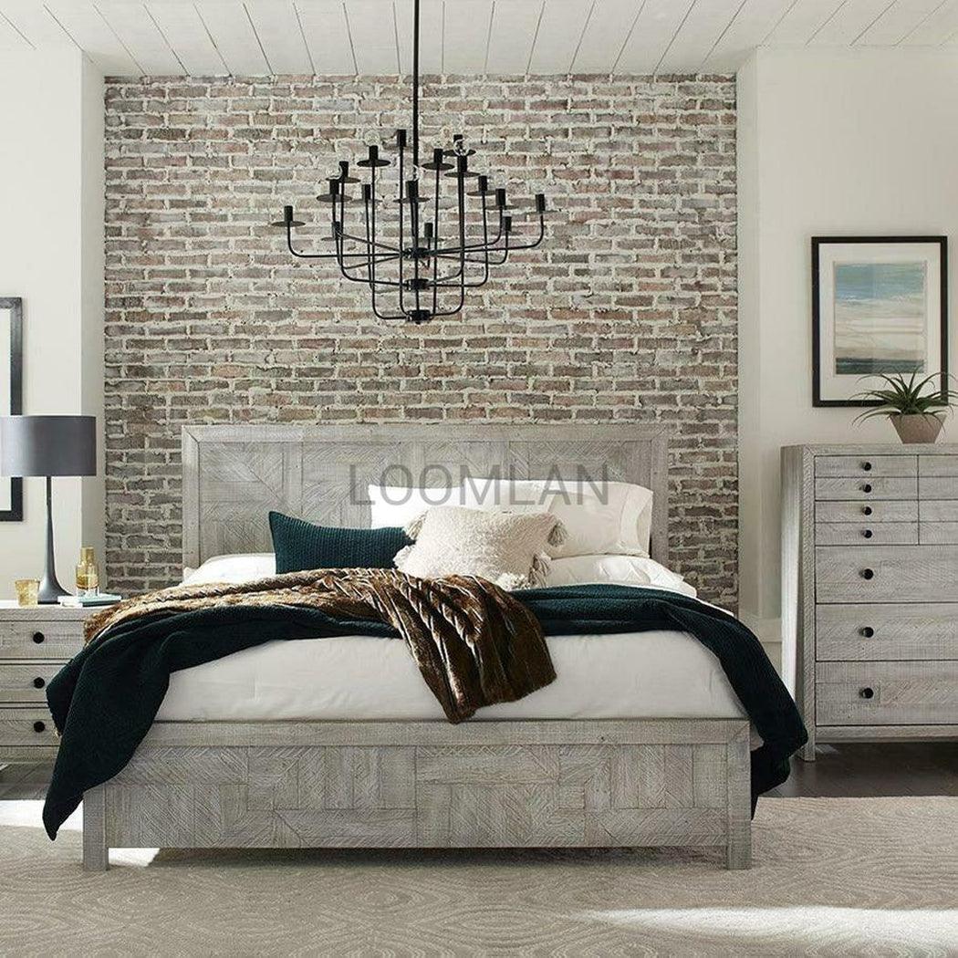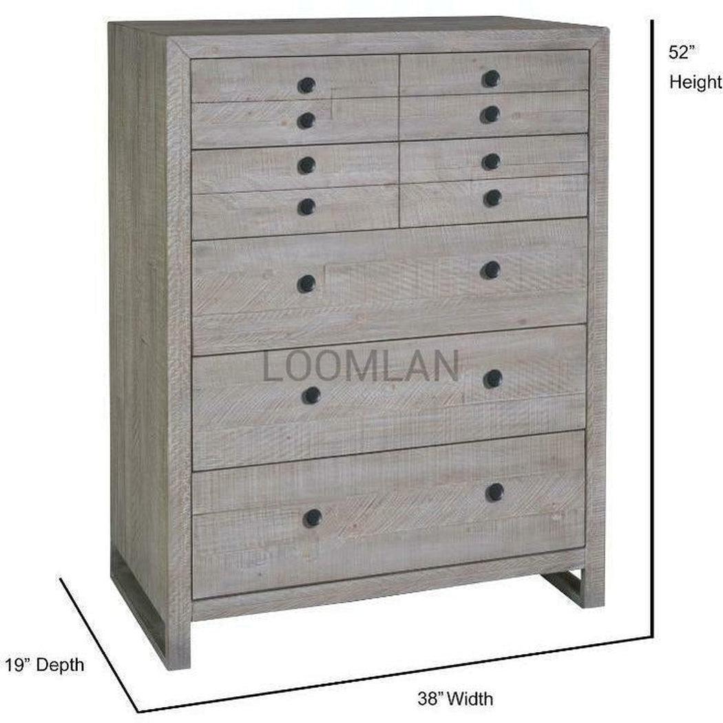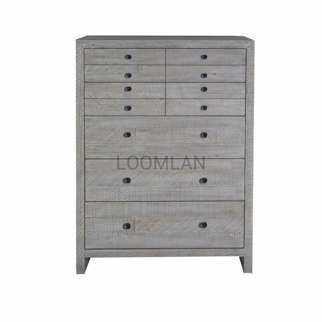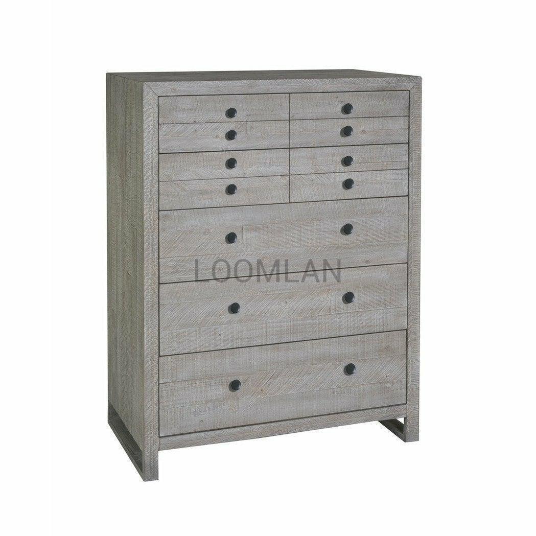 Experience tranquility and sophistication with our Reclaimed Pine Wood Serenity Drawer Chest. Meticulously crafted from distressed solid pine salvaged from reclaimed wooden pallets, our exquisite chest boasts a water-based gray finish with a white glaze that brings out the inherent beauty of its imperfections. The drawers, stained in a light grey, glide effortlessly on ball bearing side guides for a luxurious touch. Elevate your living space with this exclusive piece made from sustainable materials. Combining the quality construction of LOOMLAN with the character of reclaimed wood, the Serenity Five Drawer Chest offers spacious storage with a subtle water-based gray finish and a fresh white glaze that highlights the natural grain and unique story of each piece.