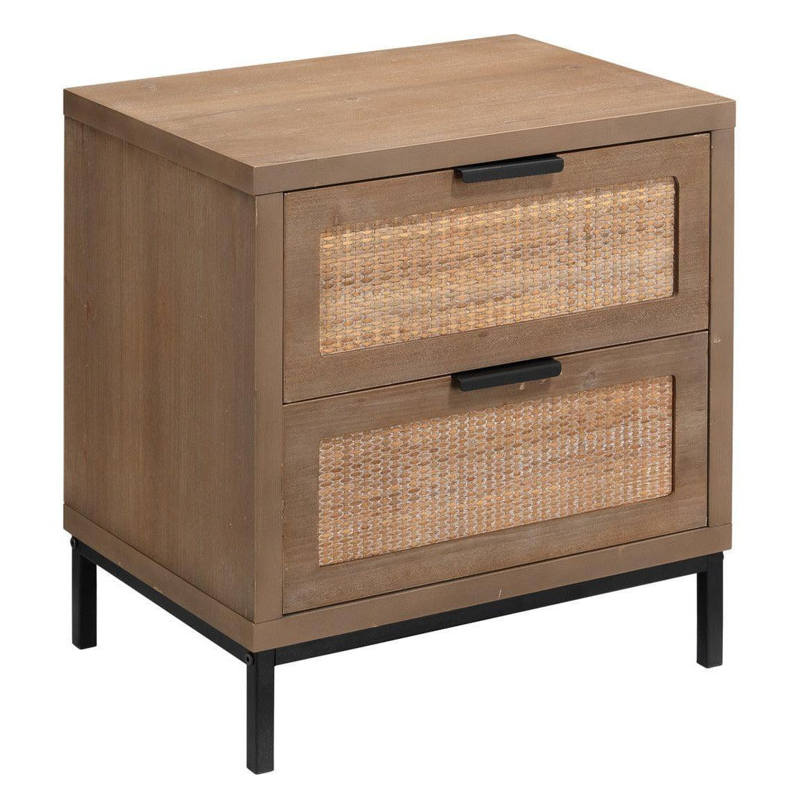 Introducing our Reed Rattan 2 Drawer Mid Century Modern Side Table. Made with light and airy washed wood and grounded dark metal legs, this table adds a perfect balance of form and function to any room. With natural variations and unique character, it's a versatile and stylish addition to smaller spaces. Reed Rattan 2 Drawer Mid Century Modern Side Table Our Reed Collection of furniture is a complimentary contrast of light and airy washed wood with grounded dark metal legs. The Natural variations in the wood finish make each piece subtly unique. When added to the textured raffia and Modern metal drawer pulls, these storage pieces add the perfect balance of form and function into any room.
