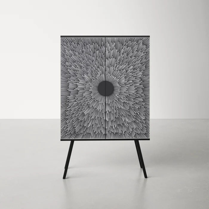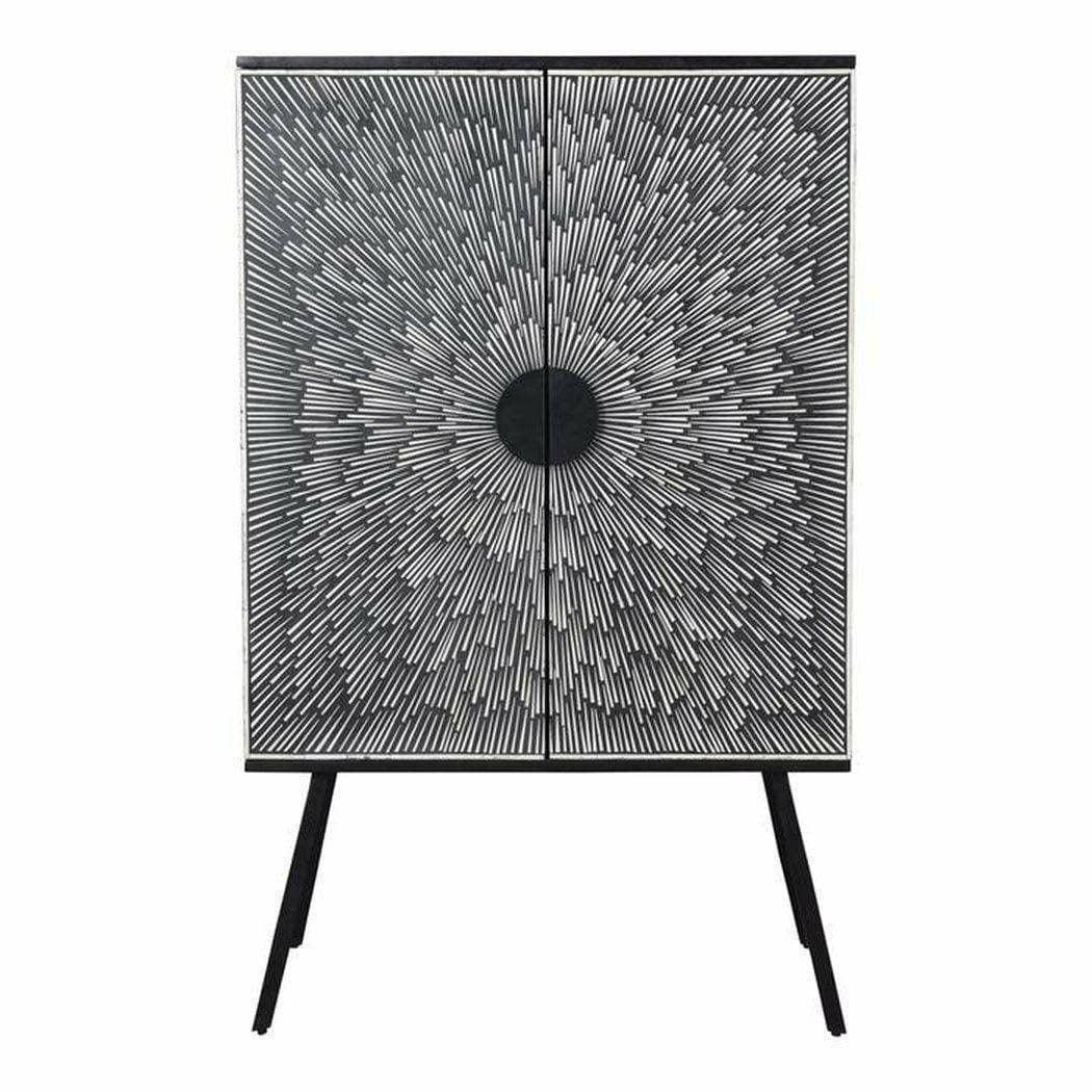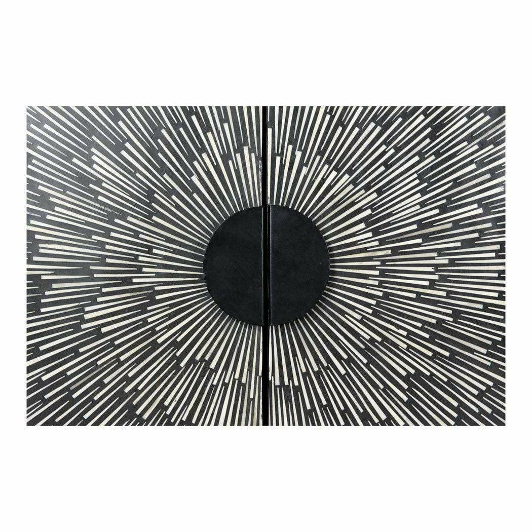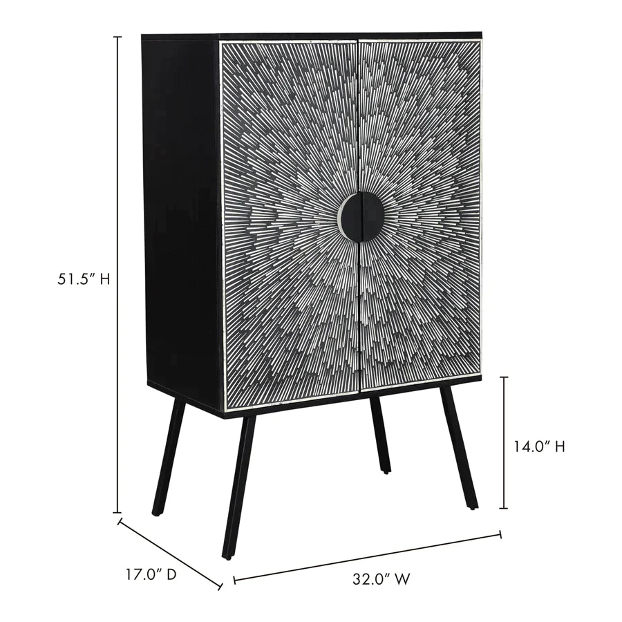 Introducing the Sunburst Wine Cabinet, a stunning 32-inch piece from Moe's Home Collection Furniture that combines the elegance of black-and-white art deco with luxurious camel bone and resin. The two wide swinging doors offer ample space to showcase your prized wine collection, while adding a touch of glamour to any room. With its alluring design, every time you reach for a bottle, you'll feel like a star! The Sunburst Wine Cabinet from Moe's Home Collection Furniture exudes sophistication and luxury. The art deco-inspired piece features meticulously crafted details, including camel bone and resin, that bring a touch of elegance to any space.