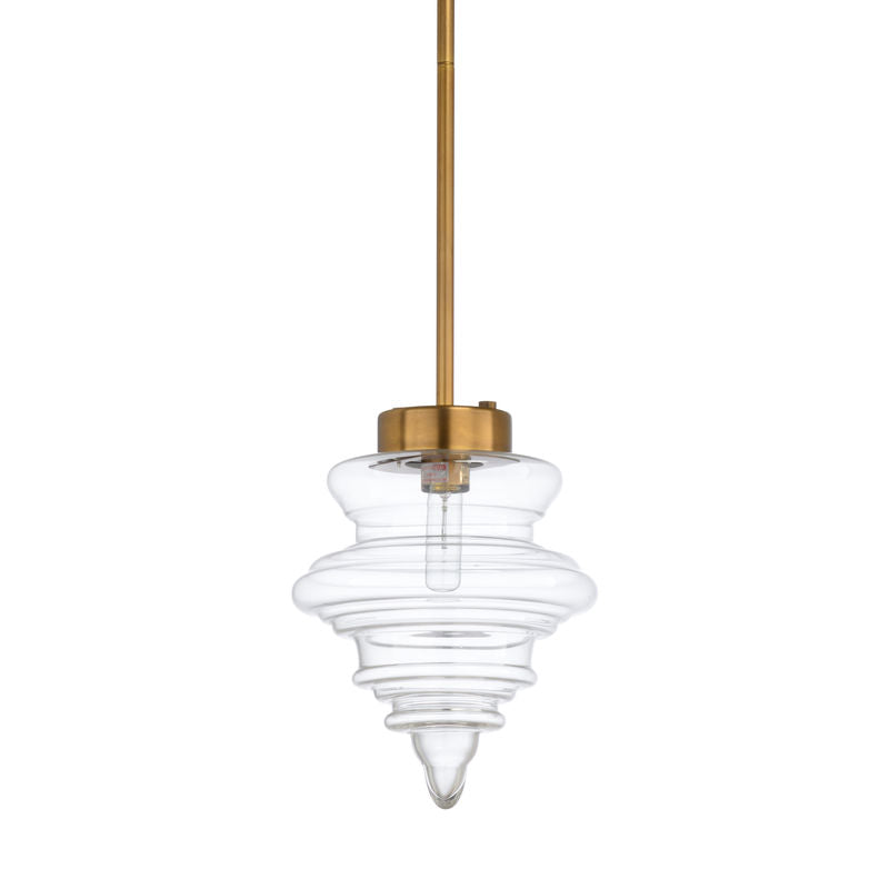 The chandelier comes with a set of rods, including one 6-inch and three 12-inch options, allowing you to customize the height to suit your needs. The layered spiral design of the glass pendant adds a unique visual interest, making it an eye-catching addition to dining rooms, kitchens, or living spaces. The gold metal fixture enhances the overall aesthetic, providing a touch of glamour and luxury to your surroundings. Whether you're hosting a dinner party or enjoying a quiet evening at home, this chandelier promises to illuminate your space beautifully.