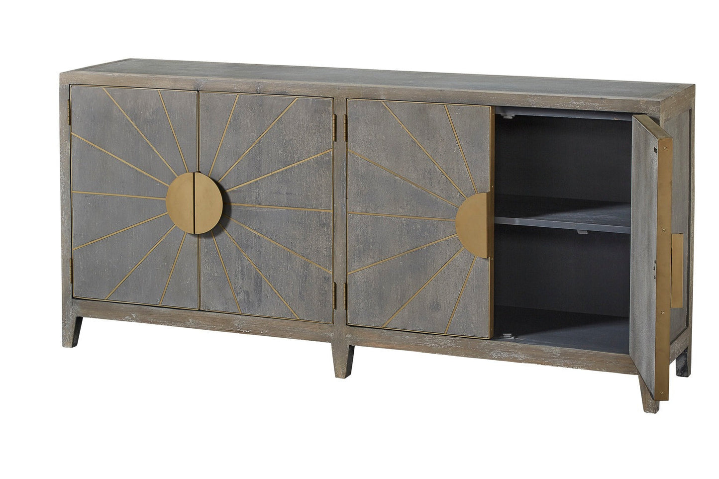 Make a bold statement and unlock the radiance of your home with this stunning sideboard, featuring a chic cool gray finish enhanced by brass inlaid sun rays and circular pulls. Each pair of doors also offers a removable shelf for practical storage. Choose the daring path and add the Rising Sun Sideboard to your stylish interior.
