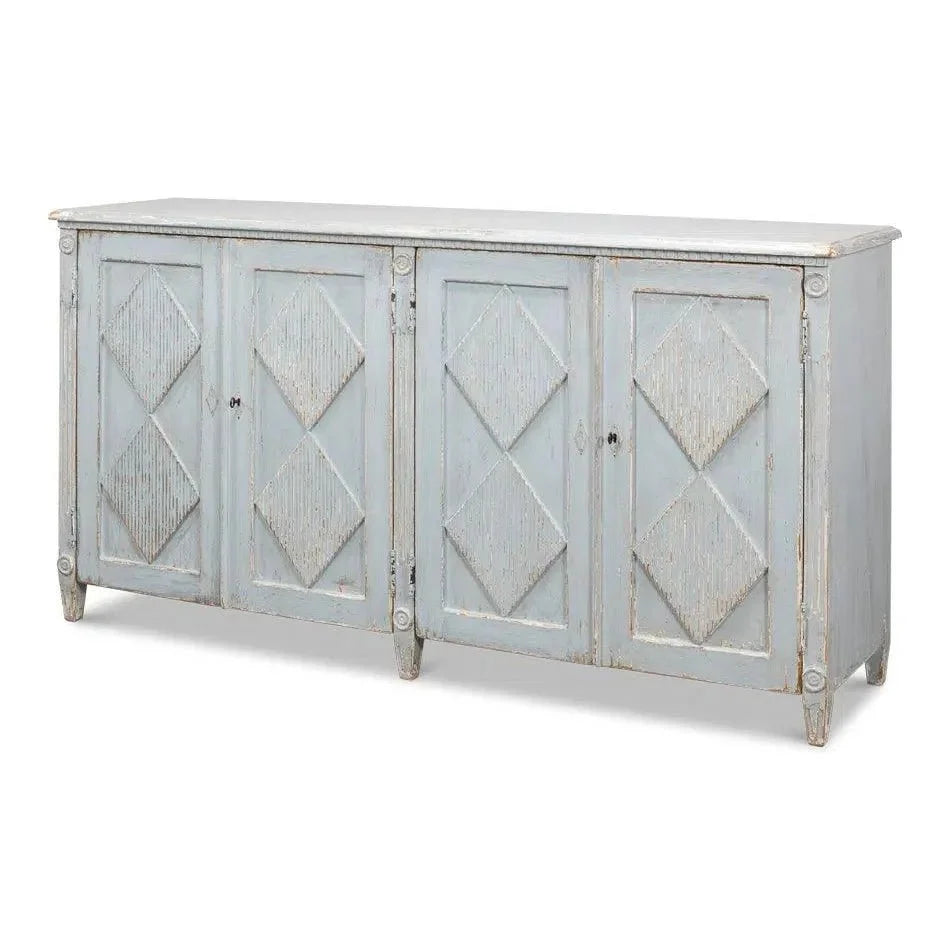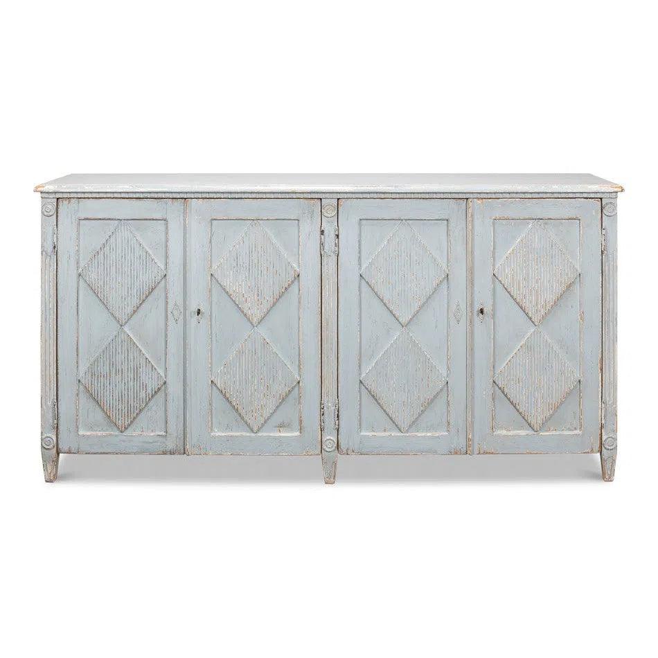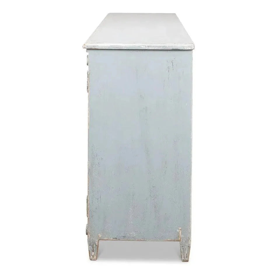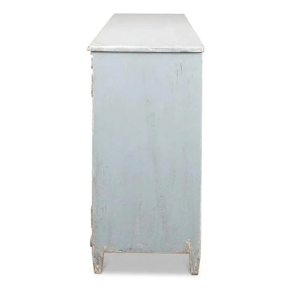 Make a refined traditional statement with the Roanne Sideboard. Expertly crafted from solid Reclaimed Pine, this 77 inch wide sideboard features a weathered blue-grey finish that varies for a well-loved aesthetic. Two removable interior shelves neatly store your dining and bar essentials hidden behind raised panel doors accented by crown molding and antique iron hardware. Built to last thanks to its solid pine construction and artisanal quality, the Roanne Sideboard brings timeless storage and style to dining rooms, kitchens, and living spaces alike. For effortless sophistication, choose this artisan sideboard.