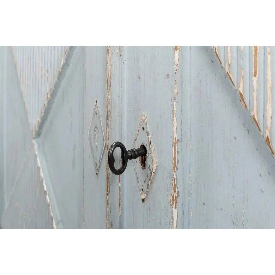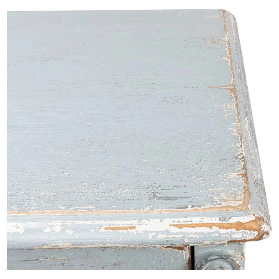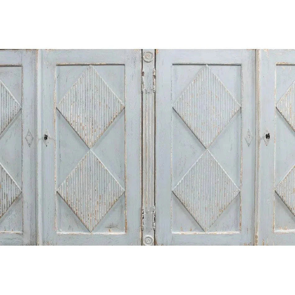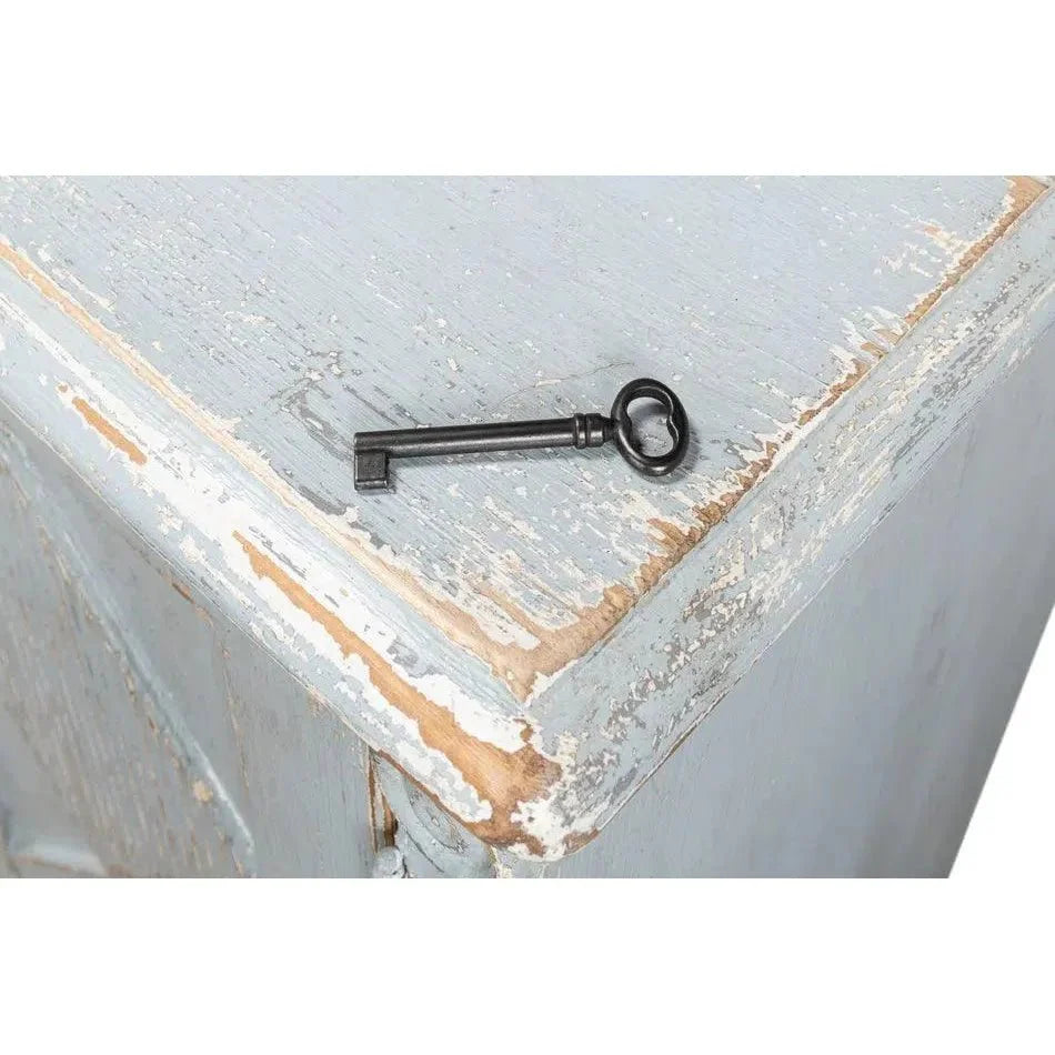 Make a refined traditional statement with the Roanne Sideboard. Expertly crafted from solid Reclaimed Pine, this 77 inch wide sideboard features a weathered blue-grey finish that varies for a well-loved aesthetic. Two removable interior shelves neatly store your dining and bar essentials hidden behind raised panel doors accented by crown molding and antique iron hardware. Built to last thanks to its solid pine construction and artisanal quality, the Roanne Sideboard brings timeless storage and style to dining rooms, kitchens, and living spaces alike. For effortless sophistication, choose this artisan sideboard.
