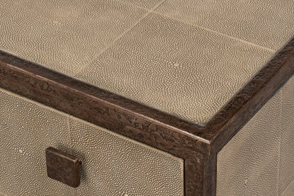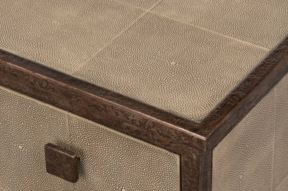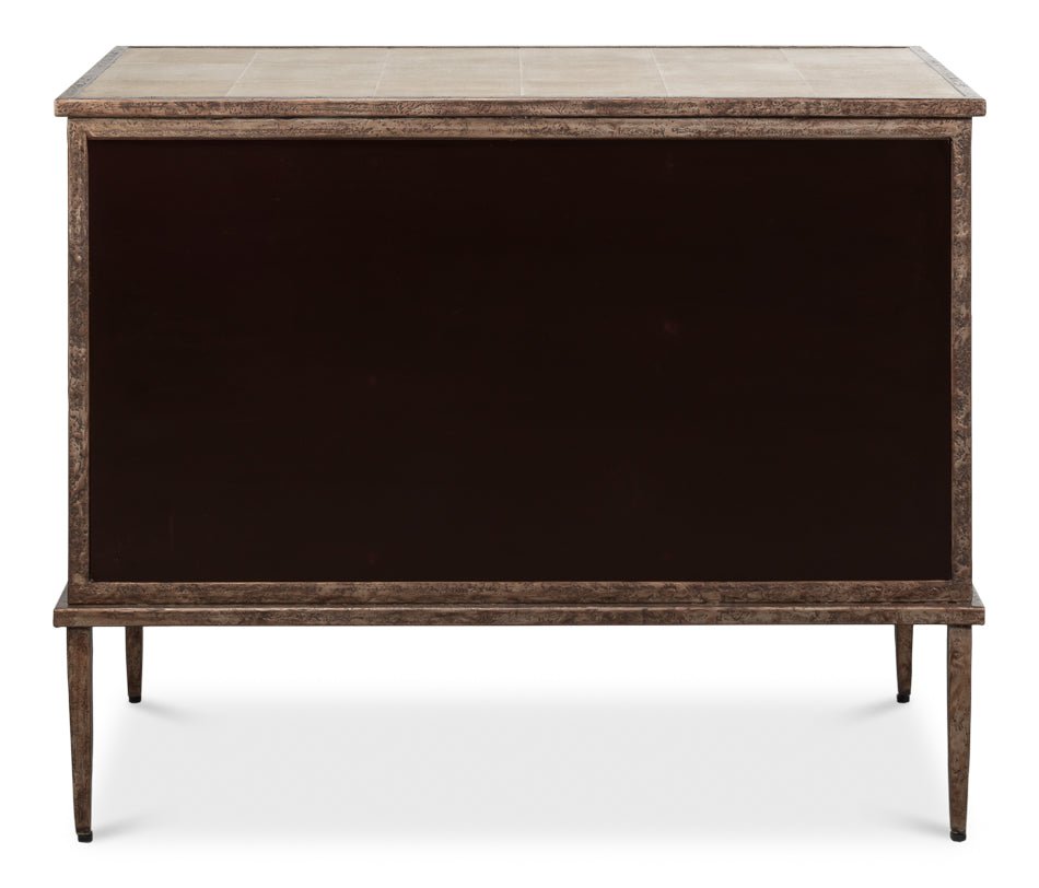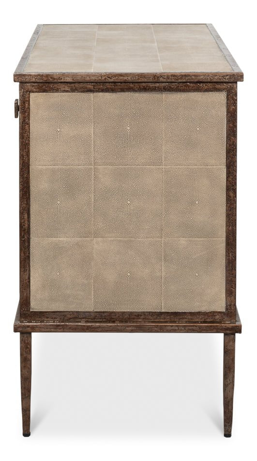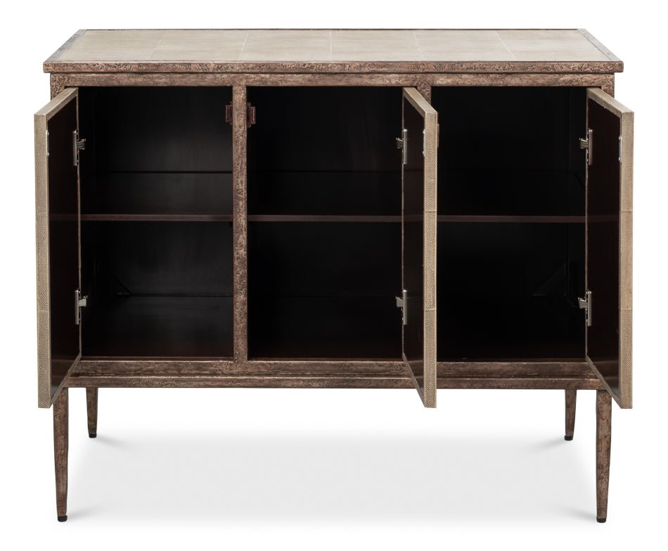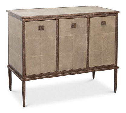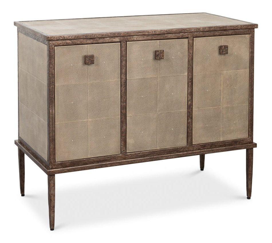 Add a touch of elegance to your home with the antique charcoal grey shagreen leather-wrapped cabinet. This piece is framed and accented in antique brass frosted metal, providing a sophisticated look that suits any room in your house. With its three hinged doors, it offers ample storage space for your essentials, ensuring your living area remains tidy and stylish. The cabinet's adaptable size makes it a versatile addition, blending style and functionality seamlessly.