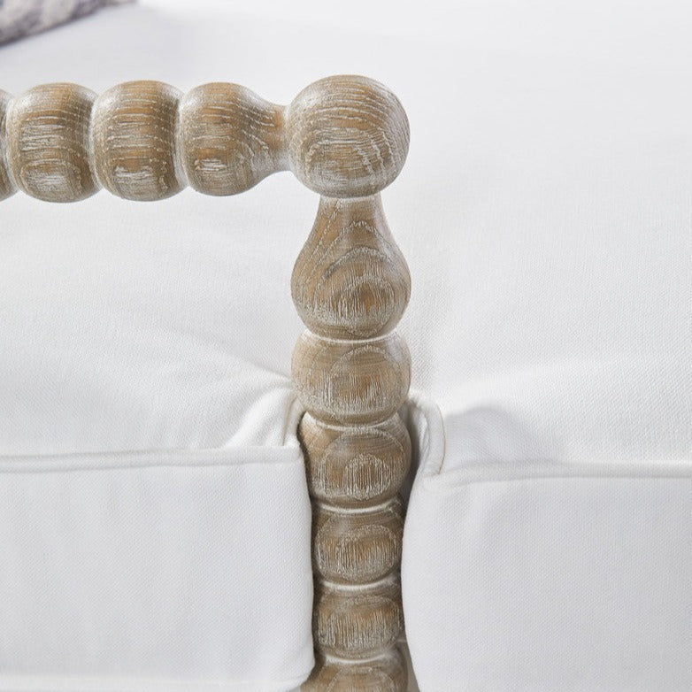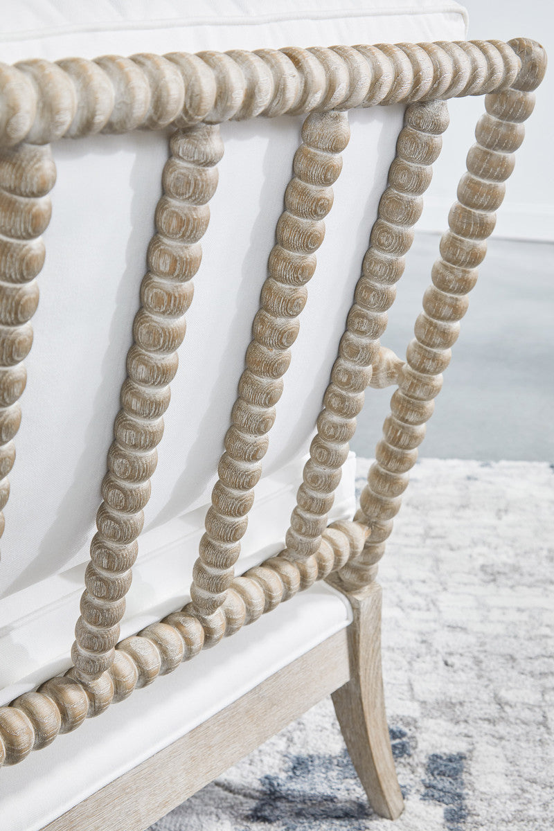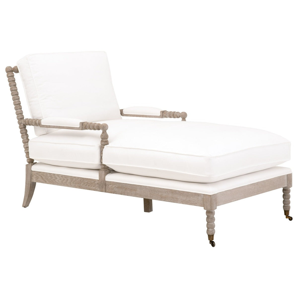 Transform any room into a luxurious and inviting space with the LiveSmart White Performance Fabric Chaise Lounge. This stunning piece not only adds extra seating, but also serves as a captivating focal point. Its high-quality polyester/down blend cushions and sturdy solid wood frame offer both support and comfort, while the sophisticated white upholstery and natural gray oak bring a dynamic touch to any living room. Elevate the look and feel of any space with this elegant chaise lounge, complete with a beautifully carved spool design on the back and armrests. Curl up, unwind, and indulge in relaxation on this luxurious chair, perfect for watching your favorite show, reading a book, or spending time with loved ones.