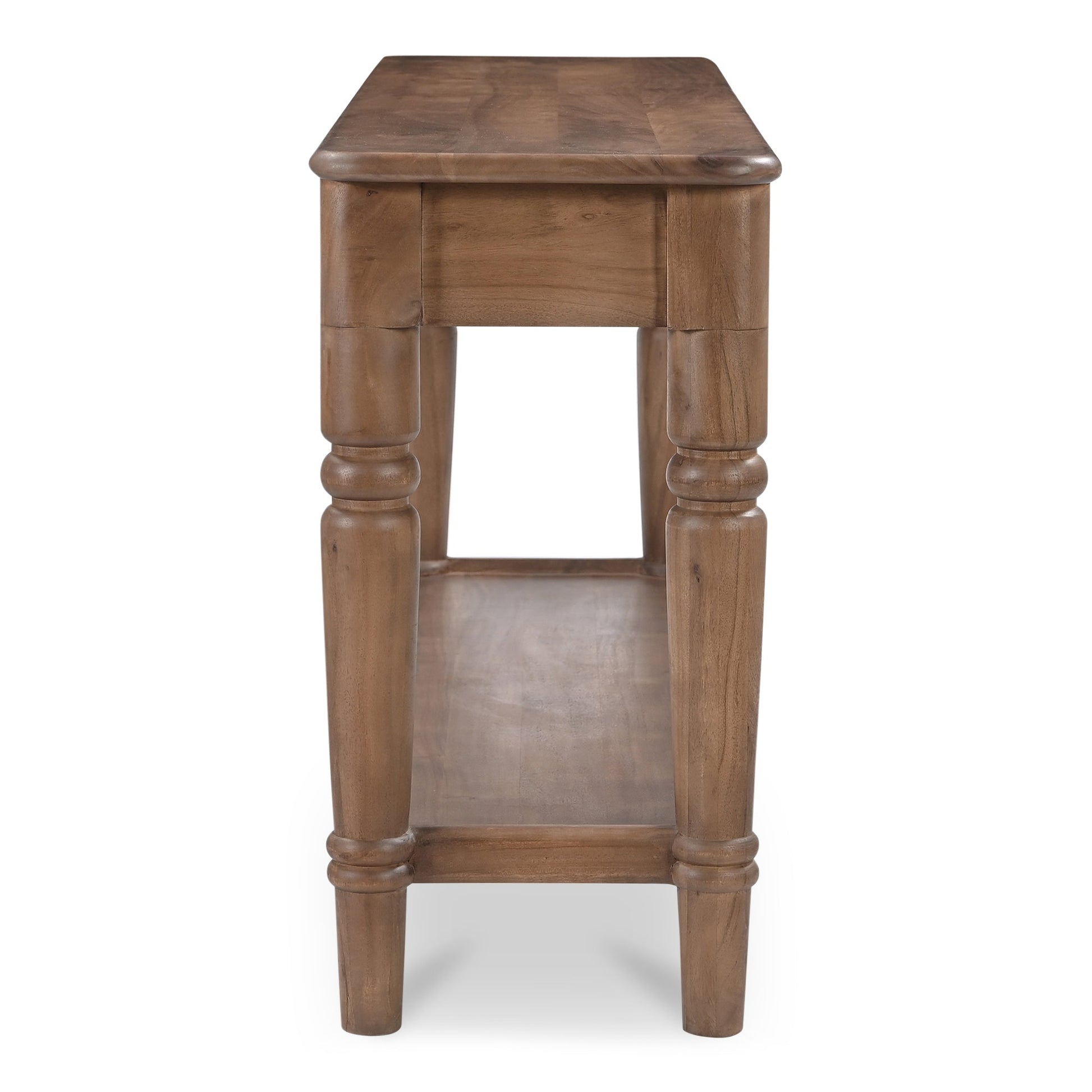 The Russet Console Table brings together classic charm and everyday function with its high-quality Acacia wood construction and mid-tone brown finish. Turned legs and intricate carved details highlight its traditional styling, making it a graceful addition to transitional or classic interiors. The overhanging tabletop offers room for decorative accents, while the shelf below provides space for additional storage or display. Designed with practicality in mind, this console table includes two spacious horizontal drawers ideal for storing daily essentials and keeping your area organized. Its sturdy build ensures long-lasting use, and the thoughtful craftsmanship makes it suitable for entryways, living rooms, or dining areas. The Russet Console Table offers both visual appeal and versatile functionality for your home.