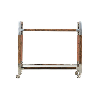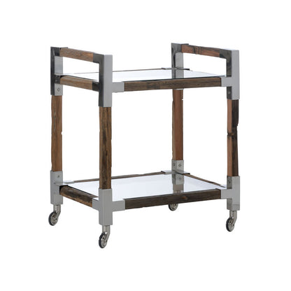 Move the party effortlessly with this rustic glam bar cart. Crafted with reclaimed natural rough wood, it exudes charm and character. The polished nickel corner brackets add a striking contrast, enhancing its visual appeal. Its two glass shelves are perfect for holding bottles, glassware, and decorative accents, making it a versatile piece for any room. The bar cart's design is a blend of rustic charm and modern flair, fitting seamlessly into any kitchen, home bar, or entertaining area. Given its natural materials, each piece is unique, with varying color, knot pattern, and grain designs. The bar cart's functionality is as impressive as its style.