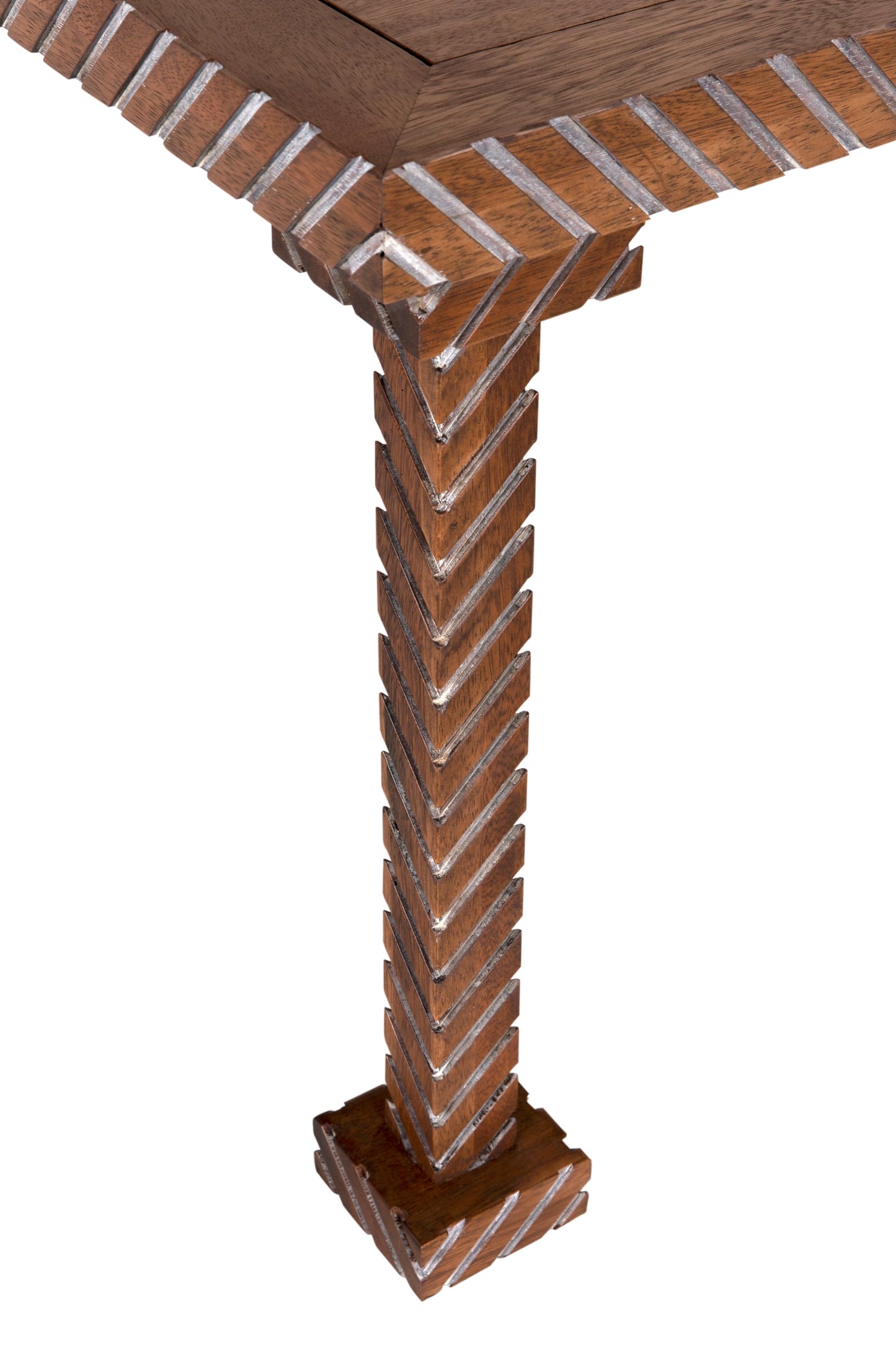 Crafted from premium Walnut wood and veneer, the Ryder Table Desk is designed to offer both elegance and durability. Its Dark Walnut finish brings out the natural beauty of the wood's grain, adding a touch of warmth and sophistication to any room. This desk serves as a versatile piece, perfect for both home and office settings. Its robust construction ensures long-lasting use, making it a reliable choice for those seeking quality and style. The Ryder Table Desk features a spacious rectangular surface, providing ample room for work, study, or creative projects. Its decorative herringbone pattern on the legs adds a unique touch, setting it apart from typical desks.