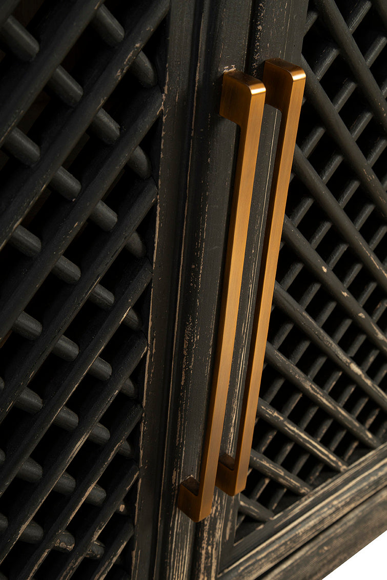The Sabre Sideboard combines timeless craftsmanship with a modern touch, making it a standout piece in any home. Handcrafted from reclaimed pine, its distressed black finish highlights the natural grain and rustic character of the wood. This sideboard is not just about looks; it's about functionality too. With paneled cabinet doors featuring open latticework, it brings a hint of British colonial style to your space. The modern gold hand pulls add a touch of elegance, contrasting beautifully with the weathered finish.