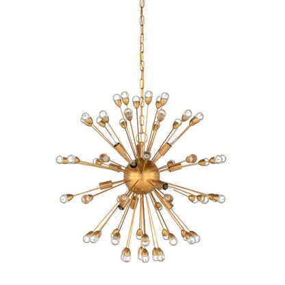 Transform any space into a dazzling setting with this stunning chandelier. The Saturn Chandelier - Gold features a luxurious antique gold leaf finish that brings a touch of classic elegance to your home. Its unique design, with clear crystal spheres radiating from a central orb, creates a beautiful orbital glow that illuminates any room. The chandelier's twelve lights offer ample brightness, making it perfect for dining rooms, living spaces, or grand entryways. The Saturn Chandelier is not just about beauty; it is also about versatility. With its sputnik-inspired design and multiple arms extending from a circular center, it adds a modern twist to traditional lighting.