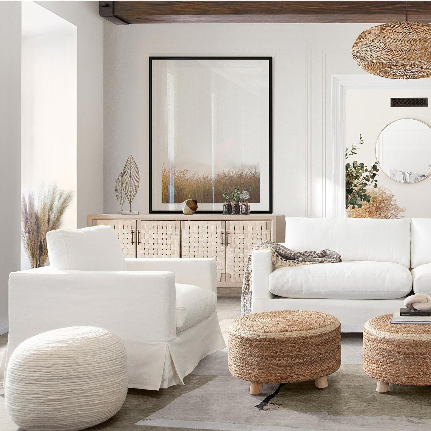 - Finish: White Linen Removeable Slip Cover, Spot Clean or Dry Clean Only with Feather Down Seating.