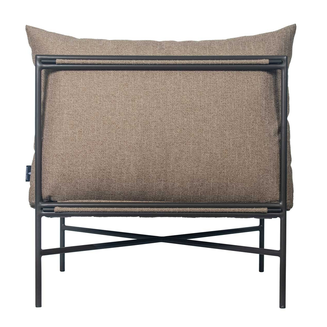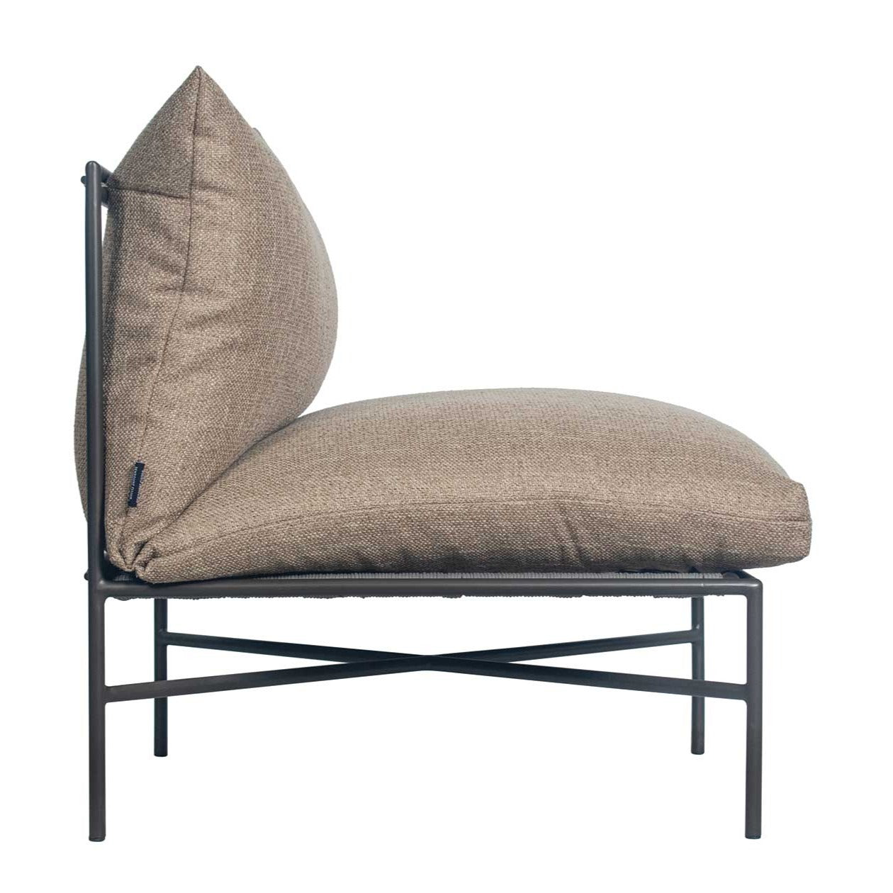 - Javanese Nut Brown powder-coated aluminum frame, nylon glides; crushed fast dry foam cushion with Cardamom Taupe spun polyester zippered cover