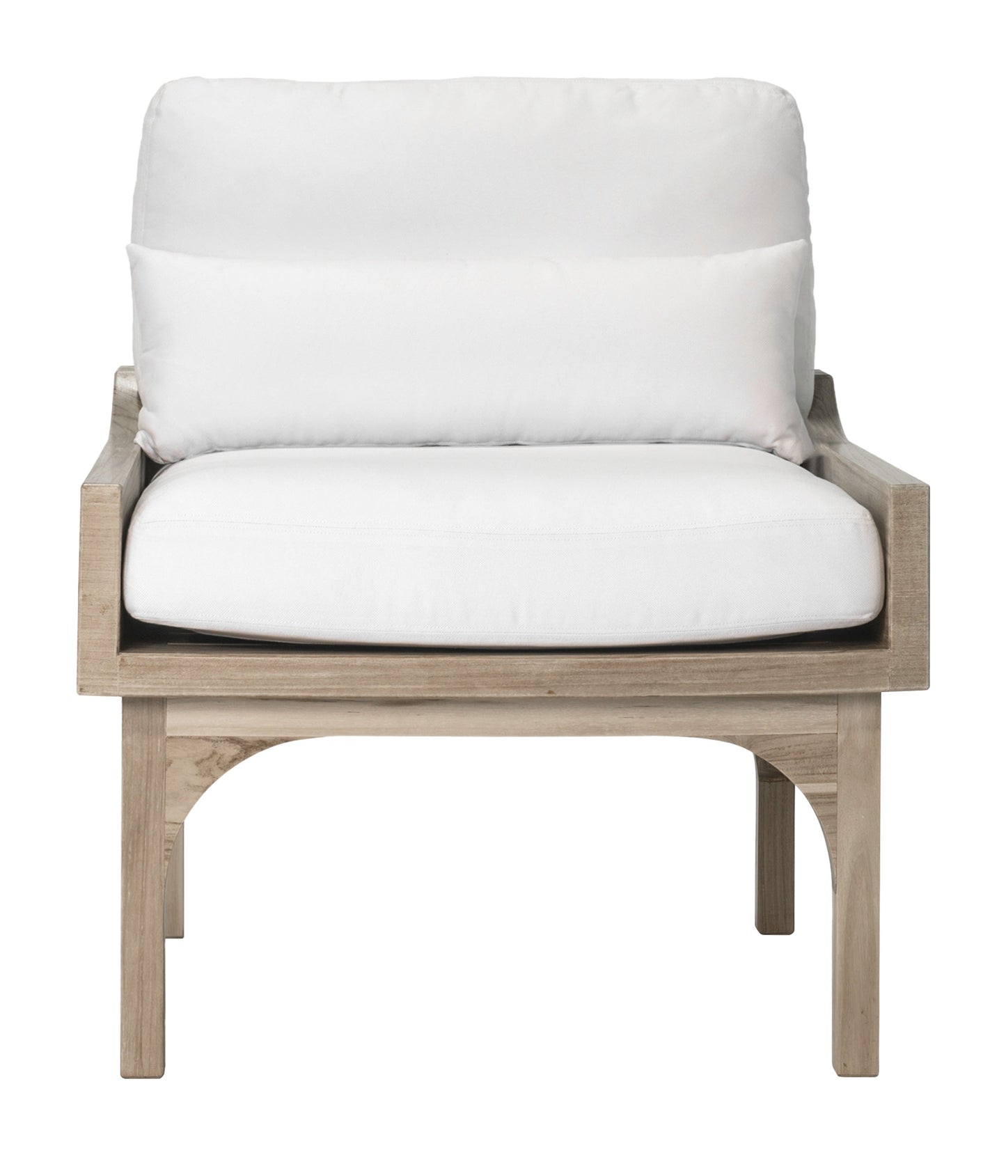 Crafted with care and attention to detail, the Serenique Lounge Chair boasts artisanal mastery with its congruent teak grain design. The seamless joinery and expert fabrication highlight the chair's elegant design. It's equipped with custom Quick-Dry foam cushions for comfort, ensuring you can enjoy it in any weather. The chair comes with a seat cushion, a back pillow, and a lumbar pillow, all made from durable Agora Panama Blanco fabric. Whether you're enjoying a good book or just taking a moment to breathe, this chair provides the ideal space.