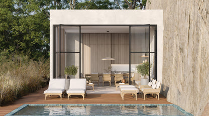 Serenique offers a blend of tranquility and elegance, drawing inspiration from Japandi design, which beautifully merges Japanese and Scandinavian aesthetics. This pool chaise set, made from sun-bleached teak, exudes minimalist elegance with its clean lines and seamless joinery. The bleached wheat tones coupled with the natural materials create a calming atmosphere that invites relaxation and introspection. Designed for modern indoor and outdoor living, Serenique embodies simplicity, functionality, and natural beauty, encouraging moments of quiet reflection and effortless elegance.