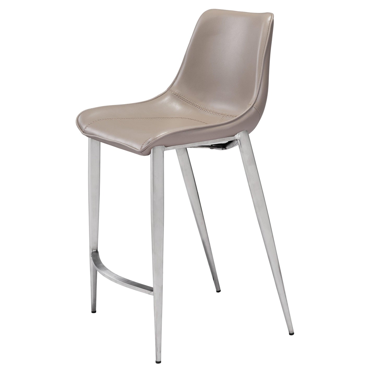 Increase the value of your dining experience with the Magnus Counter Chair! Embrace the challenge of this sleek chair, featuring a curved, faux leather seat for bold style and comfort. Its brushed stainless steel legs and durable plastic feet are perfect for daily adventures. With a weight capacity of 280 lbs, this set of 2 is ideal for any bar or counter. Add a touch of daring to your everyday dining with this stylish counter chair. The slim design perfectly complements a bar setting, while the Grey faux leather and striking stitching provide ultimate comfort. The brushed stainless steel legs and protective plastic feet ensure longevity and prevent floor damage.