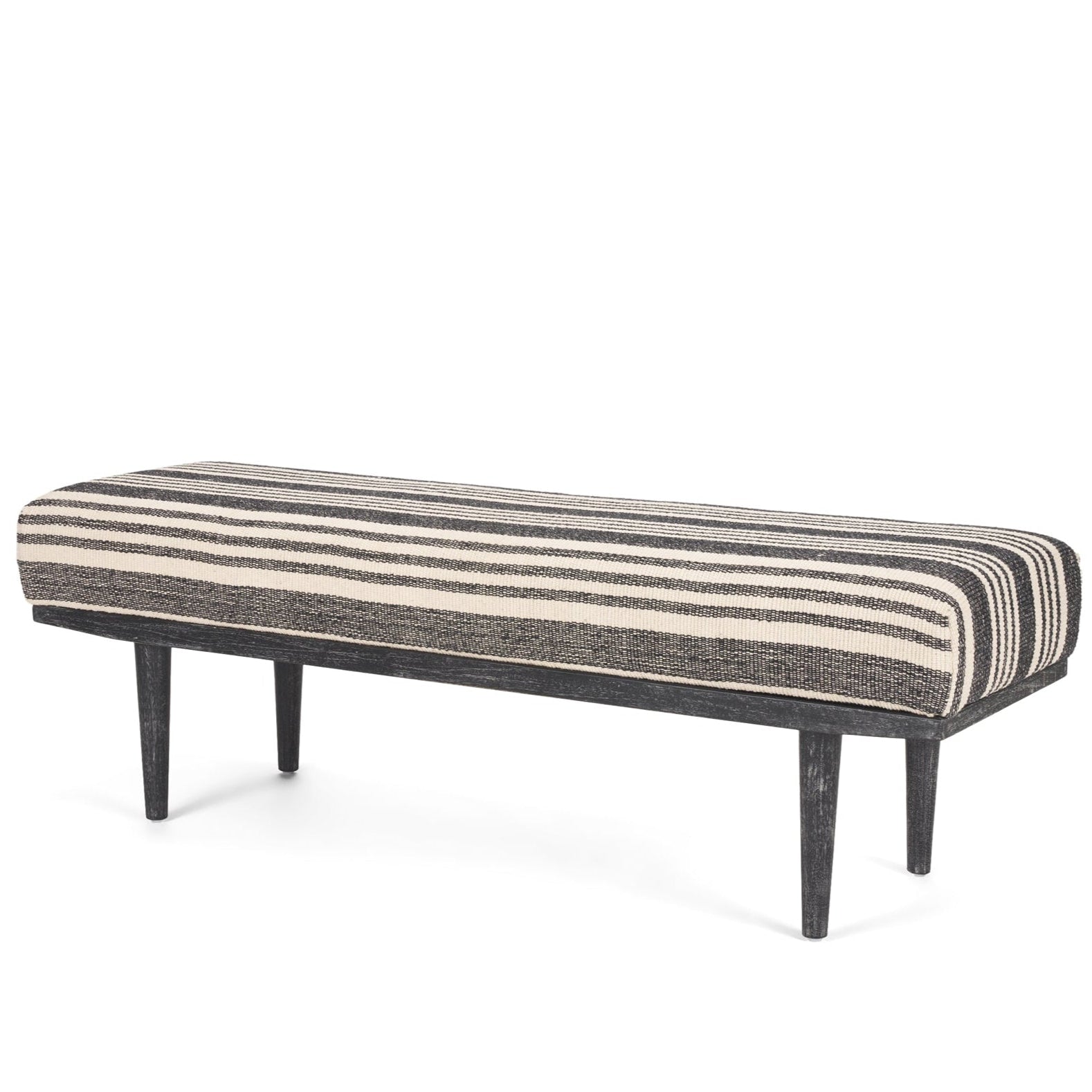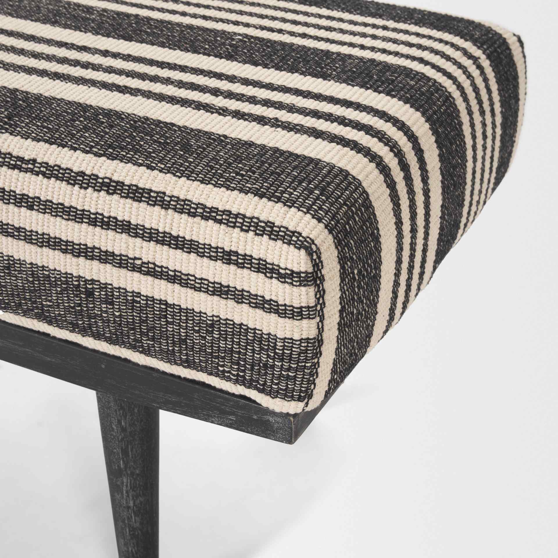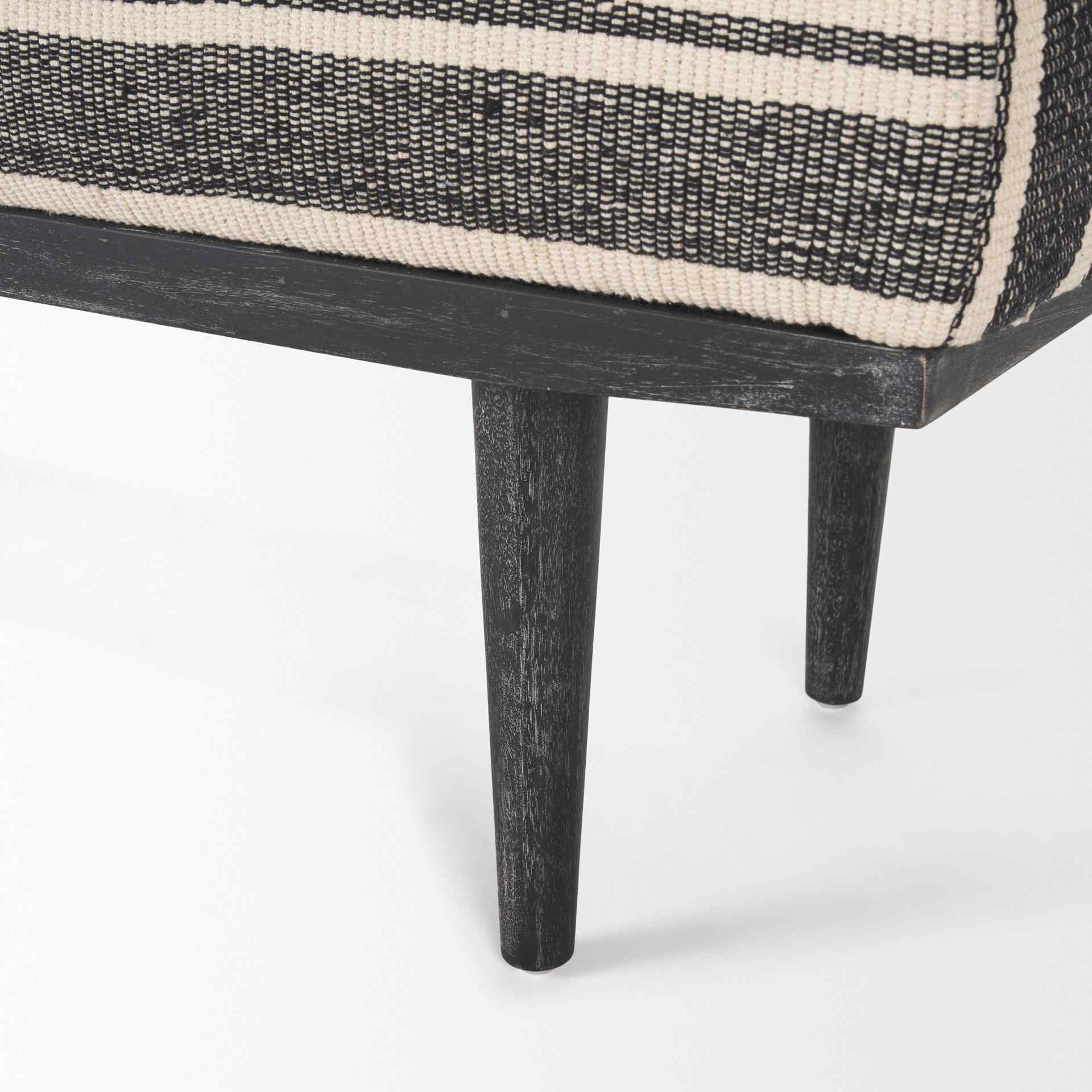 The Shae Bench brings a sleek touch to any room with its modern design. Upholstered in high-quality black and white fabric, this bench offers a soft and inviting seat. The luxurious padding ensures comfort, making it a perfect spot for relaxation. The solid wood frame is enhanced with a black stain and gentle white wash, highlighting the natural grain pattern. This combination of elements gives the bench a stylish and contemporary look that stands out in any setting.
