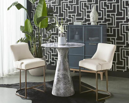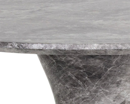 This round counter table offers a stylish and functional addition to any outdoor space. It features a well-defined tapered base, giving it a unique and modern look. The grey faux marble finish on wood and concrete materials adds a touch of elegance and sophistication. Perfect for hosting gatherings or enjoying a quiet meal, this table blends seamlessly with various outdoor décors.